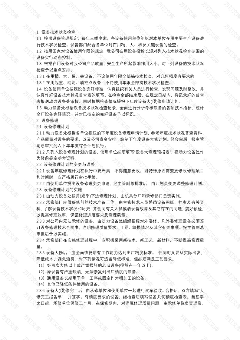 设备技术状态检查1.1按照设备管理规定,每年三季度末,各设备使用单位组织对本单位在用主要生产设备进行技术状况检查。设备部门配合各单位对在用精、大、稀及关键设备的检查。1.2按照国家对设备使用年限的规定,我公司在用设备役龄长短对列入技术状况检查范围的设备实行动态控制。1.3根据在用设备对我公司产品质量、安全生产所起影响作用大小,对下列设备的技术状况检查予以重点安排。1.31在用精、大、稀、关设备,不论使用年限全部搞技术检查,对几何精度有要求的132在用起重、动能、质控点设备,不论使用年限全部搞技术状况检查。1,4设备使用单位按照设备完好标准,认真组织有关人员进行检查,发现问题及时整改,并认真作好设备技术状况普查表的填写。在检查全部结束后,在规定日期内,将记录好的普查表报送动力设备处审核。同时根据检查情况提报下年度设备大(项)修申请计划。1.5动力设备处根据设备技术状况检查记录,全面进行分析考核设备的各项技术指标,统计全厂设备完好情况,并对已核定的完好设备予以标识。2,设备修理2.1设备修理计划21.1动力设备处根据各单位报送的下年度设备修理申请计划,参考年度技术状况普查资料产品质量对设备的要求,以及公司资金安排,编制下年度设备大修计划。经会审后,报主管副总审批列入下年年度综合计划执行。21.2凡列入设备修理计划的设备,使用单位必须填写"设备大修理预报表”,报动力设备处作为修前鉴定参考资料。2.2设备修理计划的变更与调整2.21设备年度修理计划在执行中要严肃,不得随意更改。因特殊原因需变更修改修理项目和时间时,应严格履行审批手续2.2.2由使用单位提出设备修理变更申请,经主管副总批准后,由计划员变更调整修理计划。2.3设备修理计划的实施2.3,1由动力设备处按月(或季)下达修理计划。由机具分厂和承修部门负责实施。232承修部门应做好修前的技术准备工作,由主修技术人员熟悉设备图纸、档案及有关资料,了解设备技术状况和历史,并会同有关人员摸清设备故障及其它存在的问题,搞好预检以提高修理效率,保证修理进度要求及修理质量。233对公司内无法承修的设备,由动力设备处组织招标对外委修。凡外委修理设备必须签订设备修理技术合同书,注明修理质量要求、工期、缺损情况及其它有关事项。报主管副总审批后予以实施23.4承修部门在实施修理过程中,应积极采用新技术、新工艺、新材料,不断提高修理质23.5设备大修后,应全面恢复原有工作能力达到出厂精度标准。但同时又要从实际出发降低成本、避免浪费。对下列情况可适当降低标准,但必须满足工艺要求(1)经两次大修以上或严重损坏的老旧设备(役龄在十年以上)。(2)原设备有严重缺陷,无法修复到出厂精度的设备。(3)通用设备长期用于单一工序或固定作为粗加工的设备。(4)其他已降低条件使用的设备。23.6设备大(项)修完工后,由承修单位和使用单位一起进行试车验收。合格后,双方填写"大修完工报告单",并签字。有精度要求的设备,经检查后填写设备几何精度检查表。自签字之日起承修单位保修三个月。在保修期内,对确属修理质量问题由承修单位负责返修并作记录附在完工报告单后。对返修问题,保修期顺延。2.3.7设备修理完工验收后,承修部门要做好修理资料的记录归档工作填写更换明细表及修改记录等技术资料,与完工报告单一起交动力设备处存入设备档案3设备检修与维修管理办法31.目的建立设备维修管理体系,规范设备维修的目标、内容、方式与程序,保证设备维修活动有计划、高效率地进行,最大限度地满足生产运行的需要3.2.设备维修目标3.2.1提高设备可靠性系数:通过对设备的维护保养、巡检监测、适时维修、更新改造等活动,延长设备使用寿命,减少或避免设备故障/事故的发生,最大限度地提高设备可靠性系32.2降低维修成本:通过预防性维修活动及计算机维修管理系统,对设备进行恰当的、时的维修,以合理控制人力、材料、工器具等费用要素。3.3设备维修的模式实行全员参与的预防预知维修体系,以巡检、计划、日程表、执行、改善提高的程序开展维修活动4,1动力设备处是公司机械设备维护检修的监管部门,负责监管各车间设备维护维修、实施检修管理4.2生产车间负责对所属设备有计划地日常保养及维修工作。3.5.巡检5.1设备巡检是指设备专业技术人员及设备使用部门的岗位巡检工,按一定的路线、周期频率、内容、方法与手段,对运行或停机中的设备进行检查记录、维护保养、问题处理等。5.2设备部门的巡检:设备处设巡检技术员,按照设备处制定《设备巡检标准》,利用设备状态监测与故障分析仪器及无损检测技术,对设备进行运行跟踪及趋势分析,提出维护和维修以设备状况调查报表的形式实现计划维修5.3车间使用部门的巡检:岗位巡检工运用眼看、手模、耳听、鼻嗅并利用一些简单的仪器等方法,结合现场设备的仪表和信号数据,对设备进行检查与维护,及时处理简单的设备问题,处理不了的问题以维修申请单的形式向设备处提出维修申请。5.4巡检记录和报告巡检技术员、岗位巡检工、设备操作工必须及时认真地填写巡检记录、交接班记录5.5设备停机检修时,岗位巡检工、设备操作工应参与维修,比较复杂的故障巡检技术员应现场进一步分析或确认故障原因,提