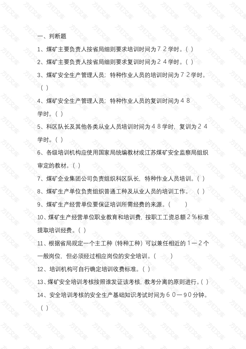 判断题1、煤矿主要负责人按省局细则要求培训时间为72学时。煤矿主要负责人按省局细则要求复训时间为24学时。3、煤矿安全生产管理人员;特种作业人员的培训时间为72学时。4、煤矿安全生产管理人员;特种作业人员的复训时间为48学时。()5、科区队长及其他各类从业人员培训时间为48学时,复训为24学时。()6、各级培训机构应使用国家局统编教材或江苏煤矿安全监察局组织审定的教材。()7、煤矿企业集团公司负责组织科区队长,特种作业人员培训。8、煤矿生产单位负责组织普通工种及从业人员的培训工作。9、煤矿生产经营单位要保证培训所需经费的来源。(10、煤矿生产经营单位职业教育和培训费,按职工工资总额2%标准提取培训经费。()11、根据省局规定一个主工种(特种工种)可以兼任相近的1一2个般岗位,但必须经过相应岗位的安全培训。(12、培训机构可自行确定培训收费标准。13、煤矿安全培训考核按照谁发证该考核,教考分离的原则进行。()14、安全培训考核的安全生产基础知识考试时间为60一90分钟文15安全培训考核的技能考核成绩评定为优良,合格,不合格。16、考试和考核均不及格(不合格)者,不允许进行补考。(17、对少数工作满20年,实践经验丰富的文盲老工人,培训考核可采取面试和实际操作考核相结合办法,确定其是否合18、煤矿安全资格证书有效期为4年,每2年由发证单位主管部门复审一次。()19、特种作业操作证有效期为6年,每2年由发证单位主管部门复审次。()20、特种作业人员连续从事本工种10年及以上的,可4年进行一次复审,证书复审前应参加复训和考核。()21、各种证书应在复审时间至复审到期前2个月内进行不按规定办理复审的,按无效证件处理。()22、煤矿各类从业人员的证书复审不合格的,须重新参加培训。23、证书有效期到期前2个月内必须重新培训,领取新证书。(24、煤矿主要负责人未取得安全工作资格证书而任职的,按每一无证人员处以1一2万元罚款。()25、安全生产管理人员,未取得安全工作资格证书而任职的,按每无证人员处以5000一10000元罚款。()26、特种作业人员未按规定经专门的安全技术培训,未取得特种作业操作证书而上岗作业的,按每一无证人员处以20005000元罚款。27煤矿其他从业人员上岗作业前,煤矿单位未对其安全教育培训未取得安全工作资格证书而上岗的,按每一无证人员处以10002000元罚款。()28、煤矿从人员在采用新工艺,新技术、新材料或使用新设备前,也必须进行专门的安全技术培训工作,取得相应证书后,方可上岗作业。29、培训机构取得资格后,可擅自设立分支机构。30、上一级培训机构可承担下一级培训机构的培训任务。31、培训机构可超出培训资格范围进行培训。()32、教学计划与教学大纲是相同的概念。()33、培训教材的使用是指专兼职教师而言的,参与培训的人员可不发给教材。()34、三、四级培训机构的专职教师不少于3人以上。35、教学计划通常称为课程计划。()36、教学计划通常称为课程计划。()37、没有经过专门培训而取得安培教师资格证书的人员仍可进行安全培训的理论教学。()38、安全培训专业工种的多样性是培训的一个显著特点。(39、教学目标一般针对某学科或某门课程而言,即通过某学科的教学活动;使受教育者身心方面应起的变化。(文40教学大纲是与教学计划配套的课程文件。(,41、煤矿企业是安全生产教育和培训的责任主体。煤矿矿企业主要负