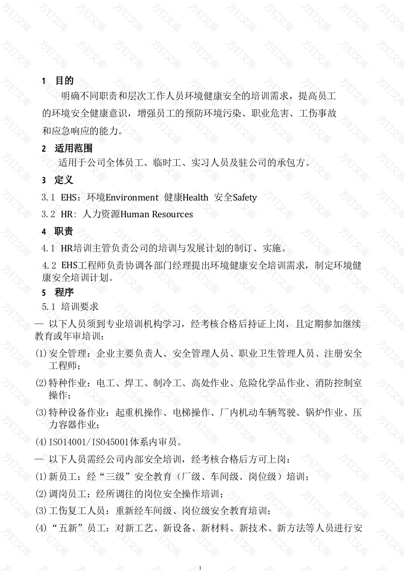 万目的明确不同职责和层次工作人员环境健康安全的培训需求,提高员工的环境安全健康意识,增强员工的预防环境污染、职业危害、工伤事故和应急响应的能力。2适用范围适用于公司全体员工、临时工、实习人员及驻公司的承包方。3定义3.1 EHS:环境Environment健康Health安全Safety3.2HR:人力资源Human Resources万4职责4.1HR培训主管负责公司的培训与发展计划的制订、实施。4.2EHS工程师负责协调各部门经理提出环境健康安全培训需求,制定环境健康安全培训计划。5程序5.1培训要求以下人员须到专业培训机构学习,经考核合格后持证上岗,且定期参加继续教育或年审培训:(1)安全管理:企业主要负责人、安全管理人员、职业卫生管理人员、注册安全(2)特种作业:电工、焊工、制冷工、高处作业、危险化学品作业、消防控制室(③)特种设备作业:起重机操作、电梯操作、厂内机动车辆驾驶、锅炉作业、压力容器作业:(4)IS014001/IS045001体系内审员。以下人员需经公司内部安全培训,经考核合格后方可上岗:(1)新员工:经“三级”安全教育(厂级、车间级、岗位级)培训:万(2)调岗员工:经所调往的岗位安全操作培训:(3)工伤复工人员:重新经车间级、岗位级安全教育培训:(4)“五新”员工:对新工艺、新设备、新材料、新技术、新方法等人员进行安方全培训。专项(其它)安全教育培训:(1)机械安全知识一操作、维修机械设备的人员;(2)电气安全知识-一机电维修人员、电工:(3)消防安全知识-全体员工:(4)危险化学品安全知识-一化学品保管、搬运、使用人员:(⑤)工伤事故案例一车间员工;(6)EHS法律法规知识--全体员工:(7)安全管理知识一中高层管理人员:(⑧)班组安全管理知识一班组长;(9)外来人员安全需知-一外来施工商、供货商、(10)叉车驾驶安全知识一叉车驾驶员:(11)搬运安全知识一搬运工;职业危害与劳动保护知识一职业危害岗位人员:(13)应急救护知识一应急救护人员:(14)交通安全知识一全体员工:(15)环保知识一全体员工;方(16)其它安全知识(部门识别)相关人员。5.2培训流程5.2.1EHS工程师每年一月份向各部门下发安全培训需求统计表,汇总、制定年度安全培训计划,经EHS总监批准后,按以下流程执行:方2方订方培训需求分析方向各部门下发培训需求统计表培训计划制定汇总,制定年度培训计划,报批外聘讲师或外出培训培训教材编写录制视频:编制PPT培训方法确定PPT讲解:视频:讨论会:知识竞培训实施发布通知,确定时间、地点,签到培训效果评估收集培训效果评估表,总结、改进方文5.2.2安全管理人员取证培训、继续教育由HS执行小组联络培训机构,按外部培训流程申请,经批准后进行,费用由年度安全经费预算中支出。5.2.3特种作业、特种设备作业取证培训、年审培训由ES执行小组联络培训机构,按外部培训流程申请,经批准后进行,费用由年度安全经费预算中支出。5.2.4调岗人员、工伤复工人员、“五新”人员由所在部门进行安全教育培训,并保留培训记录。5.2.5专项(其它)安全教育培训由部门提出,并安排好培训时间、地点、参训人员后联系HS执行小组,由EHS执行小组编制培训教材,派员授课。如有需要,S执行小组也可外聘讲师授课,按外部培训流程申请,经批准后进行,费用由年度安全经费预算中支出。5.2.6“三级”(厂级、车间级、岗位级)安全教育培训按以下进行:5.2.6.1新员工是指新进厂的管理人员、技术人员、生产工人、劳务派遣人员、临时工、实习人员等。