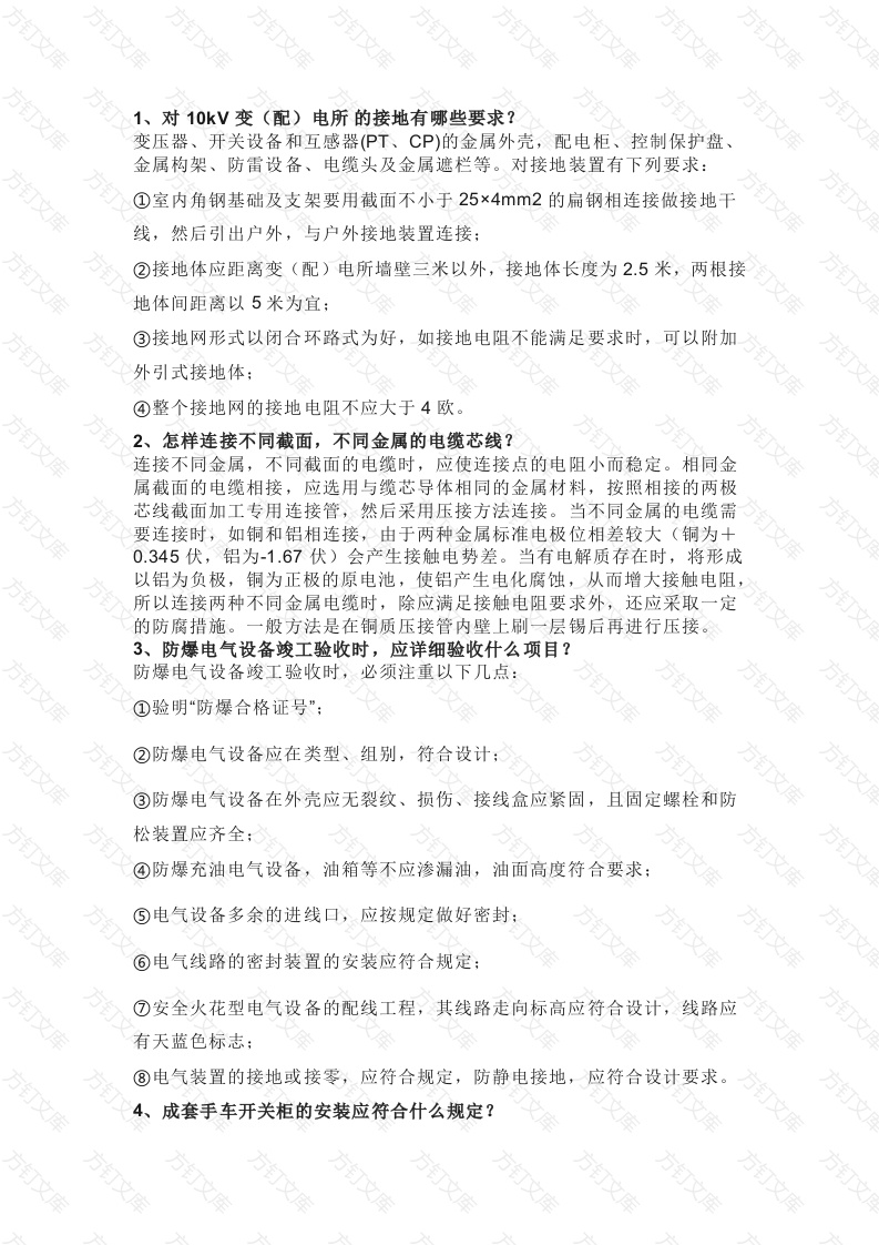 1、对10kV变(配)电所的接地有哪些要求?变压器、开关设备和互感器(PT、CP)的金属外壳,配电柜、控制保护盘、金属构架、防雷设备、电缆头及金属遮栏等。对接地装置有下列要求:①室内角钢基础及支架要用截面不小于25×4mm2的扁钢相连接做接地干线,然后引出户外,与户外接地装置连接:②接地体应距离变(配)电所墙壁三米以外,接地体长度为2.5米,两根接地体间距离以5米为宜:③接地网形式以闭合环路式为好,如接地电阻不能满足要求时,可以附加外引式接地体:④整个接地网的接地电阻不应大于4欧。2、怎样连接不同截面,不同金属的电缆芯线?连接不同金属,不同截面的电缆时,应使连接点的电阻小而稳定。相同金属截面的电缆相接,应选用与缆芯导体相同的金属材料,按照相接的两极芯线截面加工专用连接管,然后采用压接方法连接。当不同金属的电缆需要连接时,如铜和铝相连接,由于两种金属标准电极位相差较大(铜为+0.345伏,铝为-1.67伏)会产生接触电势差。当有电解质存在时,将形成以铝为负极,铜为正极的原电池,使铝产生电化腐蚀,从而增大接触电阻,所以连接两种不同金属电缆时,除应满足接触电阻要求外,还应采取一定的防腐措施。一般方法是在铜质压接管内壁上刷一层锡后再进行压接。3、防爆电气设备竣工验收时,应详细验收什么项目?防爆电气设备竣工验收时,必须注重以下几点:①验明“防爆合格证号”:②防爆电气设备应在类型、组别,符合设计:③防爆电气设备在外壳应无裂纹、损伤、接线盒应紧固,且固定螺栓和防松装置应齐全:④防爆充油电气设备,油箱等不应渗漏油,油面高度符合要求:⑤电气设备多余的进线口,应按规定做好密封:⑥电气线路的密封装置的安装应符合规定:⑦安全火花型电气设备的配线工程,其线路走向标高应符合设计,线路应有天蓝色标志:⑧电气装置的接地或接零,应符合规定,防静电接地,应符合设计要求。4、成套手车开关柜的安装应符合什么规定?成套手车开关柜的安装应该符合以下规定:①、动、静触头中心一致,接触紧密,手在推入工作位置,符合产品要求:③、二次回路辅助开关的切换接点应动作准确,接触可靠:④、机械闭锁装置应动作准确可靠:⑤、柜内照明齐全:⑥、安全隔板开关灵活,随手车柜的进出而相应动作:⑦、柜内控制电缆的位置不应妨碍手车进出,并牢牢固定:⑧、手车与柜体间的接地触头,应接触紧密,手车推入柜内时,其接地触头应比主触头早接通拉出时相反。5、配电盘(柜)安装前的准备工作?①、配电盘的安装应在室内粉刷完毕,基础达到要求强度,清扫干净后进②、配电盘在安装前应进行检查验收,查核配电盘的型号,盘内的电器元件是否符合要求,有无机械损伤:③、基础型钢应配合土建下好埋件,基础型钢顶面应高出地平面10-20m,同一场所同一水平面上的基础型钢的水平误差不应超过长度的1/1000最大水平误差不应超过5mm,小车式配电柜的基础型钢应与屋内地面相平。6、怎样修理异步电动机转轴的一般故障?①、转弯曲:将转子取出并根据具体情况加以校正:②、轴的铁芯档磨损:则应在铁芯两端的轴上开一个环开槽,再放入两个弧形键并与轴焊在一起:③、轴颈磨损:一般可在轴颈处落花处理。如果磨损严重,也可在轴颈处用电焊堆积一层,再用车床加工至要求尺寸:④、轴裂纹:较严重应更换处理。7、在那些情况下,操作前,必须进行核相?①、切新安装、改装与系统有联络关系的设备和线路:②、③变压器检修、折装电缆引线接头或调整分接开关:万系统电缆重做接线盒、电缆头、移动电缆及其它可能变换相别的作业⑤、PT二次回路接有同期回路,当检修PT或变动二次回路须做假同期试验。8、PT运行中为什么二次不允许短路?PT正常运行时,由于二次负载是一些仪表和继电器的电压线圈阻抗大,基本上相当于变压器的空载状态,互感器本身通过的电流很小,它的大小决定于次负载阻抗的大小,由于PT本身阻抗小,容量又不大,当互感器二次发生短路,二次电流很大,二次保险熔断影响到仪表的正确指示和保护的正常工作,当保险容量选择不当,二次发生短路保险不能熔断时,则PT极易被烧坏。9、CT运行中二次回路为什么不允许开路?CT经常用于大电流条件下,同时由于CT二次回路所串联的仪表和继电装置等电流线圈阻抗很小,基本上呈短路状态,所以CT正常运行时,二次电压很低,如果CT二次回路断线,则CT铁芯严重饱和磁通密度高达1500高斯以上,由于二次线圈的匝数比一次线圈的匝数多很多倍,于是在二次线圈的两端感应出比原来大很多倍的高电压,这种高电压对二次回路中所有的电气设备以及工作人员的安全将造成很大危险,同时由于CT二次线圈开路后将使铁芯磁通饱和造成过热而有可能烧毁,再者铁芯中产生剩磁会增大互感器误差,所以CT二次不准开路。10、什么是电流保护,动作原理如何?当线路发生短路时,重要特征之一是线路中的电流急剧增大,当电流流过某一预定值时,反应于电流升高而动作的保护装置叫过电流保护,过电流保护的动作电流是按最大负荷电流来考虑的,其选择是靠阶梯形的时限来配合的。11、什么叫速断保护,它有何特点?过电流保护启动电流是按照大于最大负荷电流的原则整定的,为了保证选择性,采取了逐级增加的阶梯形时限的特征,这样以来靠近电源端的保护装置动作时限将很长,这在许多情况下