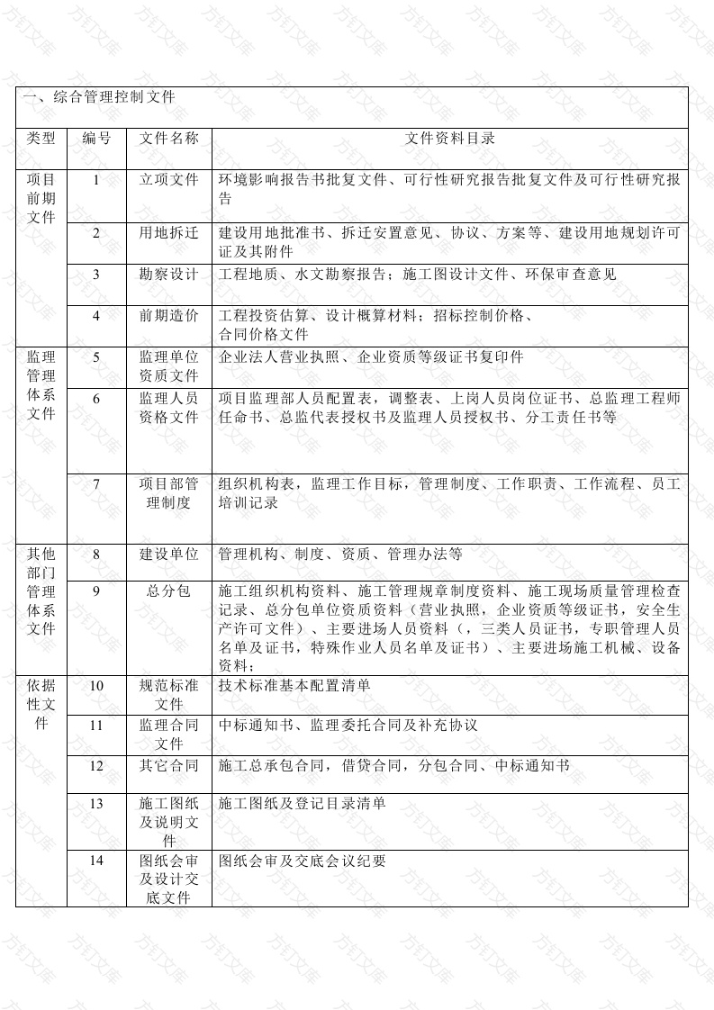 方综合管理控制文件类型编号文件名称文件资料目录项目1立项文件环境影响报告书批复文件、可行性研究报告批复文件及可行性研究报前期告文件用地拆迁建设用地批准书、拆迁安置意见、协议、方案等、建设用地规划许可证及其附件3勘察设计工程地质、水文勘察报告:施工图设计文件、环保审查意见前期造价工程投资估算、设计概算材料:招标控制价格、合同价格文件监理5监理单位企业法人营业执照、企业资质等级证书复印件管理资质文件体系6监理人员项目监理部人员配置表,调整表、上岗人员岗位证书、总监理工程师文件资格文件任命书、总监代表授权书及监理人员授权书、分工责任书等项目部管组织机构表,监理工作目标,管理制度、工作职责、工作流程、员工理制度培训记录其他8建设单位管理机构、制度、资质、管理办法等部门管理9总分包施工组织机构资料、施工管理规章制度资料、施工现场质量管理检查体系记录、总分包单位资质资料(营业执照,企业资质等级证书,安全生文件产许可文件)、主要进场人员资料(,三类人员证书,专职管理人员名单及证书,特殊作业人员名单及证书)、主要进场施工机械、设备依据10规范标准技术标准基本配置清单性文文件件11监理合同中标通知书、监理委托合同及补充协议文件12其它合同施工总承包合同,借贷合同,分包合同、中标通知书13施工图纸施工图纸及登记目录清单及说明文件14图纸会审图纸会审及交底会议纪要及设计交底文件文方方方万订万订变更设计变更设计,技术核定资料及登记目录清单文件16政府批准规划许可证,施工许可证,施工图审批意见书,质安监督书文件17监理规划监理规划,内部交底记录18监理实施质量监理细则,细则清单,内部交底记录细则二、现场监理工作控制文件类型编号文件名称文件资料目录监理会议纪要工程例会纪要,专题会议纪要,其他会议纪要,内部会议纪要,及会工作签来往函件文件2收文、发文文件清单,公司及业主、政府的发文及文件,发文记录汇总记录3工作总结阶段性工作总结(年度、月度、专题等)心预控性文对工程建设行为、安全、质量等方面提出的监理预控性意见件5监理计划单位工程中分部(子分部)、分项工程和检验批划分表、隐蔽工程质量验收计划与记录清单文6监理旁站工作计划、监理平行检验工作计划、质量抽检记录计划、工程结构安全和功能性试验计划与记录清单库监理报审开工、停工报审审核表,总分包单位报审表,施工组织设计(方案)报审表8监理报告钻孔桩、承台、墩台质量(安全)评估报告,有关监理工作专题报告,监理月报,质量、安全事故报告与处理9监理指令监理工程师通知单,监理工程师通知回复单,监理工作联系单,开工(暂停)令三、质量控制文件类型编号文件名称文件资料目录监理监理记录各类监理旁站记录表、各类监理平行检验记录控制方万万件监理(施检验批质量验收报验及记录,分项工程报验及质量验收记录表,分部工)验收工程报验及质量验收记录,单位工程质量报验及验收记录、单位工程质量控制资料检查记录、单位工程安全和功能检验资料检查及主要功能抽查记录、单位工程观感质量检查记录,隐蔽工程验收报验及其记录,施工测量报验及成果记录3监理见证见证取样送检台账,见证取样和送检人员备案表施工施工技术工程技术文件报审表、施工组织设计及施工方案危险性较大分部分项控制工程施工方案、技术交底记录、作业指导书文件5施工物资材料、构配件进场验收记录,主要材料、半成品、构配件、设备进场复检汇总表,出厂质量证明文件,检测报告及进场复试报告(水泥产品、砂石料、钢材、粉煤灰、外加剂、商品混凝土产品、预制构件产品、其他施工物资产品)6工程测量测量交接桩记录、工程定位测量记录、线路贯通测量、水准点复测记录、导线点复测记录、测量复核记录沉降观测记录、桥梁高程测量成果记录、桥梁竣工测量记录汇总表7施工记录工程预检记录、中间交接检验记录、水泥混凝土浇筑施工记录、同条件养护混凝土、大体积混凝土试件、冬期施工混凝土测温记录,混凝土开盘鉴定、钻孔桩水下混凝土检验汇总表、施工记录及施工成果汇总表,预应力张拉、孔道压浆、构件封锚记录,构件吊装施工记录支座安装施工记录,其他施工记录文件施工试验土工击实试验报告、压实度检验汇总表、检验报告、检验记录:记录水泥混凝土强度检验汇总表、抗压强度统计评定表、配合比申请单及检测通知单、抗压强度试验报告、抗折强度统计评定表、抗折强度检验报告、轴心抗压强度检验报告、静力受压弹性模量检验报告、配合比设文计试验报告、耐久性电通量、抗蚀系数、总碱含量、氯离子含量、氯离子扩散系数核算单:桩身完整性、承载力检测报告:钢筋焊接连接试验报告汇总表、焊接接头试验报告;钢筋机械连接性能检验报告汇总表、机械连接接头检验报告、焊缝质量综合评价汇总表:焊缝超声波探伤报告、焊缝超声波探伤记录:混凝土钢筋保护层厚度检验报告:桥梁静、动载试验报告:其他施工试验及检验文件:9施工过渡施工过渡措施,上跨或下穿铁路线、桥梁等措施及跨越质量10质量验收勘察单位工程评价意见报告,设计单位工程评价意见报告,施工单验收证明文件位工程竣工报告,监理单位