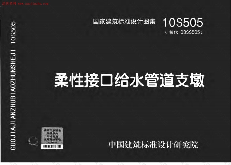 国家建筑标准设计图集10S505(替代03SS505)柔性接口给水管道支墩中国建筑标准设计研究院造价者网www.zaojiazhe.com国家建筑标准设计图集10S505替代03SS505)柔性接口给水管道支墩批准部门:中华人民共和国住房和城乡建设部组织编制:中国建筑标准设计研究院方订中圆计刻虫版社造价者网w.zaojiazhe.com图书在版编目(CIP)数据郑重声明:本图集已授权“全国家建筑标准设计图集.柔性接口给水管道支墩。10国律师知识产权保护协作网”对著S505/中国建筑标准设计研究院组织编制:、一北京:作权(包括专有出版权)在全国范中国计划出版社,2010.10围予以保护,盗版必究。tsBN978-7-80242-536-1举报盗版电话:010-63906404Ⅲ.①建筑设计一中国一图集010-68318822①TU206②yTU991.36-64中国版本图书第CP数据核字(2010)第183963号国家建筑标准设计图集柔性接口给水管道支墩2010年10月第1低2010年10月第1次印刷1SBN978-7-80242-536-1定价:68.00元