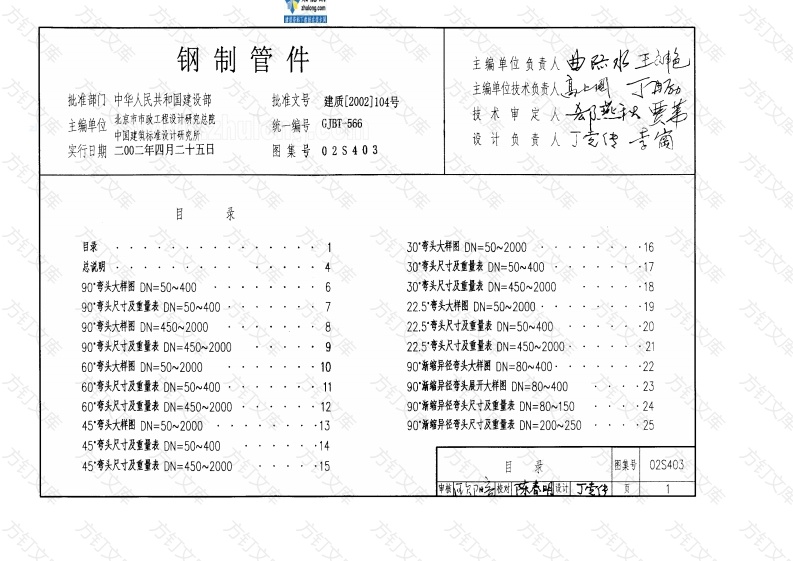 钢制管件库主编单位负责人批准部门中华人民共和国建设部找准文号建质[2002]104号主编单位统一编号GJBT-566实行日期二00二年四月二十五日图集号02S40316630李头尺寸及重量表DN=450~20001890弯头尺寸及重量表DN=50~400722.5弯关大样图DN=50~2000·19822.5香头R寸及重量表DN=504002090弯头尺寸及重量表DN=450~20009·2360°弯头尺寸及重量表DN=450~200045弯头大样图DN=50~2000,1390渐缩异径香头尺寸反重量表DN=200~250·2545弯头尺寸及直量表DN=5040045奢头尺寸及重量表DN=450~200002S40326补强三通、.四通大样图DN=800~10004690渐笔异径喜头尺寸及重量表DN=350~400274790渐笔异径李头大样图DN=450~2000284829等径三通、四通尺寸及重量表DN=50~6004990渐窄异径考头尺寸及重量表DN=450~5003050315190渐笔异径喜头尺寸及重量表DN=800~900325290°渐缩异径奢头尺寸及重量表DN=1000~120033异径嘴尺寸及重量表DN=80300345490°渐缩异径喜头尺寸及重量表DN=1800~2000355536异径带尺寸及重量表DN=700~1200三通、四通尺寸及重量表DN=80~20037异径尺寸及重量表DN=1400~20005438偏心异径管大样图DN=80~25039偏心异径管尺寸及重量表(1)DN=802505940偏心异径管尺寸及重量表(2)D=80~25060三通,四通尺寸及重量表DN=45050041偏心异径管大样图DN=300~500三通.四通大样图DN=600~70042偏心异径誉尺寸及重量表(1)DN=300~5006243偏心异径管尺寸及重量表(2)DN=300~5006344三看.四通尺寸及重量表DN=800~100045目录02S40364兼气三通尺寸及重量表DN=500~100065偏心异径告尺寸及重量表(2)DN=600~100066钢制非泥三通尺寸及重量表DN=200~100067偏心异经件尺寸及重量表(1)DN=1200~20006869机口大样圈DN=50~1000;DN/DN1=1/1.5~1.67071机口大样圈DN=50~1000;DN/DN1=1/1.8~2.5··72双法兰管道传力接头DN=300~2000制法兰大样图PN0.25MPa747576777879부型气管DN=200~60080制法兰尺寸及重量表PN1.6NPa81#气三通大样图DN=100~1000#气三通尺寸及重量表DN=100~45083目录02S403