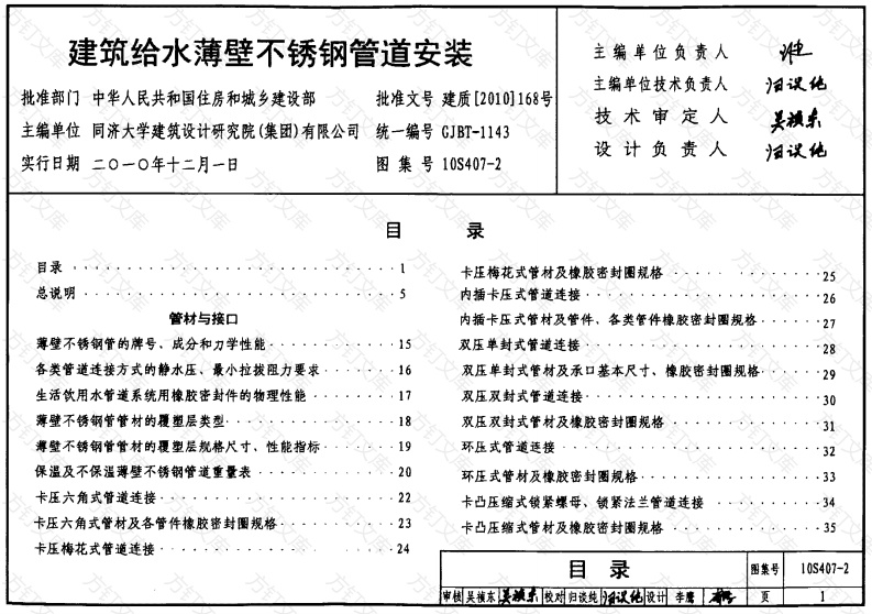 建筑给水薄壁不锈钢管道安装主编单位负责人主编单位技术负责人批准部门中华人民共和国住房和城乡建设部批准文号建质[2010]168号技术审定人主编单位同济大学建筑设计研究院(集团)有限公司统一编号G】BT-1143设计负责人实行日期二0一0年十二月一日图集号10S407-2目录目录卡压梅花式管材及橡胶密封图规格管材与接口内插卡压式管村及管件,各类管件橡胶密封墨规格薄壁不锈钢管的牌号,成分和刀学性能·双压单封式管道连接···双压单封式管材及承口基本尺寸、橡胶密封圈规格双压双封式管道连接·····双压双封式管材及橡胶密封图规格31薄壁不锈钢管管材的覆塑层机格尺寸,性能指标·32保温及不保温薄壁不锈钢管道重量表20环压式管材及橡胶密封圈规格33卡压六角式管道连接··22卡凸压缩式锁紧螺母,领繁法兰管道连接卡压大角式管材及各管件橡胶密封圈规格卡凸压缩式管材及橡胶密封圈规格卡压梅花式管道连接24目录10S407-2凸环压缩式顶筒螺纹、扣紧法兰管道连接36立管与干管、支管的自由附连接56凸环压缩式管材及橡胶密封图规格··管道穿伸缔、沉降和抗震缝措施57卡环压缩式管道连接管道穿墙体、墙基础、池壁安装9管道穿楼板、屋面安装锁扩式管材及橡胶密封圈规格40横管固定支架安装6041立管固定支架安装·端面式管材及橡胶密封图规格442活动支架配件活接螺纹式管遒连接43管道自然补偿措施···,63希接螺纹式管件、不锈钢密封环及0形密對圈接管式不锈钢泼形膨胀节安装445法兰式不锈钢波形膨胀节安装65活套法兰式不锈钢密封环、密封图、活套法兰、脚边短节。·46不锈钢线性温度补偿器安装·66卡箍法兰式管道连接沿墙明数卧式水表安装48嵌墙式分户水表安装68承插盔弧焊式管件承口49立式水表明敷或管道井安装69分水器安装与管递布置原理留沟槽式管道连接52球闲安装详图53水嘴安装详图72沟槽式橡胶密封图规格及其物理性能自闭式冲洗阀安装详图73安装详图薄壁不锈钢管的安装间距55目录10S407-22角阅安装详图双压单封式三通类转换管件及四通管件不锈钢营与钢管、塑料管、阀件、附件的连接75双压双封式直通、膏头及其转换管件双压双封式弯头,三通及其转换管件.94环压式直通、管帽、法兰接管件···卡压六角式直通类及其转换管件76环压式直通类转换及活接管件卡压六角式活接及法兰管件环压式弯头类管件卡压六角式弯头类及其转换管件·78环压式弯头类转换管件·,卡压六角式三通类,四通类管件79环压式三通、四通类管件卡压六角式三通类转换管件80环压式三通类转换管件····卡压梅花式直通类及其转换管件卡凸压缩式锁紧螺母型直通及其转换管件,10182卡凸压缩式锁紧螺母型弯头及其转换管件102卡压梅花式三通、四通、管帽及跨管管件·83卡凸压缩式锁紧螺母型三通、四通及其转换管件卡压梅花式三通类转换管件··84卡凸压缩式锁紧法兰型直通、弯头及其转换管件内插卡压式直通类及其转换管件85卡凸压缩式锁紧法兰型三通、四通及其转换管件··,,,·105内插卡压式弯头类及其转换管件凸环压缩式项簡螺纹型直通及其转换管件.106凸环压缩式顶簡蝶纹型弯头、三通及其转换管件.107双压单封式直通类及其转换管件88凸环压缩式扣紧法兰型及法兰转换管件双压单封式活接及弯头类管件·凸环压缩式扣紧法兰型直通、弯头、三通管件双压单封式考头类转换管件90卡环压缩式直通及其转换管件双压单封式三通类管件目录10S407-23