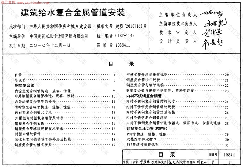 建筑给水复合金属管道安装主编单位负责人弩批准部门中华人民共和国住房和城乡建设部入批准文号建质[2010]168号主编单位技术负责人技术审定人主编单位中国建筑东北设计研究院有限公司统一编号GJBT-1145实行日期二0一0年十二月一日设计负责人图集号10SS411录沟槽式管件连接操作说明·20钢塑复合管法兰连接钢塑复合管内涂塑复合钢管构造、规格、性能……9钢塑复合管与薄壁不锈钢管、塑料管连接……23内外涂塑复合钢管构造、规格、性能·10内衬不锈钢复合钢管内外涂塑复合钢管的修补·内衬不锈纲复合纲管结构尺寸………24内衬塑复合钢管构造、规格、性能…12内衬塑复合钢管尺寸表13内衬不锈钢复合钢管法兰连接外覆塑内衬塑复合钢管尺寸表………14内衬不锈钢复合钢管焊接,…2715内衬不锈钢复合钢管切削卡箍式、滚压卡式、卡套式连接·28钢塑复合管螺纹连接技术要求………16钢塑复合压力管(PSP管)17PSP管构造、规格、性能…2918双热熔管件承插口30钢塑复合管沟槽式接头…PSP管连接操作说明31目录图集号10SS411库PSP管法兰34涂塑刚性沟槽式管接头·52PSP管法兰连接示意图35涂塑挠性沟槽式管接头53通用安装法兰连接涂塑管件4454管道穿墙体、。池壁安装36法兰连接涂塑异径管·55管道穿楼板、屋面安装38内衬不锈钢管件……管道埋地、墙、地板开槽安装39PSP管用等径、异径三通,等径、异径管套,堵头·59沿墙水平(垂直)安装单管固定托架图40PSP管用异径、45°、90°弯头,活接头溶作,活接转换接头·60预埋件式水平(垂直)安装单管固定托架图PSP管用外螺弯头,接头、三通沿培水平(垂直)安装双管固定托架图44PSP管用内螺弯头、接头,三通预理件式水平(垂直)安装双管围定托架图…45PSP管用带座内、外螺90°弯头……63管件96PSP管用等径、异径三通,等径四通沟槽式连接涂塑管件尺寸表47PSP管用堵头、管查、法兰……66沟槽式连接涂塑异径三通48PSP管用异径套管,内外螺接头,外螺三通沟槽式连接涂塑异径管,49沟槽螺纹式连接异径管,目录图集号10SS411总说明编制依据本图集根暴中华人民共和国住房和城乡建设部建质函[2008]83号“关于印发《2008年国家建筑标准设计编制工作计划》的通知”编制。2设计依据4.1.2衬塑钢管的组成:《建筑给水排水设计规范》GB50015-2003(2009年版)《建筑给水排水及采暖工程施工质量验收规范GB50242-20022)基管为焊接钢管或无缝钢管,且同一管径有多种壁厚;CJ/T120-2008CJ/T136-20074)外防稿为镀锌、涂型或外覆聚乙烯CJ/T192-2004《钢塑复合压力管》CJ/T183-2008CJ/T137-20084.1.4选择管材与接口:CJ/T156-2001CJ/T237-2006表】钢塑复合管的基管和管件3适用范围基管/管件焊接钢管/可锻诗铁村整管件Pn1.01.0PD1.6钢管和钢塑复合压力管(PSP)的设计选用和施工安装.1.6