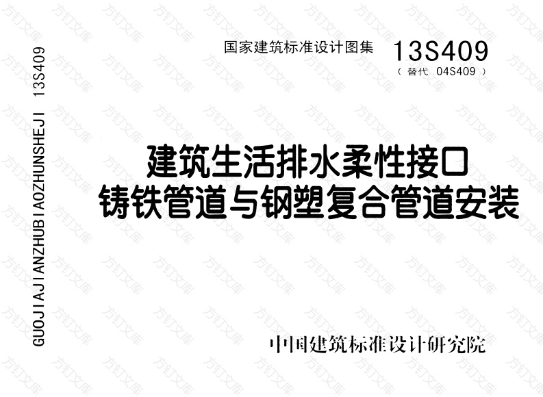 国家建筑标准设计图集13S409替代04S409方建筑生活排水柔性接口铸铁管道与钢塑复合管道安装万国家建筑标准设计图集13S409(替代04S409)建筑生活排水柔性接口铸铁管道与钢塑复合管道安装批准部门:中华人民共和国住房和城乡建设部组织编制:中国建筑标准设计研究院方方订住房城乡建设部关于批准《蒸压加气混凝土砌块、板材构造》等8项国家建筑标准设计的通知建质[2013]191号各省、自治区住房城乡建设厅,直辖市建委(建交委、规划委)及有关部门,新噩生产建设兵团建设局,总后基建营房部工程局,国务院有关部门建设司:经审查,批准由北京市建筑设计研究院等7个单位编制的《蒸压加气混凝土砌块、板材构造》等8项标准设计为国家建筑标准设计,自2014年1月1日起实施。原《蒸压加气混凝土砌块建筑构造》(97J103-1)、《建筑排水用柔性接口铸铁管安装》(04S409)、《动力专业设计常用数据》(06R503)标准设计同时废止。附件:国家建筑标准设计名称及编号表中华人民共和国住房和城乡建设部二O一三年十二月二十五日建质[2013]191号”文批准的8项国家建筑标准设计图集号序号图集号序号图集号序号图集号序号图集号13J10413J913-1513S409713K513213J602-3413G44013K312813R503