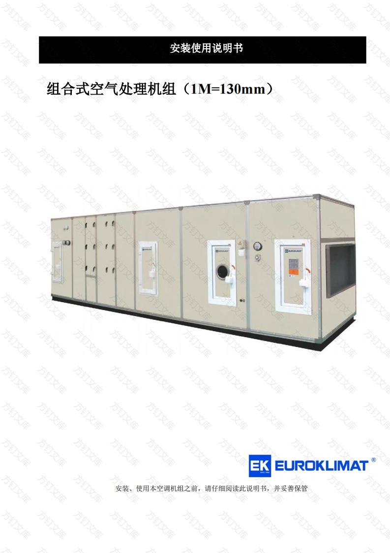安装使用说明书组合式空气处理机组(1M=130mm)方方方订EKEUR▣KLIMAT安装、使用本空调机组之前,请仔细阅读此说明书,并妥善保管万方文方方方方方方方方订方方方万组合式空气处理机组文EKDM1609-A1Part No:AH01500007录安全注意事项22特点简介33型号说明4机组的安装…54.1机组的运输…54.2机组的验收………………4.4机组的搬运及起吊……………4.5安装空间要求………………4.6基础的设置…64.7机组的安装4.8管路的安装4.9电器的安装9机组的调试2机组的使用维护和保养常见故障解决方法229售后服务及保修24订钉方本说明书包括广东欧科空调制冷有限公司现在生产的产品,如果设计或产品结构变化时,恕不预先通知。生产许可证编号:XK06-015-00361执行标准:GB/T14294-2008文文