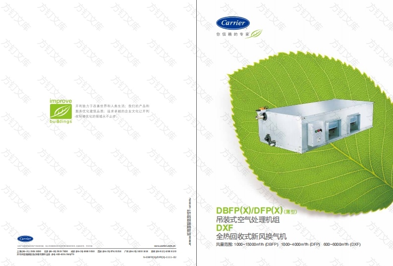 Carrier方你信的专家方文文improvebuildings钉方方DBFP(X/DFP(X满型吊装式空气处理机组DXF全热回收式新风换气机型号说明库工0万开利中国Carrier文风量DFP:1000-4000 mh DXF:600-6000 mh机组特点机组控制系统解决方案钉on-6oia箱体、水盘、初效过滤器及吊架启动