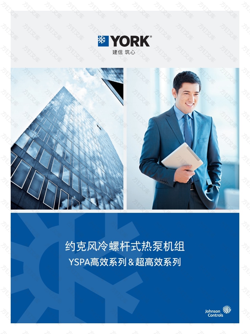 万方方建信筑心库方库钉方文方方方文文方文万约克风冷螺杆式热泵机组YSPA高效系列&超高效系列JohnsonControls约克YSPA系列风冷螺杆式热泵机组是专为中央空调的末端设备提供冷(热)水源的空调主机设备。机组为整体式设计,可安装于室外屋顶或地面上。机组能够实现夏季制冷、冬季供暖及热回收等多种功能,可广泛应用于商场、办公楼、宾馆、医1国院等不同场合。YSPA机组采用R134a环保制冷剂,其超高效系列机组能效比最高可达3.57,远高于国家一级能效指标,成为世界上同类产品中最高效节能的风冷热泵机组。万高效节能技术创新万方方订方方方舒适宁静环保与责任万方库方约克YSPA高效系列&超高效系列风冷螺杆式热泵机组机组特点方高效节能YSPA系列风冷螺杆式热泵机组使大幅节省能源费用变得非常简单,结合全面的创新设计,如高效螺杆压缩机、独立中压罐等,制冷最高效率可达3.57,制热最高效率可达3.66,与传统风,冷热泵机组相比节省费用可达15%。前所未有的超高效率将帮助您大幅缩短项目回报期。技术创新YSPA系列风冷螺杆式热泵机组集中了多种创新技术,如专利设计的中压罐、分步库除霜系统和活塞式四通换向阀等,有效避免了传统风冷热泵机组的吸气带液、除霜不彻底、四通换向阀卡死等现象,充分保证YSPA的高效性、稳定性和可靠性。独特的智能除霜控制逻辑。自动选择除霜切入退出时间节点,有效避免颊繁除霜和超时除霜,同时结合先进的错时除霜设计,大幅减小除霜时热水水温波动:换热器底部采用半边支撑,无水槽和加热带,充分防止冰裙和爬冰:专利设计的X形结构可防止盘管底部冰冻,加快机组的除霜速度.在寒冷的冬天给您带来舒适的空调环境。舒适宁静YSPA系列风,冷螺杆式热泵机组采用低噪音风机并且提供了丰富的降噪选项,结合优化的V型盘管设计,带来超低噪音的运行:宁静的夜间运行模式能保证机组在夜晚也达到您的静音要求。万万文环保与责任环保制冷剂R134a,对大气臭氧层没有任何破坏作用,保护人类生存环境。高效运行减少电能消耗,间接地减少电厂C0,的排放量,减少全球温室气体效应。命名方法0775HE/YE约克HE:超高效系列YE:高效系列螺杆压缩机名义制冷量热泵设计序列号3