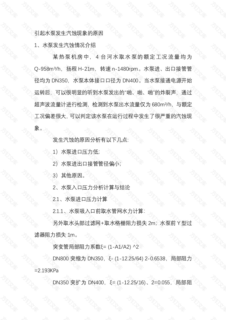 引起水泵发生汽蚀现象的原因1、水泵发生汽蚀情况介绍某热泵机房中,4台河水取水泵的额定工况流量均为Q-958m3/h,扬程H-21m,转速n-1480rpm。水泵进、出口接管管径均为DN350,水泵本体接口口径为DN400。当水泵接通电源开始运转后,可以很明显的听到水泵发出的“啪、啪、啪"的炸裂声,通过超声波流量计进行检测,检测到水泵出水流量仅为60m3h,与额定工况偏差很大,可以判定该水泵在运行过程中发生了很严重的汽蚀现象。发生汽蚀的原因分析有以下几点:1)水泵进口压力低:水泵进出口接管管径偏小;方订3)其他原因。方2、水泵入口压力分析计算与结论2.1、水泵进口压力计算2.1.1、水泵吸入口前取水管网水力计算另外取水头部过滤网+取水格栅阻力损失2,水泵前Y型过滤器阻力损失1m。突变管局部阻力系数ξ=(1-A1/A2)A2DN800突缩为DN350,-(1-12.25/64)2-0.6538,局部阻力=2.193KPaDN350突扩为DN400,=(1-12.25/16)、2=0.055,局部阻0.186KPa弯头、三通的局部水损取沿程水损的30%综上计算:水泵若正常开启运行后,从取水口至水泵吸入口总水损=(0.676+0.072)X1.3+2+1+0.238=4.21m2.1.2、水泵进口压力:河水水位实测黄海高程为0.54知,水泵吸入口实测高程为5.32m,大气压力10m。水泵吸入口之前压力P=10+0.54-(-5.32)-4.21-11.65m2.1.3、水泵的必需汽蚀余量NPSHr根据厂家提供取水泵选型资料,查得本项目取水泵的性能特性曲线,在额定工况下,可知该水泵的必需汽蚀余量为6m。2.2、水的汽化压力计算根据安托尼方程lgP-A-B/(T+C)河水温度为30C时A=7.07406,B=1657.46,C=227.02可计算出夏季30℃的河水的汽化压力为4.219KPa。2.3、计算分析结论根据上述计算,考虑水体汽化压力0.42m并附加0.3m的安全值,只需保证水泵进口压力大于6.72m,实际的进口压力为11.65m,水泵进口压力能满足水泵必须汽蚀余量的要求。水泵进口压力低不是造成本项目取水发生汽蚀的主要原因。水泵进出口按管管径计算分析水泵进出口管径均为DN350,外径377mm,壁厚8mm,理论流量958m3/h,实际流量680m3/h。在流量为958m3h情况下,管道内水体流速为2.60m/s在流量为680mh情况下,管道内水体流速为1.85m/s。根据《现代泵技术手册》中水泵设计要求:当水泵吸口。口径小于DN250时,水泵吸口前管段水体流速宜控制在1.0-1.6m/s之间:当水泵吸口口径大于等于DN250时,水泵吸口前管段水体流速宜控制在1.2-2.0m/s。某热泵机房取水泵进出口口径均为DN400,按上述要求,该取水泵吸入口前管段水体流速宜控制在1.2-2.0m/s之间,而实际流速为2.6m/s,因此取水泵前后管径偏小是造成本项目发生汽蚀的重要原因。4、其他原因分析4.1、水体中气体含量较大某热泵机房水源水来自其北面的蟒蛇河,蟒蛇河为淡水河水体中氧气、二氧化碳等气体含量较多。在其流经水泵吸入口后,由于水泵吸入口至水泵叶轮叶片处压力降低,气体溶解度降低,气体析出,并且在叶片入口附。近液体压力最低处,甚至形成局部的真空部分水体汽化,加重汽蚀并使得水泵出水量降低。4.2、突缩管及突扩管河水从DN600引水管汇入机房内DN800的集水管内,再由DN350的支管引水至DN400的水泵吸入口,水在突缩管及突扩管中流动时都会产生局部的死区,导致水泵抽水量不足,从而形成汽蚀。