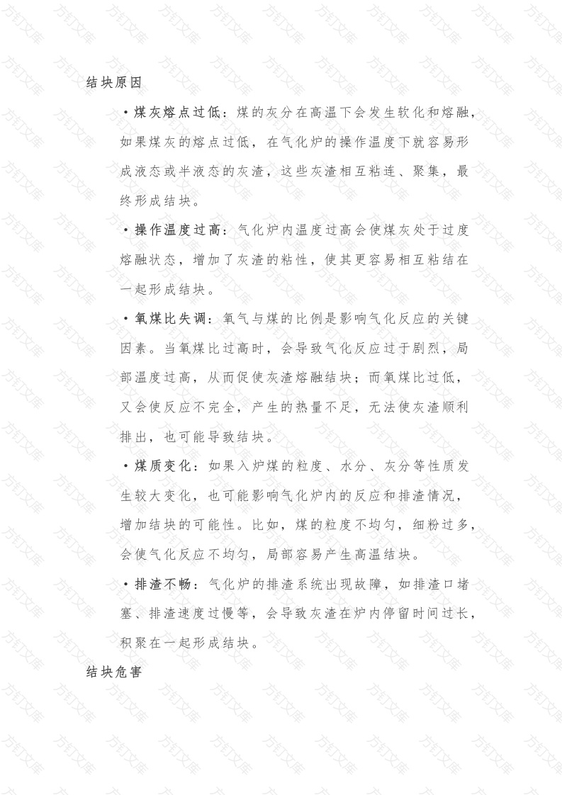结块原因煤灰熔点过低:煤的灰分在高温下会发生软化和熔融如果煤灰的熔点过低,在气化炉的操作温度下就容易形成液态或半液态的灰渣,这些灰渣相互粘连、聚集,最终形成结块。操作温度过高:气化炉内温度过高会使煤灰处于过度熔融状态,增加了灰渣的粘性,使其更容易相互粘结在起形成结块。氧煤比失调:氧气与煤的比例是影响气化反应的关键因素。当氧煤比过高时,会导致气化反应过于剧烈,局部温度过高,从而促使灰渣熔融结块;而氧煤比过低,又会使反应不完全,产生的热量不足,无法使灰渣顺利排出,也可能导致结块。煤质变化:如果入炉煤的粒度、水分、灰分等性质发生较大变化,也可能影响气化炉内的反应和排渣情况,增加结块的可能性。比如,煤的粒度不均匀,细粉过多,会使气化反应不均匀,局部容易产生高温结块。排渣不畅:气化炉的排渣系统出现故障,如排渣口堵塞、排渣速度过慢等,会导致灰渣在炉内停留时间过长,积聚在一起形成结块。结块危害万万万万方万万万文·影响气化炉的正常运行:结块会导致气化炉内的气流分布不均匀,使气化反应不稳定,影响煤气的产量和质量。严重时,结块可能会堵塞气化炉的通道,导致生产中断。•损坏设备:结块的形成会使气化炉的内壁和部件受到不均匀的热应力和机械应力,加速设备的磨损和腐蚀,降低设备的使用寿命。增加安全风险:结块在气化炉内可能会突然掉落,砸坏炉内的衬里和其他设备,甚至引发安全事故。此外,结块还可能导致气化炉内压力波动,增加爆炸等安全风险。结块危害•影响气化炉的正常运行:结块会导致气化炉内的气流分布不均匀,使气化反应不稳定,影响煤气的产量和质量严重时,结块可能会堵塞气化炉的通道,导致生产中断。•损坏设备:结块的形成会使气化炉的内壁和部件受到不均匀的热应力和机械应力,加速设备的磨损和腐蚀,降低设备的使用寿命。•增加安全风险:结块在气化炉内可能会突然掉落,砸坏炉内的衬里和其他设备,甚至引发安全事故。此外,结块还可能导致气化炉内压力波动,增加爆炸等安全风险。解决措施文文万万万万万万优化煤种选择和配煤:根据气化炉的特点和工艺要求选择合适的煤种,并通过配煤的方式来调整煤的性质,使煤灰的熔点、粒度等指标符合气化要求。•严格控制操作参数:精确控制气化炉的操作温度、氧煤比、压力等参数,确保气化反应在稳定的条件下进行。可通过安装先进的温度、压力监测设备,实时监控炉内情况,及时调整操作参数。加强设备维护和排渣管理:定期对气化炉进行检查和维护,清理炉内的积渣和结垢,确保排渣系统的正常运行。同时,优化排渣操作,控制合适的排渣速度,避免灰渣在炉内积聚。·采用添加剂:在煤中添加适量的添加剂,如石灰石、白云石等,可以调节煤灰的熔点和粘度,降低结块的可能性。煤质控制优先选择灰熔点高、灰分低、挥发分适中的煤种。一般来说,灰熔点高于1350℃的煤更有利于防止结块,如某些无烟煤和贫煤。同时,要避免使用灰分过高(超过40%)的煤,因为高灰分煤会增加灰渣量,提高结块风险•精确配煤操作:通过将不同煤种按照一定比例混合,混合煤的各项指标达到气化炉的最佳要求。例如,将灰