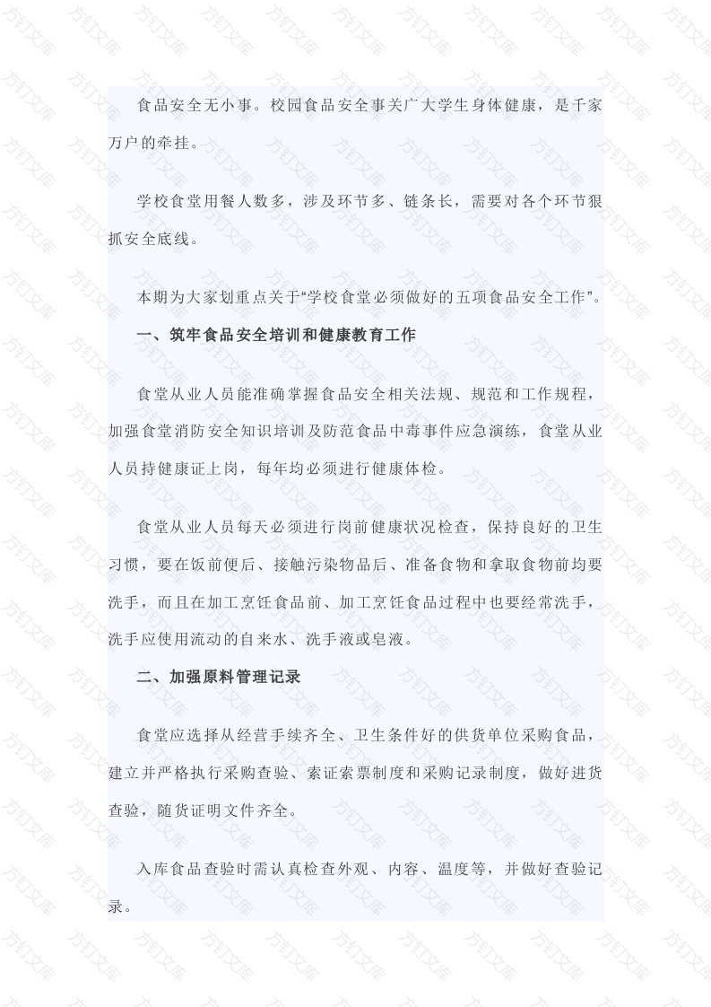 食品安全无小事。校园食品安全事关广大学生身体健康,是千家万户的牵挂学校食堂用餐人数多,涉及环节多、链条长,需要对各个环节狠抓安全底线。本期为大家划重点关于“学校食堂必须做好的五项食品安全工作”。筑牢食品安全培训和健康教育工作食堂从业人员能准确掌握食品安全相关法规、规范和工作规程,加强食堂消防安全知识培训及防范食品中毒事件应急演练,食堂从业人员持健康证上岗,每年均必须进行健康体检。食堂从业人员每天必须进行岗前健康状况检查,保持良好的卫生习惯,要在饭前便后、接触污染物品后、准备食物和拿取食物前均要洗手,而且在加工烹饪食品前、加工烹饪食品过程中也要经常洗手,洗手应使用流动的自来水、洗手液或皂液。加强原料管理记录食堂应选择从经营手续齐全、卫生条件好的供货单位采购食品,建立并严格执行采购查验、索证索票制度和采购记录制度,做好进货查验,随货证明文件齐全。文入库食品查验时需认真检查外观、内容、温度等,并做好查验记万万文原料贮存要规范,建立先进先出等出库原则,按照原料性质进行严格区分,分区、分架、分类、离墙、离地存放食品。三、把控加工制作各个环节文加工制作时,注意场所、人员、设备设施、原料存放、盛放容器工具分开使用,避免交叉污染。生熟食品存放时也要严格分开,生的肉、禽、蛋、水产品、蔬菜等要用塑料保鲜袋(严禁有色塑料袋)、纸袋或适宜的器皿装好后放在冰箱冷藏室或冷冻室的底层,可以直接食用的乳制品、熟肉制品、罐头、饮料和水果等要放在冰箱冷藏室或冷冻室的上层,冰箱中食物要生熟分开以避免交叉污染。正确的烹调方法和适当的烹调温度可以杀死几乎所有的有害微生物,烹调食物的中心温度达到75℃或以上(国标70℃)时有助于保证食用安全,因此彻底煮熟烧透是保证食物安全的有效手段,尤其是对肉、禽、蛋和水产品等微生物污染风险较高的食品。建立食品留样制度,所有食品(含赠售)均需留样200克(国标125克以上),48小时。文规范使用食品添加剂,做好五专管理(专人采购、专人保管、人领用、专人登记、专柜保存),并有使用记录。四、完善食堂基础设施&设备万万万场所与布局合规,食堂内外保持清洁,与有毒、有害场所以及其他污染源保持规定的安全距离,设计与布局合理,无交叉污染风险,不擅自改变流程。做好餐用具清洗消毒保洁,并且注意消毒剂的合规使用,保证消毒过程的温度以及时间。基础设施的防护,与外界相通的门、窗有防蝇帘或风幕机:线槽、管道、门缝严密:人员货物通道设有挡鼠板(60cm)配备消毒、更衣、盥洗、通风、防腐、防尘、防蝇、防鼠、防虫、洗涤以及处理废水、存放垃圾和废弃物等的设备或设施。定期对设备设施进行清洗、校验和维护,并有记录。记录信息应包括:晨检、从业人员培训考核记录、进货查验、原料出库、食品安全自查、餐厨垃圾处理、消毒、留样、食品添加剂、设备设施清洁维护校验等。五、定期食品安全自查工作做好经营过程的食品安全自查,至少保证每周开展一次经营全过程自查:每年至少开展一次制度自查:不定期进行专项自查。建立学校食堂安全事故应急处置方案,定期组织培训考核,并根据实际情况及时改进预案。文文万文万万