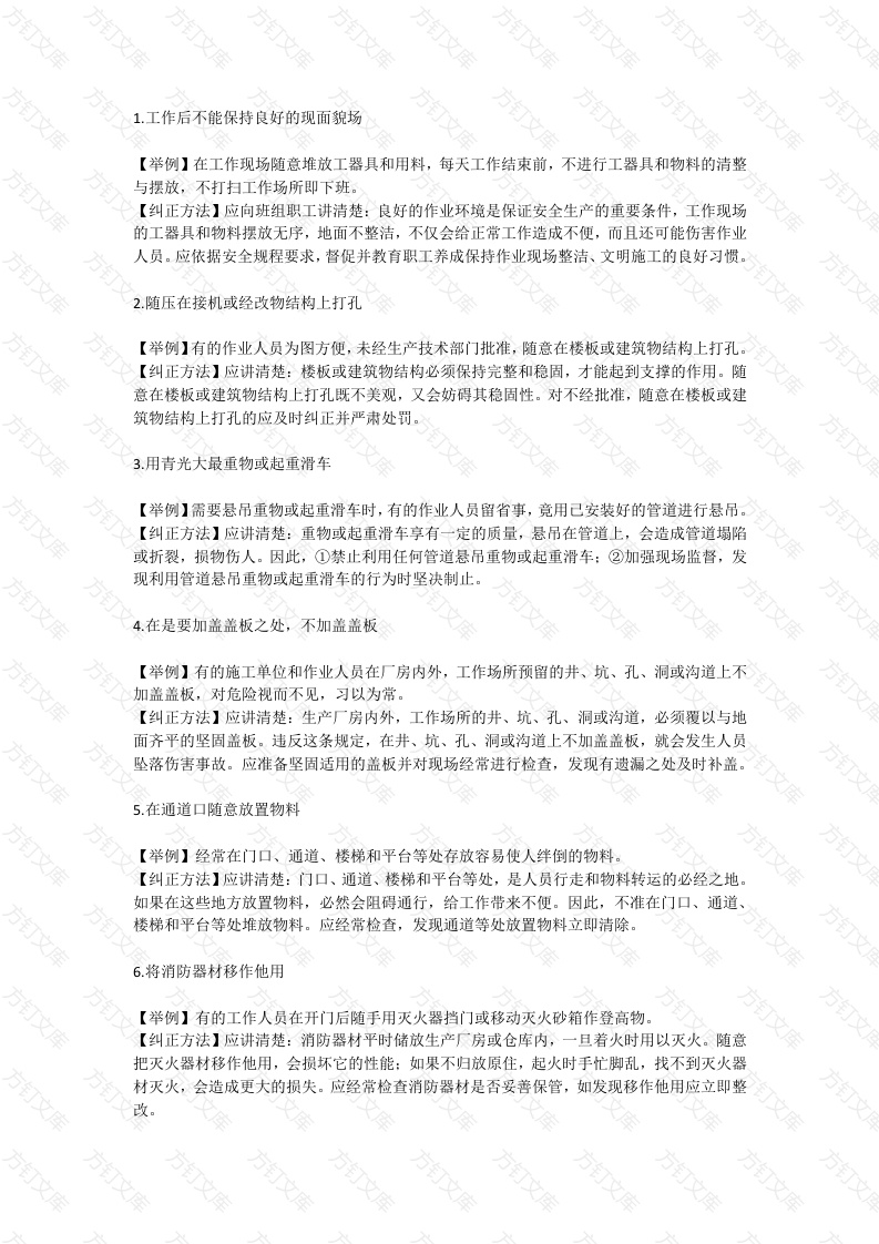 1.工作后不能保持良好的现面貌场【举例】在工作现场随意堆放工器具和用料,每天工作结束前,不进行工器具和物料的清整与摆放,不打扫工作场所即下班【纠正方法】应向班组职工讲清楚:良好的作业环境是保证安全生产的重要条件,工作现场的工器具和物料摆放无序,地面不整洁,不仅会给正常工作造成不便,而且还可能伤害作业人员。应依据安全规程要求,督促并教育职工养成保持作业现场整洁、文明施工的良好习惯。2.随压在接机或经改物结构上打孔【举例】有的作业人员为图方便,未经生产技术部门批准,随意在楼板或建筑物结构上打孔。【纠正方法】应讲清楚:楼板或建筑物结构必须保持完整和稳固,才能起到支撑的作用。随意在楼板或建筑物结构上打孔既不美观,又会妨碍其稳固性。对不经批准,随意在楼板或建筑物结构上打孔的应及时纠正并严肃处罚。3.用青光大最重物或起重滑车【举例】需要悬吊重物或起重滑车时,有的作业人员留省事,竞用己安装好的管道进行悬吊。【纠正方法】应讲清楚:重物或起重滑车享有一定的质量,悬吊在管道上,会造成管道塌陷或折裂,损物伤人。因此,①禁止利用任何管道悬吊重物或起重滑车:②加强现场监督,发现利用管道悬吊重物或起重滑车的行为时坚决制止。4.在是要加盖盖板之处,不加盖盖板【举例】有的施工单位和作业人员在厂房内外,工作场所预留的井、坑、孔、洞或沟道上不加盖盖板,对危险视而不见,习以为常。【纠正方法】应讲清楚:生产厂房内外,工作场所的井、坑、孔、洞或沟道,必须覆以与地面齐平的坚固盖板。违反这条规定,在井、坑、孔、洞或沟道上不加盖盖板,就会发生人员坠落伤害事故。应准备坚固适用的盖板并对现场经常进行检查,发现有遗漏之处及时补盖。5.在通道口随意放置物料【举例】经常在门口、通道、楼梯和平台等处存放容易使人绊倒的物料。【纠正方法】应讲清楚:门口、通道、楼梯和平台等处,是人员行走和物料转运的必经之地。如果在这些地方放置物料,必然会阻碍通行,给工作带来不便。因此,不准在门口、通道、楼梯和平台等处堆放物料。应经常检查,发现通道等处放置物料立即清除。6.将消防器材移作他用【举例】有的工作人员在开门后随手用灭火器挡门或移动灭火砂箱作登高物。【纠正方法】应讲清楚:消防器材平时储放生产厂房或仓库内,一旦着火时用以灭火。随意把灭火器材移作他用,会损坏它的性能:如果不归放原住,起火时手忙脚乱,找不到灭火器材灭火,会造成更大的损失。应经常检查消防器材是否妥善保管,如发现移作他用应立即整改7.在工作场所存放易燃物品【举例】把没用完的易燃物品随手放在工作场所的角落或走廊,准备下次再用【纠正方法】应讲清楚:在工作场所存放汽油。煤油、酒精等易燃物品既会污染工作环境,还容易引起燃烧和爆炸。因此,禁止在工作场所存储易燃物品。作业人员应准确估算领取的易燃物品。领取的易燃物品应在当班或一次性使用完:剩余的易燃物品应及时放回指定的储存地点。对随意在工作场所存放易燃物品的现象,一经发现必须严肃处理。8.不按现规定穿工作服【举例】有的工人穿用工作服时,衣服和袖口不扣好:有的女职工进入生产现场穿裙子和高跟鞋,辫子、长发不盘在工作帽内。【纠正方法】应讲清楚:不按规定规范着装,衣服或肢体可能被转动的机器绞住绞伤。因此,必须按规定着装。在作业前,班组长应对着装进行严格检查,不按规定着装的不准上岗作业。9接触高温物体工作,不戴防防护手套,不穿专用防护服【举例】有的工人不戴手套和穿用防护工作服就参加接触高温的作业,还振振有词地说:“穿防护服不灵便,只要小心谨慎,不戴防护手套也不会出事”。【纠正方法】应讲清楚:接触高温物体,工作时如果不戴防护手套,不穿专用防护工作服,就有可能被烫伤。列举不按规定着装被烫伤的事故,从中吸取教训,作业前应进行认真检查。对接触高温物体,不戴防护手套、不穿用防护工作服者,不准上岗。10.进入施工作业现场不正确佩戴安全帽【举例】有的职工进入施工生产现场不戴安全帽或者虽然戴上安全帽,却不系好帽绳,还有的职工把安全帽当成小凳子坐。【纠正方法】应讲清楚:施工生产现场存在诸多危险因素,比如物体坠落等,因此,必须加强对头部的防护,戴好安全帽,以对头部起到有效的防护作用。进入施工生产现场前,严格检查工人佩戴安全帽的情况,不正确佩戴安全帽者不准进入施工生产现场。发现把安全帽当凳子坐的现象应严肃查处。11.在机器转动时装折或校正皮带【举例】有的工人在机器转动时,动手进行校正或者装拆皮带,面对纠正和劝阻,他们不以为然地说:“以前老师傅都这么做,我们这么做也不会出事。”【纠正方法】应讲清楚:装拆或校正皮带必须在机器停止时进行,否则有可能绞伤手指或手臂。经常列举在机器转动时装折或校正皮带发生的血淋淋的事故,从中吸取教训。对违章操作者应及时纠正,严肃查处。12.在机器未交全停止以前,进行修理工作万文【举例】有的职工发现机器出现小故障,在机器未完全停止以前便进行修理,并且说:“小故障,随手修理一下不影响工作。等机器完全停止,排除故障再重新启动,影响工作效率。【纠正方法】应讲清楚:在机器未完全停止之前,不能进