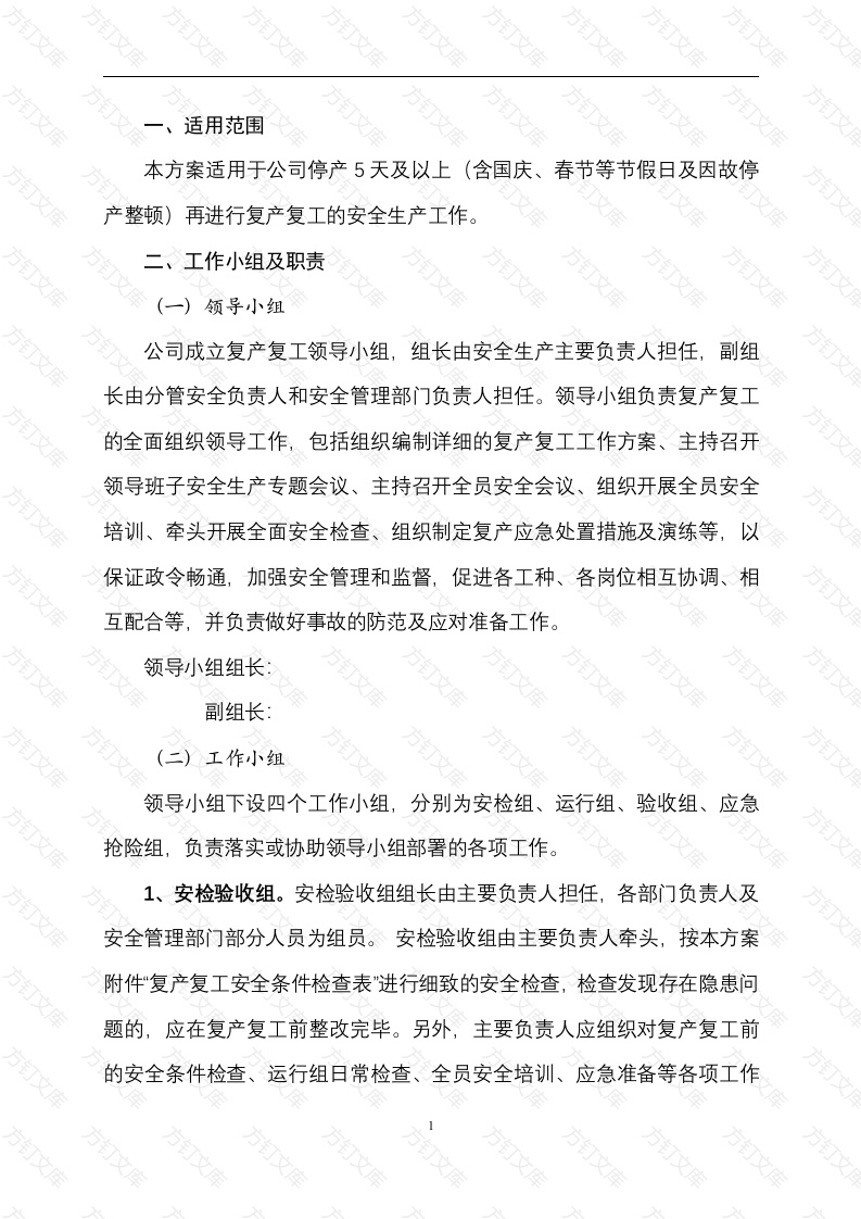 适用范围本方案适用于公司停产5天及以上(含国庆、春节等节假日及因故停产整顿)再进行复产复工的安全生产工作。二、工作小组及职责(一)领导小组公司成立复产复工领导小组,组长由安全生产主要负责人担任,副组长由分管安全负责人和安全管理部门负责人担任。领导小组负责复产复工的全面组织领导工作,包括组织编制详细的复产复工工作方案、主持召开领导班子安全生产专题会议、主持召开全员安全会议、组织开展全员安全培训、牵头开展全面安全检查、组织制定复产应急处置措施及演练等,以保证政令畅通,加强安全管理和监督,促进各工种、各岗位相互协调、相互配合等,并负责做好事故的防范及应对准备工作。领导小组组长:文副组长:(二)工作小组领导小组下设四个工作小组,分别为安检组、运行组、验收组、应急抢险组,负责落实或协助领导小组部署的各项工作1、安检验收组。安检验收组组长由主要负责人担任,各部门负责人及安全管理部门部分人员为组员。安检验收组由主要负责人牵头,按本方案附件“复产复工安全条件检查表"进行细致的安全检查,检查发现存在隐患问题的,应在复产复工前整改完毕。另外,主要负责人应组织对复产复工前的安全条件检查、运行组日常检查、全员安全培训、应急准备等各项工作进行验收,确认各项准备工作落实到位方能实施复产复工。安检组组长:组员:2、运行组。运行组由生产部负责人担任组长,生产和设备部门的其他人员担任组员(含维修、电工等)。运行组由生产部负责人牵头开展日常的生产设施检查工作,保证复产复工涉及的生产储存设施、设备处于完好可用状态。运行组组长:组员:3、应急抢险组。应急抢险组组长由分管安全负责人担任,安全管理部门部分人员及保安队伍担任组员。应急抢险组负责复产复工事故应急处置措施的制订,组织开展复产复工前应急演练和应急物资的检查工作,并对复产复工全过程进行应急监护应急抢险组组长:组员:文复产复工准备(一)召开复产复工安全生产专题会议(2019年10月7日)主要负责人主持、公司中层及以上领导参加,研判分析复产复工安全风险,划分职责,部署复产复工安全管理工作。(二)召开全员安全教育会议(2019年10月7日)主要负责人主持组织全公司人员召开全员安全教育会议,集中学习安全生产有关政策要求,通报复产复工准备工作情况,动员全体员工集中精保障复产复工安全。另外,结合涂料生产相关的生产安全事故警示教育,使员工心理意识从放假状态回归到工作状态上来。对于新进和转岗员工,应严格落实新入厂员工和转岗员工“三级"安全教育培训,使其熟悉岗位风险和作业要求,杜绝因人为操作失误引发的生产安全事故。(三)开展全厂性安全检查(2019年10月8日)主要负责人组织安检验收组、运行组、应急抢险组,对复产复工每个环节每个岗位的作业环境、生产设备、报警设施、安全防护设施、应急救援设施等逐一检查,对安全生产条件逐项确认,务必做到安全管理不到位不复产、防范措施不落实不复产、隐患问题不清零不复产。检查结果须经企业主要负责人签字确认。四、投料复产复工操作(一)投料前准备工作的确认1、对公司所有需投入运行的设备进行检查,各种动力设备分别进行单机运行试验,并确认消防、可燃气体探测设施是否完好。2、进行设备运行前例行检查、运行检查。3、公司操作的人员都通过了岗前培训,持证上岗。按照本单位事故应急救援预案,进行了应急演练。已确认做好防范和事故救援的一切准备。4、产品所需原辅材料已准备完好。(二)复产复工运行操作1、分散机复产运行步骤(1)操作前安全检查①操作人员上岗前必须经过培训,熟练掌握本设备的操作规程和安全
