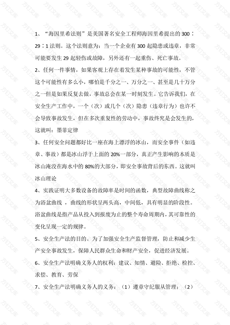 “海因里希法则”是美国著名安全工程师海因里希提出的30029:1法则。这个法则意为:当一个企业有300起隐患或违章,非常可能要发生29起轻伤或故障,另外还有一起重伤、死亡事故。2、任何一件事情,如果客观上存在着发生某种事故的可能性,不管这个可能性有多么小,哪怕是千分之一、万分之一、甚至是几十万分之一但是如果反复去做,事故总会在某一时刻发生。它告诉我们,在安全生产工作中,一个(次)或几个(次)隐患(违章行为)也许不会导致事故发生,但在多次重复性的劳动中,事故终究是会发生的,这就叫:墨菲定律3、任何安全问题都好比一座在海上漂浮的冰山,而安全事件(如违章、事故)都是冰山浮于上面的20%一部分,真正产生影响的本质是冰山淹没在海水中的80%的大部分,即安全事故背后的东西。这就冰山理论4、实践证明大多数设备的故障率是时间的函数,典型故障曲线称之为浴盆曲线,曲线的形状呈两头高,中间低,具有明显的阶段性。浴盆曲线是指产品从投入到报废为止的整个寿命周期内,其可靠性的变化呈现一定的规律。5、安全生产法的目的。为了加强安全生产监督管理,防止和减少生产安全事故发生,保障人民群众生命和财产安全,促进经济发展。6、安全生产法明确义务人的权利:建议、知情、避险、拒绝、检控、求偿、教育、劳保安全生产法明确义务人的义务:(1)遵章守纪服从管理:正确佩戴防护用品:(3)及时上报发现隐患:(4)参加教育培训8、安全生产法规定:单位超过100人的,必须专职安全管理人员或设置专职安全生产管理机构。9、安全生产法自2014年12月1日起实施10、安全生产法规定的三级教育为:公司级、部门级、班组级11、公司级安全教育包括:(1)本公司安全生产情况和安全生产基(2)规章制度和劳动纪律:(3)从业人员权利义务:4有关事故案例。12、部门级安全教育包括:(1)部门情况和制度:(2)工作环境和危因素:(3)可能遭受的职业伤害和伤亡事故:(4)岗位职责、操作技能和强制性标准;◇(5)自救互救、急救方法、疏散和现场紧急情况的处理;(6)安全设备设施、个人防护用品的使用和维护;(7)预防事故和职业危害的摺施及应注意的安全事顶;(8)有关事故案例。13、班组级安全教育包括:(1)岗位安全操作规程:(2)岗位之间衔接配合的安全与职业卫生事顶;(3)有关案例时间:14、消防法自2009年5月1日开始实施15、单位消防安全职责包括:(1)制定消防制度、作业规程:防火责任制、消防责任人:(3)消防宣传教育:(4)防火检查,消除火灾患;(5)配备消防器材设消防标志;6)保障散通道畅通16、消防重点单位增加职责包括:(1)建立防火档案确定重点部位2每日巡检、记录:(3)消防安全教育:(4)制定应急预案并演练17、消防灭火组织为:中国消防救援、义务消防队18、工伤保险条例规定:生产经营单位缴纳保费。用人单位实行承包经营的,工伤保险责任由职工劳动关系所在单位承担19、伤保险条例中工伤认定范畴:(一)在工作时间和工作场所内,因工作原因受到事故伤害的:(二)工作时间前后在工作场所内,从事与工作有关的预备性或者收尾性工作受到事故伤害的;(三)在工作时间和工作场所内,因履行工作职责受到暴力等意外伤害的;(四)患职业病的;(五)因工外出期间,由于工作原因叟到伤害或者发生事故下落不明的:(六)在上下班途中。受到非本人主要责任的交通事故者城市轨道交通、客运轮渡、火车事故伤害的:(七)法律、行政法规规定应当认定为工伤的其他情形;(八在工作时间和工作岗位,突发疾病死亡或者在48小时之内经抢救无效死;(仇)在抢险数灾等维护国家利益、公共利益活动中受到伤害的;(什职工原在军队服役,因战、因公负伤致残已取得革命伤残军人证,到用人单位后旧伤复发的。20、特种作业是指容易发生人员伤亡事故,对操作者本人、他人及周围设施的安全可能造成重大危害的作业。21、特种作业包括:(1)电工作业。含发电、送电,变电、配电工电气设的安装.运行、检修(维修)、试验工,矿山井下电钳工;(2)金属焊接、切割作业。含焊接工、切割工:(3)起重机械(含电梯)作业。含起重机械(含电梯)司机,司索工,信号指挥工,安装与维修工:(4)企业内机动车辆驾驶。含在企业内及码头、货场等生产