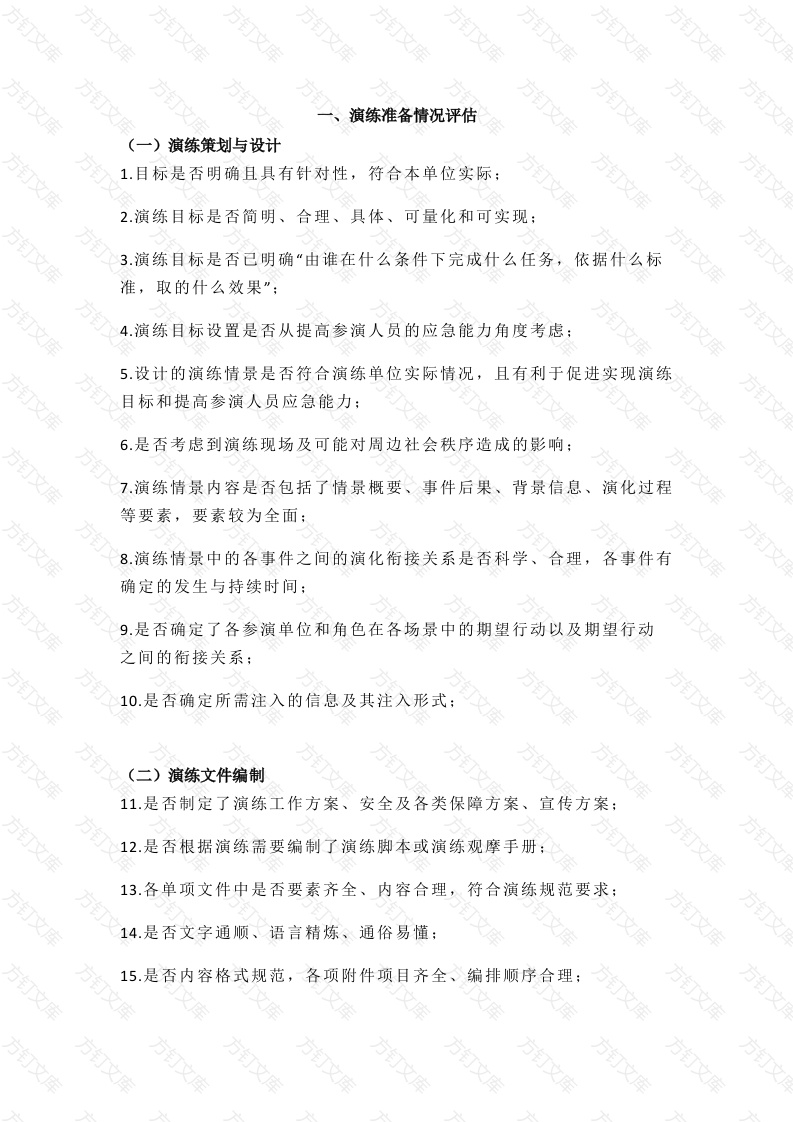 演练准备情况评估演练策划与设计1.目标是否明确且具有针对性,符合本单位实际:2.演练目标是否简明、合理、具体、可量化和可实现:3.演练目标是否已明确“由谁在什么条件下完成什么任务,依据什么标准,取的什么效果”;4.演练目标设置是否从提高参演人员的应急能力角度考虑:5.设计的演练情景是否符合演练单位实际情况,且有利于促进实现演练目标和提高参演人员应急能力:6.是否考虑到演练现场及可能对周边社会秩序造成的影响:7.演练情景内容是否包括了情景概要、事件后果、背景信息、演化过程等要素,要素较为全面:8.演练情景中的各事件之间的演化衔接关系是否科学、合理,各事件有确定的发生与持续时间:9.是否确定了各参演单位和角色在各场景中的期望行动以及期望行动之间的衔接关系:10.是否确定所需注入的信息及其注入形式:(二)演练文件编制11.是否制定了演练工作方案、安全及各类保障方案、宣传方案:12.是否根据演练需要编制了演练脚本或演练观摩手册:13.各单项文件中是否要素齐全、内容合理,符合演练规范要求:14.是否文字通顺、语言精炼、通俗易懂:15.是否内容格式规范,各项附件项目齐全、编排顺序合理:16.演练工作方案经过评审或报批:17.演练保障方案是否印发到演练的各保障部门:18演练宣传方案是否考虑到演练前、中、后各环节宣传需要:文19.编制的观摩手册中各项要素是否齐全、并有安全告知:20.人员是否分工明确,职责清晰,数量满足演练(事故救援)21.演练是否经费充足,保障充分:22.器材使用是否管理科学、规范,满足演练需要:23.场地选择是否符合演练策划情景设置要求,现场条件满足演练要求:(三)演练保障24演练活动安全保障条件是否准备到位并满足要求:25.是否充分考虑演练实施中可能面临的各种风险,制定必要的应急预方案或采取有效;26.参演人员是否能够确保自身安全的安全措施:文27.采用多种通信保障措施,有备份通信手段:28.是否对各项演练(事故救援)保障条件进行了检查确认:演练实施情况评估况评估万(一)预警与信息报告29.演练单位能够根据监测监控系统数据变化状况、事故险情紧急程度和发展势态或有关部门提供的预警信息进行预警30.演练单位有明确的预警条件、方式和方法:31.对有关部门提供的信息、现场人员发现险情或隐患进行及时预警:32.预警方式、方法和预警结果在演练中表现有效:33.演练单位内部信息通报系统能够及时投入使用,能够及时向有关部门和人员报告事故信息:34.演练中事故信息报告程序规范,符合应急预案要求:35.在规定时间内能够完成向上级主管部门和地方人民政府报告事故信息程序,并持续更新:36.能够快速向本单位以外的有关部门或单位、周边群众通报事故信息:37.演练单位是否能够依据应急预案快速确定事故的严重程度及等级:(二)紧急动员38.演练单位是否能够根据事故级别,启动相应的应急响应,采用有效的工作程序,警告、通知和动员相应范围内人员:39.演练是否单位能够通过总指挥或总指挥授权人员及时启动应急响应40.演练单位应急响应是否迅速,动员效果较好:41.演练单位在接到事故报告后,能够及时开展事故早期评估,获取事件的准确信息:(三)事故检测方方42.演练单位及相关单位能够持续跟踪、监测事故全过程:43.事故监测人员能够科学评估其潜在危害性:44.能够及时报告事态评估信息:(四)指挥与与研判45.现场指挥部能否及时成立,并确保其安全高效运转:方万万万