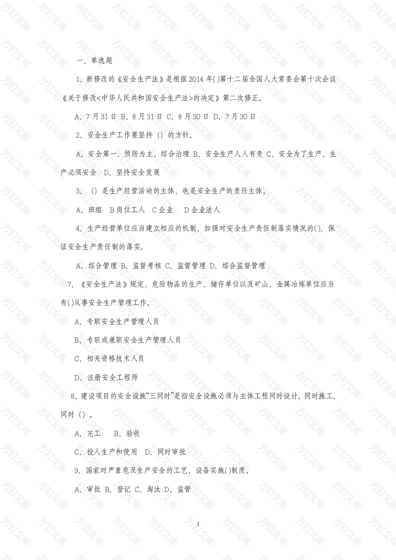 单选题1、新修改的《安全生产法》是根据2014年()第十二届全国人大常委会第十次会议《关于修改<中华人民共和国安全生产法>的决定》第二次修正,A、7月31日B、8月31日C、8月30日D、7月30日2、安全生产工作要坚持()的方针,A,安全第一、预防为主、综合治理B、安全生产人人有责C、安全为了生产,产必须安全D、坚持安全发展3、()是生产经营活动的主体,也是安全生产的责任主体。A、班组B岗位工人C企业D企业法人4,生产经营单位应当建立相应的机制,加强对安全生产责任制落实情况的(),保证安全生产责任制的落实。A、综合管理B、监督考核C、监督管理D、综合监督管理7、《安全生产法》规定,危险物品的生产、储存单位以及矿山、金属冶治炼单位应当有()从事安全生产管理工作A、专职安全生产管理人员文B、专职或兼职安全生产管理人员文C、相关资格技术人员D、注册安全工程师8、建设项目的安全设施“三同时”是指安全设施必须与主体工程同时设计、同时施工、同时()A、完工B、验收C、投人生产和使用D、同时审批9、国家对严重危及生产安全的工艺、设备实施()制度,A、审批B、登记C、淘汰D、监管万10、《国务院关于进一步加强企业安全生产工作的通知》指出,及时排查治理安全隐患,企业要经常性开展安全隐患排查,并切实做到整改措施、()、资金、时限和预案“五到位”A、设备B、人员C、责任D、制度11、依据《安全生产法》,事故调查处理应当按照()的原则,查清事故原因,查明事故性质和责任,A、实事求是、尊重科学B、公开、公正、公平C、及时、准确、合法D,科学严谨、依法依规、实事求是、注重实效12、《安全生产法》规定,有关协会组织依照法律、行政法规和章程,为生产经营单位提供安全生产方面的信息、培训等服务,发挥()作用,促进生产经营单位加强安全生产管理,A,监督B、综合监督C、监管D、自律13、依据《安全生产法》的规定,生产经营单位的从业人员有权了解其作业场所和工作岗位存在的危险因素、防范措施及0,文A、劳动用工情况B、安全技术措施C、安全投入资金情况D、事故应急措施14、特种作业人员必须持证上岗,严禁无证操作。取得《特种作业人员操作证》者每()年进行一次复审,未按期复审或复审不合格者操作证自行失效,文A、B、2D、515、有关地方人民政府、负有安全生产监督管理职责的部门,对生产安全事故隐瞒不报、谎报或者()的,对直接负责的主管人员和其他直接负责人员依法给予处分,A、拖延不报B、迟报C,被举报D、不报万文16、根据《安全生产法》的规定,发现危及从业人员生命安全情况时,工会有权()从业人员撤离危险场所,A、代表生产经营单位决定B、命令现场负责人组织C、向生产经营单位建议组织D、采取紧急措施指挥17、依据《安全生产法》的规定,从业人员发现直接危及人身安全的紧急情况时,可以()后撤离现场A、经安全管理人员同意B、经单位负责人批准文C,经现场负责人同意D、采取可能的应急措施18、《安全生产法》规定,矿山、金属治炼、建筑施工、道路运输单位和危险物品的生产、经营、储存单位,应当设置安全生产管理机构或者配备专职安全生产管理人员,上述以外的其他生产经营单位,从业人员超过()人的,应当设置安全生产管理机构或者配备专职安全生产管理人员,A、100B、400C、300D、20019、生产经营单位发生生产安全事故造成人员伤亡他人财产损失,拒不承担赔偿责任或者其负责人逃匿的、由()依法强制执行,A、人民法院B、安全生产监督管理部门公安机关D、劳动行政主管部门20,居民委员会、村民委员会对发现其所辖区域内的生产经营单位存在的事故隐患或者安全生产违法行为(),A,应当依法给予行政处罚B、应当立即下达整改通知万C、应当向当地人民政府或者有关部门报告D、必须向生产经营单位的安全管理部门举报文21、生产经营单位与从业人员订立的劳动合同,应当载明有关保障从业人员劳动安全和()的事项文