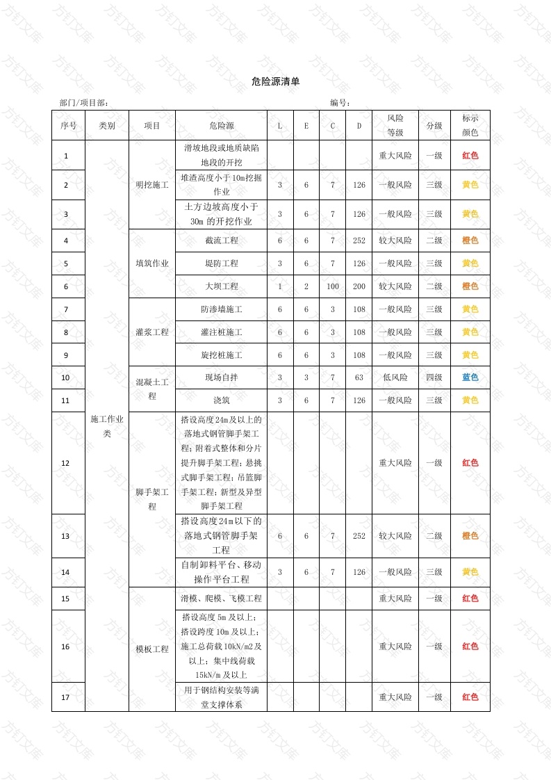 文文危险源清单方部门/项目部:编号:序号类别项目危险源风险标示LD等级分级颜色滑坡地段或地质缺陷重大风险级红色地段的开挖堆渣高度小于10m挖掘明挖施工37126一般风险三级黄色作业土方边坡高度小于7126般风险三级黄色30m的开挖作业截流工程6252较大风险二级橙色填筑作业堤防工程3126“般风险三级黄色大坝工程2100200较大风险二级登色防渗墙旄工6108般风险三级黄色灌浆工程灌注桩施工66108般风险三级黄色旋挖桩施工66108般风险三级黄色混凝土工现场自拌363低风险四级蓝色程浇筑36126般风险三级黄色搭设高度24m及以上的类落地式钢管脚手架工提升脚手架工程:悬挑重大风险红色式脚手架工程:吊篮脚脚手架工手架工程:新型及异型程脚手架工程搭设高度24m以下的13落地式钢管脚手架6252较大风险二级工程自制卸料平台、移动7126般风险三级黄色操作平台工程15滑模、爬模、飞模工程重大风险级红色搭设高度5m及以上:6模板工程施工总荷载10kN/m2及重大风险级红色以上:集中线荷载15kN/m及以上用于钢结构安装等满重大风险级红色堂支撑体系文文搭设高度5m以下:搭总荷载10kN/m以下:126般风险三级黄色集中线荷载15kN/m以下:其他非重大风险源所列内容的普通模板模板工程模板拆除36126般风险三级黄色20运输3648低风险四级蓝色钢筋工程焊接3126般风险三级黄色采用非常规起重设备、方法,且单件起吊重量重大风险级红色在1OkN及以上的起重吊装工程使用易爆、有毒和易腐23金属结构蚀的危险化学品进行重大风险红色制作、安作业24装及机电金属结构制作367126一般风险三级黄色设备安装采用常规起重设备、方法,或单件起吊重6252较大风险二级橙色量在10kW以下的起重吊装工程26施工作业高空作业及上下交667252较大风险二级类叉作业采取机械拆除,拆除高度大于10m:可能影响行人、交通、电力设施、通讯设施或其他建、构27筑物安全的拆除作业:重大风险级红色文物保护建筑、优秀历建筑物拆史建筑或历史文化风除貌区控制范围的拆除作业围堰拆除作业重大风险级红色采取机械拆除,拆除高度小于10m:其他非重7126三级黄色大风险源所列内容的般建筑物拆除配套电组立或整修杆塔27低风险四级蓝色网工程电线杆低风险四级蓝色降排水工程重大风险红色降排水降排水期间影响范3围内的建筑物3低风险四级蓝色降水井16318低风险四级蓝色工程船舶改造、船舶与-7陆用设备组合作业42低风险四级蓝色施工作业水上、水6水下焊接342低风险四级蓝色类下作业潜水作业42低风险四级蓝色252较大风险色有限空间作业人工挖孔桩7252较大风险二级管道安装管道3126般风险三级黄色采用非常规起重设备、方法,且单件起吊重量重大风险级红色起重吊装在10kN及以上的起重吊装工程及安装拆卸采用常规起重设备、方机械设备法,且单件起吊重量在67252较大风险二级登色类工程运输车辆运输车辆67252较大风险级大型施工机械的安装、6252较大风险级橙色特种设备运行及拆卸压力容器67126般风险三级黄色开挖深度≥5m的深基坑作业,或开挖深度虽未超过5m,但地质条件、周围环境和地下管重大风险级红色基坑线复杂,或影响毗邻建筑(构筑)物安全的深基坑作业开挖深度未超过5m47类15270较大风险的普通作业橙色材料设备参照《危险化学品重大危险源辨识》(GB18218-20188)标准,乙炔等危险化仓库、危学品和柴油等易燃品的储存量≥临界量时,为重大危险源(为重大风险,化品储存级风险,红色),并根据该标准确定重大危险源的级别,分级管理。如储存区量<临界量时,则为一般危险源,此时一律按照较大风险二级)进行管理。临时用电工程重大风险红色供电系统变压器210较大风险级