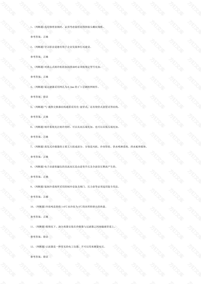 文文(判断)选用修理表阀时,必须考虑量程范围和接头螺纹规格方参考答案:正确2、(判断愿)学习职业道德有利于企业发展和行风建设。方参考答案:正确(判断愿)对离心式制冷机组加润滑油时必须按规定型号充加参考答案:正确4、(判断题)氨过滤器采用网孔为0.2m的23层钢网制作5、(判断圈)气-液热交换器结构通常采用壳-宜管式,还有绕管式套管式等结构参考答案:正确8、(判断)制冷系统充注制冷剂时,可以从高压端充加,参考答案:正确7、(判断)蒸发式冷凝器的主要五大组成部分,分别是风机、冷却管组、供水喷淋系统、挡水板和箱体参考答案:正确8、(判断圈)电子岗素检福仪的直流高压是由逆变升压及全波倍压整流产生的参考答案:正确9、(判断圈)氨制冷系统所采用的制冷设备及阀门、压力表等必须选用氨专用品参考答案:正确10、(判断愿)冷冻吨是指将1t0℃水冷冻为0℃的冰所转移出的热量,参考答案:正确方参考答案:错误12、(判断)示波器是一种常见的电工仪器,不可以用来测量电压。参考答案:错误万万万(判断圈)为了防止冰堵,所有制冷系统都应安装干操器参考答案:错误(判断愿)活塞式制冷压编机主要由机体、曲轴、连杆、活寒组、阀门、轴封、油泵、能量调节装置、油循环系统等部件组方参考答案:正确方(判断愿)溴化锂吸收式制冷机中的制冷剂是溴化锂参考答案:错误方16、(判断)国产冷冻机油现在执行的标准为行业标准,即SH034992行业标准40℃时的运动黏度分为12、2232、46、68、88六个君度等级考答案:错误17、(判断愿)在采用氨制冷的系统中不需要安装干操器恩考答案:正确18、(判断愿)气体混合爆炸的主要因素是温度、压力和着火源,而介质只是次要因素方参考答案:错误19、(判断题)冷凝器按其冷却介质和冷却方式,可以分为水冷式、空气冷却式、水和空气联合冷却式三种方参考答案:正确20、(判断愿)氨如果从制冷系统中泄漏出来,与空气混合达到一定比例,遇火即有火灾及爆炸危险。参考答案:正确21、(判断)精通业务与职业道德无关。方参考答案:错误22、(判断)制冷系统源氨必须在制冷系统气密性试验和制冷设备及管道隔热工程完成并经检验合格后进行参考答案:正确23、(判断)“三不伤害”是指不伤害自己、不伤害他人不被他人伤害参考答案:正确A万万考答案:错误(判断愿)溴化锂吸收式机组中,发生器中加热量突然增大可引起溴化锂溶液结品考答案:正确6、(判断愿)氨压力表的导压管可以根据实际情况连接到其他用途的管道上参考答案:错误方文方方27、(判断)我国制冷剂安全性分类,毒性分类分为A、B、C三个类别,制冷剂燃烧性危险程度分为1、2、3三个等级参考答案:正确28、(判断愿)压缩机根据其工作原理不同,可分为容积型压缩机和速度型压缩机两大类参考答案:正确方方29、(判断)影响输气系数的外淮漏为与吸气管隔离的基元容积间的淮漏参考答案:错误3、(判断愿)影响活塞式压编机排气量的主要因煮有:余隙容积损失、节流损失、预热损失、参考答案:正确31、(判断愿)溴化锂吸收式制冷运行时,如果吸收器液位过低,机组就无法将非凝性气体排出32、(判断愿)冷凝器是将制冷剂在制冷系统内吸收的热量传递给周围介质的热交换器考答案:正确33、(判断愿)在高压线下方堆料、施工作业时,必须要有严格可靠的安全防护措施参考答案:错误(判断愿)离心式制冷压缩机最常用的驱动机是可变速的电动机参考答案:错误35、(判断)祸旋式压编机的工作过程包括膨胀、吸气、压和排气参考答案:错误万