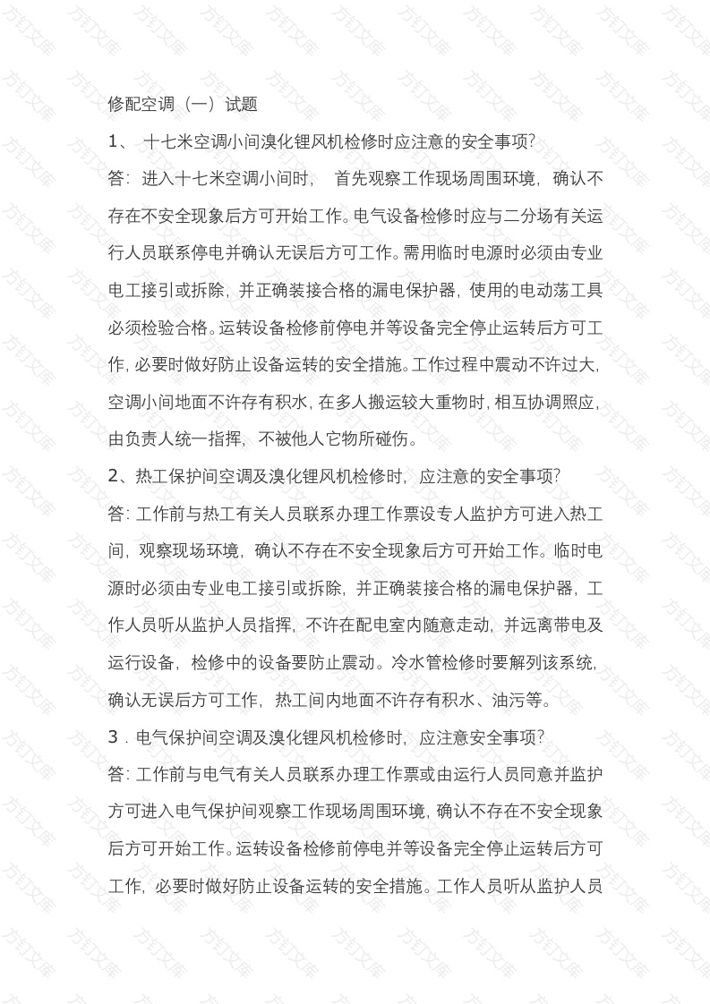 修配空调试题士七米空调小间溴化锂风机检修时应注意的安全事项?答:进入十七米空调小间时,首先观察工作现场周围环境,确认不存在不安全现象后方可开始工作。电气设备检修时应与二分场有关运行人员联系停电并确认无误后方可工作。需用临时电源时必须由专业电工接引或拆除,并正确装接合格的漏电保护器,使用的电动荡工具必须检验合格。运转设备检修前停电并等设备完全停止运转后方可工作,必要时做好防止设备运转的安全措施。工作过程中震动不许过大,空调小间地面不许存有积水,在多人搬运较大重物时,相互协调照应由负责人统一指挥,不被他人它物所碰伤。2、热工保护间空调及溴化锂风机检修时,应注意的安全事项?答:工作前与热工有关人员联系办理工作票设专人监护方可进入热工间,观察现场环境,确认不存在不安全现象后方可开始工作。临时电源时必须由专业电工接引或拆除,并正确装接合格的漏电保护器,工作人员听从监护人员指挥,不许在配电室内随意走动,并远离带电及运行设备,检修中的设备要防止震动。冷水管检修时要解列该系统确认无误后方可工作,热工间内地面不许存有积水、油污等。3.电气保护间空调及溴化锂风机检修时,应注意安全事项?答:工作前与电气有关人员联系办理工作票或由运行人员同意并监护方可进入电气保护间观察工作现场周围环境,确认不存在不安全现象后方可开始工作。运转设备检修前停电并等设备完全停止运转后方可工作,必要时做好防止设备运转的安全措施。工作人员听从监护人员指挥,不许在电气间内随意走动,并远离带电及运行设备,检修中的设备要防止震动。冷水管检修时要解列该系统,确认无误后方可工作电气间内地面不许存有积水、油污等。4.1千伏配电室溴化锂风机检修时,应注意安全事项?答:工作前与电气有关人员联系办理工作票或由运行人员同意并监护方可进入配电室观察工作现场周围环境,确认不存在不安全现象后方可开始工作。运转设备检修前停电并等设备完全停止运转后方可工作必要时做好防止设备运转的安全措施。工作人员听从监护人员指挥不许在配电室内随意走动,并远离带电及运行设备,检修中的设备要防止震动。冷水管检修时要解列该系统,确认无误后方可工作,配电室内地面不许存有积水、油污等。5·高空空调拆装时应做好哪些安全事项?答:凡在离地面1.5米及以上的地点进行空调拆装工作时的作业人员必须身体健康,饮酒、精神不振时,禁止登高作业。高出作业须先搭脚手架或采取防止坠落的措施,在设有脚手架或在设有栏杆的脚手架上工作时,必须使用试验合格的安全带,安全带必须挂在结实牢固的构件上,高出作业应一律使用工具袋,不准将工具及材料上下抛掷不准非工作人员在下面通行或逗留。6.焊接溴化锂冷媒水管道时应做好哪些安全事项?答:在溴化锂冷媒水管道焊接时必须由专门训练的人员进行焊接工作并使用合格的焊接工具设备和防护用具。关闭焊接处前端的进出水阀门放掉本系统内冷媒水确认系统内无水及压力后方可进行工作,工作场所必须备有必要的消防器材,焊接时必须设有防止金属焊渣反溅掉落引起火灾的措施,工作中不许有火种存在,工作完毕清理工作现场7、吊运大型制冷设备时,应做好的安全事项?答:吊运大型制冷设备时,必须办理起重工作票,并经有关领导批准起重机械仅限于使用方法并经考试合格,取得合格证的人员使用操作起重的工作负荷不准超过铭牌规定,起重时应有专人负责指挥,遇有大雾,照明不足,指挥人员看不清各工作地点或起重驾驶员看不见指挥人员时,不准进行起重作业,起重物品必须绑牢,吊钩要挂在物品的重心上,吊钩钢丝绳应保持垂直,起吊重物不准让其长期悬挂在空中,与工作无关人员禁止在起重工作区域内行走或停留,起重机正在吊物时,任何人不准在吊杆和吊物下停留或行走8、制冷设备检修的临时电源如何要求?答:检修如需要临时电源时,应由专业电工进行接引或拆除,临时电源接线必须按电气接线标准进行,开关处要正确装接合格的漏电保护器,所有临时电源线禁止使用花线或软皮塑料线,临时电源线必须远离热源(包括电、火焊作业的热体)不准阻碍步道、平台的正常通行。临时电源接线时不准用勾挂,缠绕的方法连接,必须使用现场应有的插座、插头或刀闸。9在梯子上进行空调检修时,应做好哪些安全事项?答:在梯子上进行空调检修时,必须是短时间可完成的工作,但梯子必须坚固完整并检验合格,在梯子上工作的总重量不准超过梯子所能