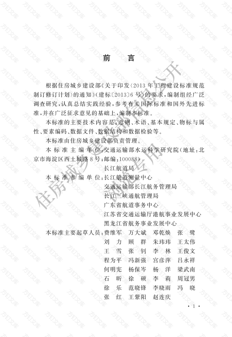 前言根据住房城乡建设部《关于印发〈2013年工程建设标准规范制订修订计划)的通知》(建标〔2013)6号的要求,编制组经广泛调查研究,认真总结实践经验,参考有关国际标准和国外先进标准,并在广泛征求意见的基础上,编制本标准本标准的主要技术内容是总则、术语、基本规定、物标与属性、要素编码、数据文件、数据结构和数据检验等本标准由住房城乡建设部负责管理。本标准主编单位:交通运输部水运科学研究院(地址:北京市海淀区西土8号;邮编:100088)长江航道局标准编单位:长江航道测量中心交通运输部长江航务管理局长江三峡通航管理局广东省航道事务中心江苏省交通运输厅港航事业发展中心黑龙江省航务事业发展中心本标准主要起草人员:费维军万大斌邓乾焕张鹭刘力顾群朱玮玮王太伟万文王雪张钊李林王俊文程为平冯新强宫彦萍吕永祥何明宪杨保岑杨洋梁武南石昕徐硕李莉周冠男徐乐范晓锋李晓雨冯晓张红王紫阳赵连庆万万本标准主要审查人员:解曼莹韩权卫元建胜肖京国郝春明徐斌胜韦扬甘朝华杨凯覃松住房城乡建设部信息公开方方方方浏览专用方方方订方订万钉万万万钉万方方文目次总则术语3基本规定3.1分类3.2单元3.3拓扑3.4数据源3.5数学基础3.6语言和字3.7度量单位物标与属性84.1数据模型特征物标分类84.3特征物标分组84.4特征物标间关系94.5特征物标几何图形要求(94.6特征物标属性基本要求95要素编码12)6数据文件(13)6.1交换集(136.2数据集(13)6.3文件命名与编码(14)6.4文件更新(14)文6.5文件检测ノ(15万万万