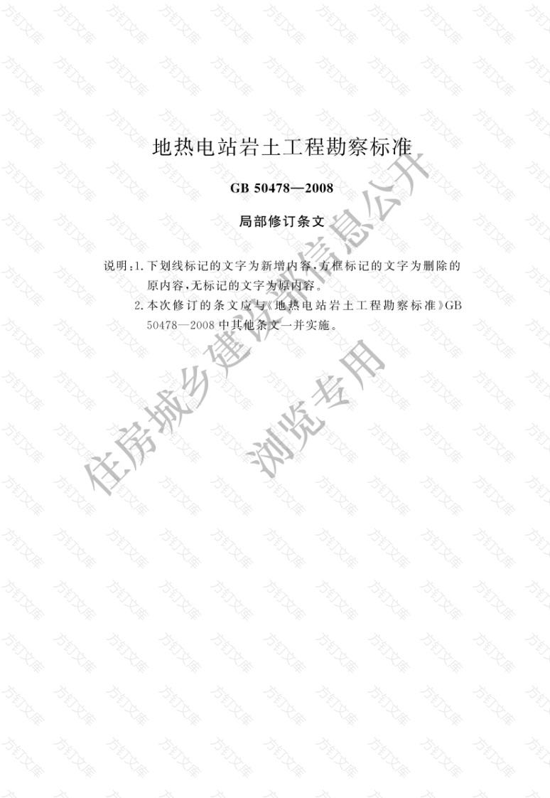 地热电站岩土工程勘察标准GB50478-2008局部修订条文说明:1.下划线标记的文字为新增内容,方框标记的文字为删除的原内容,无标记的文字为原内容2.本次修订的条文应与《地热电站岩土工程勘察标准》GB504782008其他条文并实施文住房城乡建浏览专用方方订万钉万文住房城乡建设部信息公开文方万浏览专用库方方文方方订次总则术语3基本规定3.1基本技术原则3.2建筑场地分类各勘察阶段任务和要求4.1初步可行性研究阶段勘察4.2可行性研究阶段勘察4.3初步设计阶段察4.4施工图设计阶段勘察各类建(构)筑物地段勘察115.1房地段115.2水工建(构)筑物地段11)电气建(构)筑物地段(12)5.4辅助、附属建(构)筑物地段(135.5地热井口地段……(13)5.6回灌建(构)筑物地段13)6专门岩土工程勘察(146.1活动断裂(146.2地震液化(14)6.3滑坡(15)6.4边坡(15)6.7(16)地下水勘察(17)万
