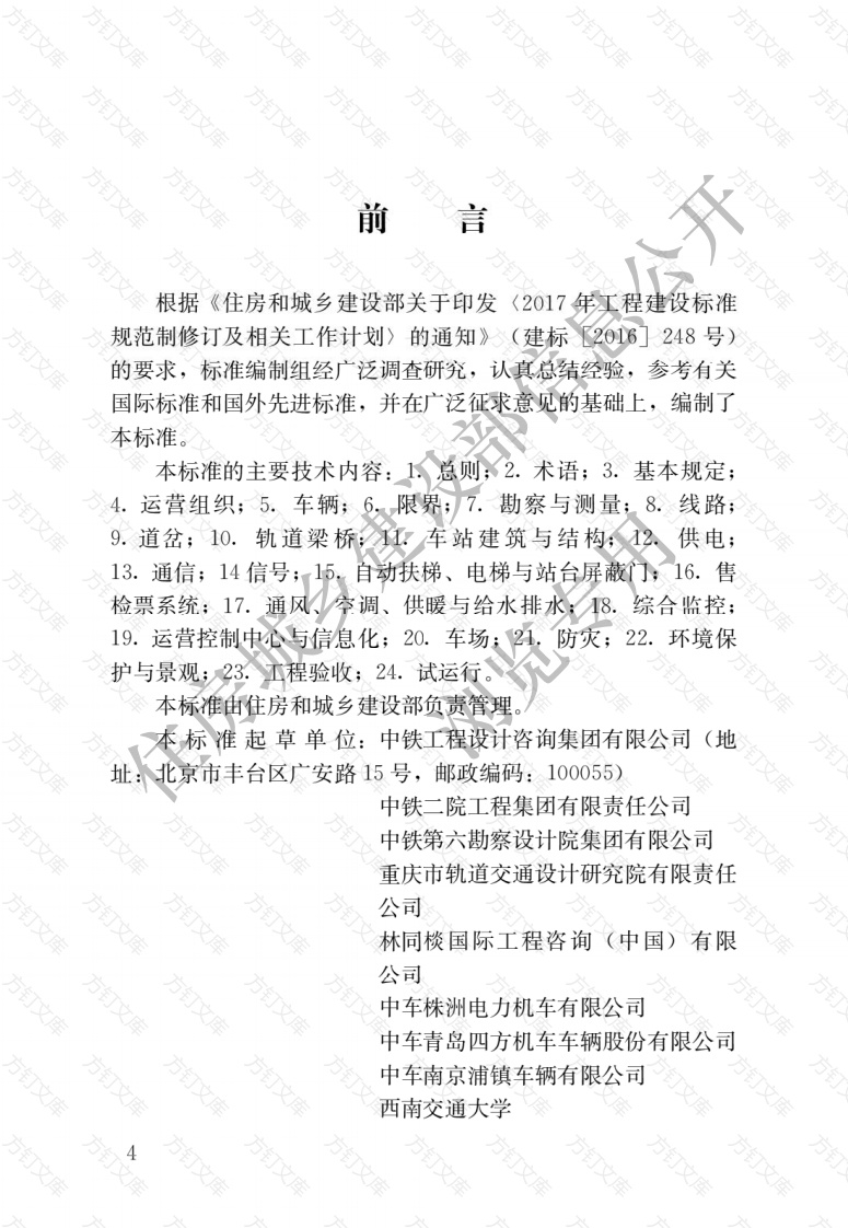 前言根据《住房和城乡建设部关于印发(2017年江程建设标准规范制修订及相关工作计划〉的通知》心248号)的要求,标准编制组经广泛调查研究,认真总结经验,参考有关国际标准和国外先进标准,并在广泛征求意见的基础上,编制了本标准。本标准的主要技术内容:1总则;2.术语;3.基本规定4.运营组织;5.车辆;6限界7.勘察与测量;8.线路;9.道岔;10.轨道梁桥红车站建筑与结构:①213.通信;14信号;15,自动扶梯、电梯与站台屏蔽们,16.售检票系统:17.通风令调、供暖与给水排水8.综合监控:19.22.环境保护与景观23五程验收;24.试运行。本标准由住房和城乡建设部负责管理本标准起草单位:中铁工程设计咨询集团有限公司(地址:北京市丰台区广安路15号,邮政编码:100055)中铁二院工程集团有限责任公司中铁第六勘察设计院集团有限公司重庆市轨道交通设计研究院有限责任方万公司林同棪国际工程咨询(中国)有限公司中车株洲电力机车有限公司中车青岛四方机车车辆股份有限公司中车南京浦镇车辆有限公司西南交通大学万万方北京交通大学通号空中快车有限公司中铁电气化局集团有限公司中铁科工集团有限公司中唐空铁集团有限公司北京中建空列集团有限公司本标准主要起草人员:仲建华武农周庆瑞雷慧锋徐升桥徐银光谢风华吴焕君俞兆磊刘玉文楚永萍方订刘培栋党春太张骎王凯刘俊陈舸蔡成标万文朱尔玉于胜利王力。欢郑聪尹小玲李小果志斌胡江民包晗郭子煜住房城乡贺伟刘安双李建华刘建友叶鄢红英苏磊张坤岳渠德宁大鹏罗兵陈耿豪李渊任为东李黎吴亮晓陈晓虎元庄道春解丽霞林云志王伯铭吴树强黄成名汪科成孙志辉胡庆立殷文华本标准主要审查人员:黄桂兴杨广武李文胜邓红元范金富张乃基韦苏来张丁盛金刘汉龙方万万文万万5文方方方目次总则术语3基本规定运营组织4.1般规定4.2系统运能4.3行车组织4.4运营配线4.5运营管理5车辆5.1般规定95.2车辆型式与列车编组125.3车体1313电气系统145.6制动系统155.7相关系统155.8安全与应急设施165.9试验与验收185.10标志185.11运输与质量保证期限196限界206.1般规定206.2基本参数216.3建筑限界216