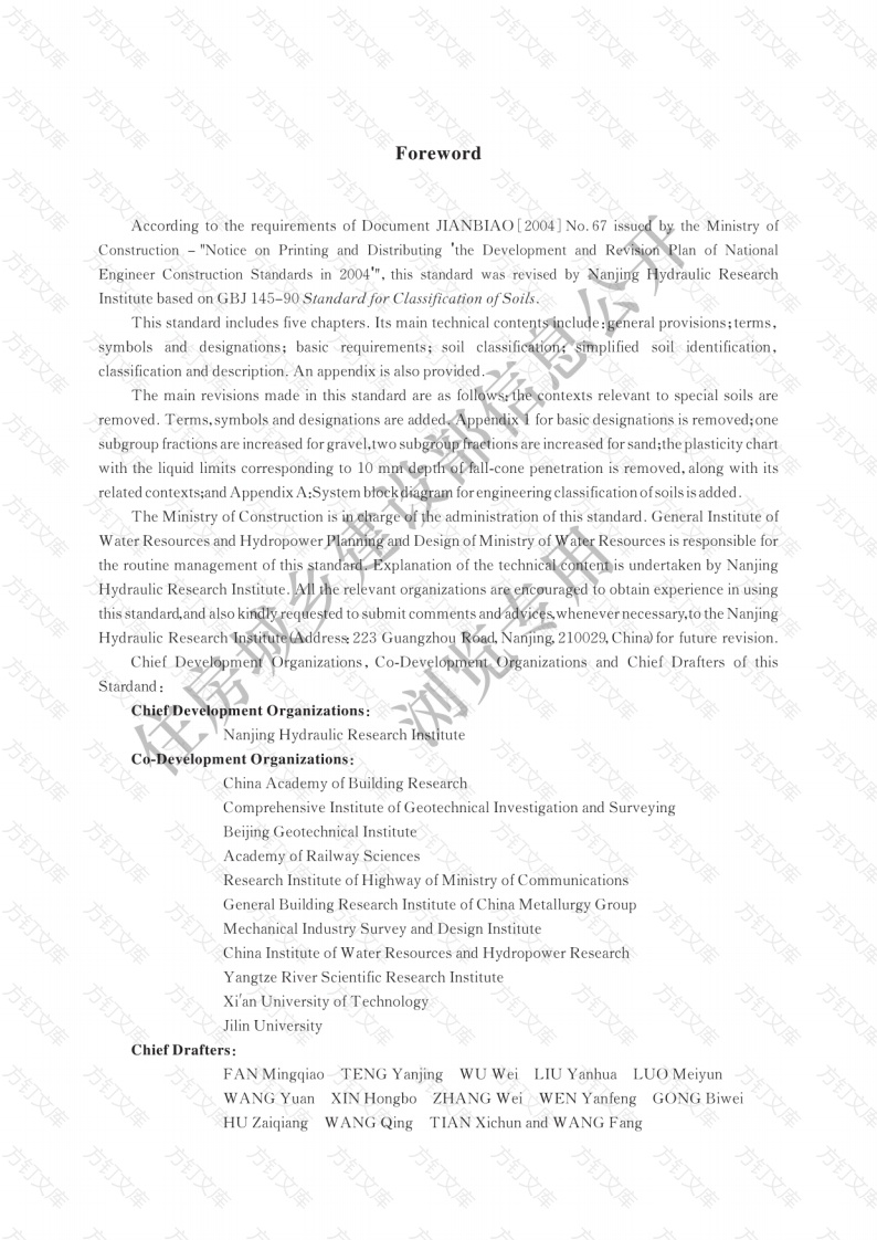 ForewordAccording to the requirements of Document JIANBIAO[2004]No.67 issued by the Ministry ofConstruction"Notice on Printing and Distributing 'the Development andRevision Plan of NationalEngineer Construction Standards in 2004",this standard was revised by NanjingHydraulic ResearchInstitute based on GBJ 145-90 Standard for Classification of SoilsThis standard includes five chapters.Its main technical contents include:general provisions;terms,symbols and designations:basic requirements;soil classification:simplified soil identification,classification and description.An appendix is also provided.The main revisions made in this standard are as follows:the contexts relevant to special soils areremoved.Terms.symbols and designations are added.Appendix 1 for basic designations is removed;onesubgroup fractions are increased for gravel,two subgroup fraetions are increased for sand;the plasticity chartwith the liquid limits corresponding to 10 mni depth of fall-cone penetration is removed,along with itsrelated contexts;and Appendix A:System block diagram for engineering classification ofsoils is added.The Ministry of Construction is in eharge of the administration of this standard.General Institute ofWater Resources and Hydropower Planning and Design of Ministry of Water Resources is responsible forthe routine management of this standard.Explanation of the technical content is undertaken by NanjingHydraulic Research Institute.All the relevant organizations are encouraged to obtain experience in usingthis standard,and also kindly requested to submit comments and advices whenever necessary.to the NanjingHydraulic Research Institute(Address 223 Guangzhou Road,Nanjing 210029,China for future revision.Chief DevelopmentOrganizations.Co-Development OrganizationsandChief Drafters of thisStardand:Chief Development OrganizationsNanjing Hydraulic ResearchCo-Deyelopment Organizations:China Academy of Building ResearchComprehensive Institute of Geotechnical Investigation andSurveyingBeijing Geotechnical InstituteAcademy of Railway SciencesResearch Institute of Highway of Ministry of CommunicationsGeneral Building Research Institute of China Metallurgy GroupMechanical Industry Survey and Design InstituteChina Institute of Water Resources and Hydropower Research方Yangtze River Scientific Research InstituteXi'an University of TechnologyJilin UniversityChief Drafters:FAN Mingqiao TENG YanjingWU Wei LIU YanhuaLUO MeiyunWANG YuanXIN HongboZHANG Wei WEN YanfengGONG BiweiHU ZaiqiangWANG QingTIAN Xichun and WANG Fang方住房城乡建设部信息公开方方文浏览专用方方方万文ContentsGeneral provisions'(1)2Terms,symbols and designations(22.2 Symbols..(2)2.3 Designations.......(3)3、Basic stipulations4 Soil classification5Simplified identification,classification,and description9)5.1 Simplified Identification methods95.2 Identification and classification(10)5.3 Soil description(10)001(12)14)住房城乡建Appendix ASystem block diagram forExplanation of wording in this standa浏览专用