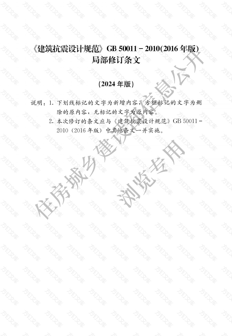 建筑抗震设计规范)GB50011-2010(2016年版)局部修订条文(2024年版)说明:1.下划线标记的文字为新增内容,方框标记的文字为删除的原内容,无标记的文字为原内容2.本次修订的条文应与《建筑抗震设计规范》GB500112010(2016年版)并实施万文住房城乡建浏览专用方方万局部修订说明本次局部修订系根据住房和城乡建设部标准定额司《关于同意开展〈建筑工程抗震设防分类标准〉等2项国家标准局部修订工作的函》(2021-36)的要求,由中国建筑科学研究院有限公司会同有关单位对《建筑抗震设计规范GB50011-2010(2016年版)进行局部修订而成本次局部修订的主要内容是:()根据《建设工程抗震管理条例》和《建筑与市政工程抗震通用规范》GB55002-2021的要求,对个别条文进行协调性修订;(2)根据《建筑抗震设计规范》GB50011-2010(2016年版)实施以来各方反馈的意见和建议,对部分条款进行文字性调整。本次局部修订共涉及9个条文,分别为31.3条、3.9.2条、3.10.1条310,2条、3.10.3条、3.10.5条本次局部修订起草单位:中国建筑科学研究院有限公司中国机械工业集团公司中国电子工程设计院中国建筑西南设计研究院有限公司中国建筑标准设计研究院有限方公司北京市建筑设计研究院有限公司中国地震局地球物理研究所同济大学清华大学万万广州大学北京建筑大学本次局部修订主要起草人员:黄世敏罗开海王亚勇周福霖徐建娄冯远郁银泉薛慧立曾德民潘鹏蒋欢军李小军乔雨蒙本次局部修订主要审查人员:杜修力王立军丁永君杨琦朱兆晴许秋华王昌兴薛尚铃文住房城乡建设方浏览专用方方方万