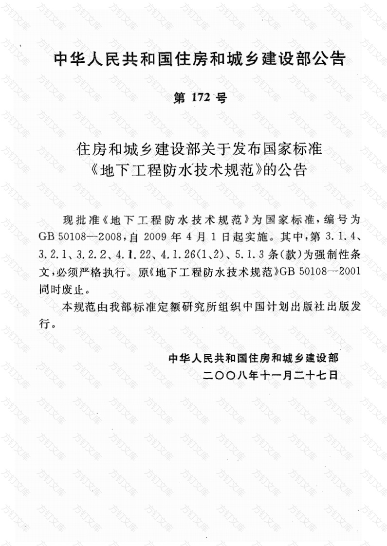 中华人民共和国住房和城乡建设部公告第172号万文住房和城乡建设部关于发布国家标准《地下工程防水技术规范》的公告现批准《地下工程防水技术规范》为国家标淮,编号为GB50108一2008,自2009年4月1日起实施。其中,第3.1.4、3.2.1、3.2.2、4.1.22、4.1.26(1、2)、5.1.3条(款)为强制性条文,必须严格执行。原《地下工程防水技术规范》GB50108一2001同时废止。本规范由我部标准定额研究所组织中国计划出版社出版发行。文中华人民共和国住房和城乡建设部方本规范是根据建设部“关于印发《2005年工程建设标准规范制定、修订计划(第一批)》的通知”建标函〔2005)84号的要求,由总参工程兵科研三所会同有关单位,对国家标准《地下工程防水技术规范》GB50108一2001进行修订的基础上编制完成的。本规范共分10章,主要内容包括:总则;术语;地下工程防水设计;地下工程混凝土结构主体防水;地下工程混凝土结构细部构造防水;地下工程排水;注浆防水;特殊施工法的结构防水;地下工程渗漏水治理;其他规定。本次修编的主要内容是:提高了防水等级为二级的地下工程防水标准;增加新的防水材料和防水施工技术;与国内外相关规范协调与接轨;重视结构耐久性和环境保护;淘汰落后的防水材料,对不适应国家发展要求的条文进行修改。本规范中以黑体字标志的条文为强制性条文,必须严格执行。本规范由住房和城乡建设部负责管理和对强制性条文的解释,由国家人民防空办公室负责日常管理,由总参工程兵科研三所负责具体技术内容的解释。本规范在执行过程中,请各单位结合工程实践,认真总结经验,注意积累资料,随时将意见和建议反馈给总参工程兵科研三所(地址:河南洛阳,总参工程兵科研三所,邮政编码:471023),以供今后修订时参考。本规范主编单位、参编单位和主要起草人:主编单位:总参工程兵科研三所文参编单位:山西建筑工程(集团)总公司中冶集团建筑研究总院上海市隧道工程轨道交通设计研究院方文中铁工程设计咨询集团有限公司中国建筑科学研究院中铁隧道集团有限公司科研所深圳大学建筑设计研究院中国建筑业协会建筑防水分会北京城建设计研究总院有限责任公司中国建筑防水材料工业协会主要起草人:冀文政朱忠厚张玉玲朱祖熹姚源道李承刚李治国蔡庆华雷志梁张道真曲慧郭德友卓越哈成德沈秀芳潘水艳方方方方方方方订方方方万万