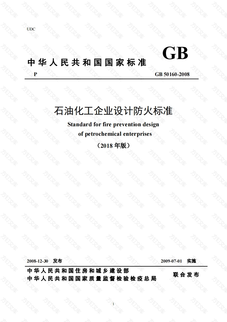 万万万中华人民共和国国家标准GB50160-2008石油化工企业设计防火标准方Standard for fire prevention design方of petrochemical enterprises(2018年版)方订方方订方万方万2008-12-30发布2009-07-01实施中华人民共和国住房和城乡建设部中华人民共和国国家质量监督检验检疫总局联合发布万中华人民共和国国家标准石油化工企业设计防火标准Standard for fire prevention design方of petrochemical enterprisesGB50160-2008(2018年版)方主编部门:中国石油化工集团公司批准部门:中华人民共和国住房和城乡建设部施行日期:2009年7月1日方方方中国计划出版社方2018北京万文石油化工企业设计防火规范GB50160-2008关于发布国家标准《石油化工企业设计防火规范》的公告现批准《石油化工企业设计防火规范》为国家标准,编号为GB50160-2008,自2009年7月1日起实施。其中,第4.1.6、4.1.8、4.1.9、4.2.12、4.4.6、5.1.3、5.2.1、5.2.7、5.2.16、5.2.18(2、3、5)、5.3.31、2)、5.3.4、5.5.1、5.5.2、5.5.12、5.5.13、5.5.14、5.5.17、5.5.21(1、2)、5.6.1、6.2.6、6.2.8、6.3.2(1、2、4、5)、6.3.6、6.4.1(2、3)、6.4.2(6)、6.4.3(1、2)、6.4.41)、6.5.1(2)6.6.3、6.6.5、7.1.4、7.22、7.2.16、7.3.3、8.3.1、8.3.8、8.4.5(1)、8.7.2(1、2)、8.10.1、8.10.4(1、2、3)、8.12.1、8.12.2(1)、9.1.4、9.2.31)、9.3.1条(款)为强制性条文,必须严格执行。原《石油化工企业设计防火规范》GB50160-92(1999年版)同时废止。本规范由我部标准定额研究所组织中国计划出版社出版发行。中华人民共和国住房和城乡建设部OO八年十二月三十日文方文方万