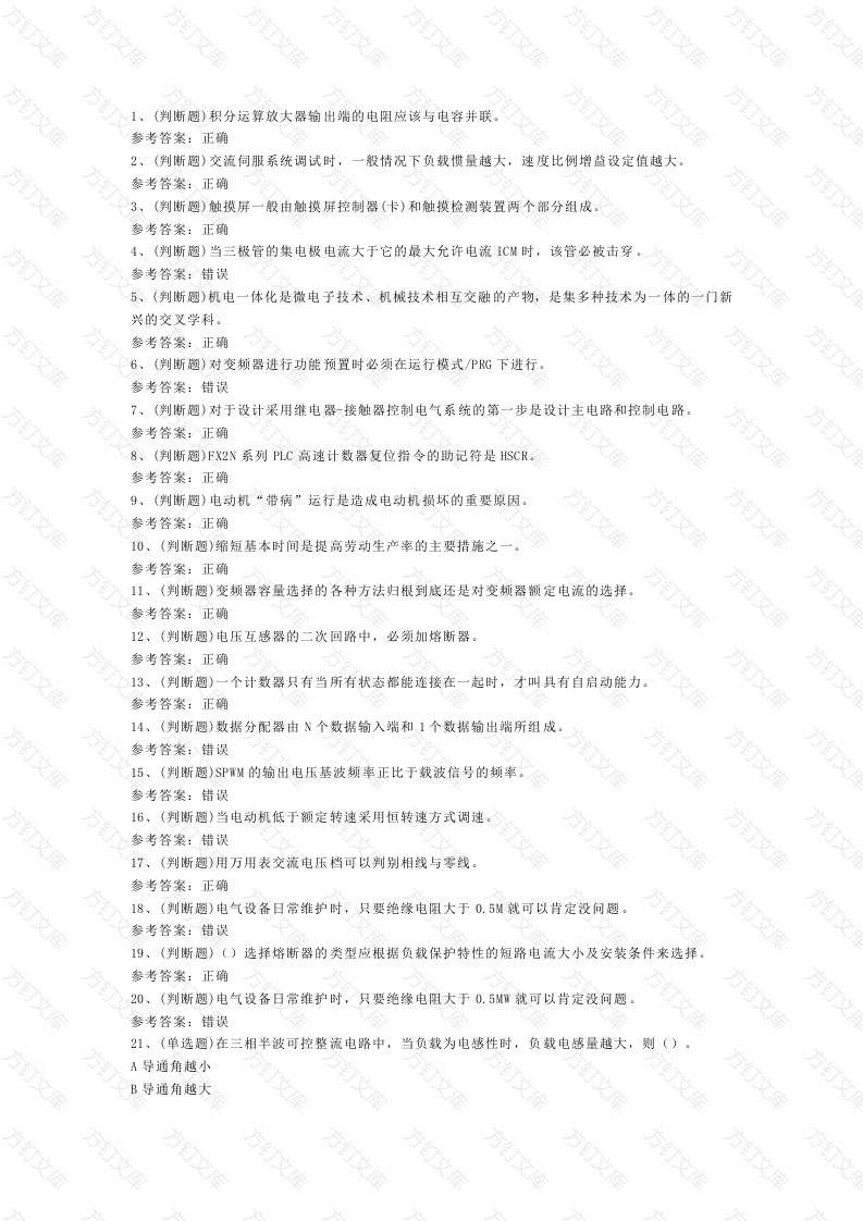 (判断题)积分运算放大器输出端的电阻应该与电容并联参考答案:正确2、(判断趣)交流伺服系统调试时,般情况下负载惯量越大,速度比例增益设定值越大。参考答案:正确3、(判断趣)触摸屏一般由触摸屏控制器(卡)和触摸检测装置两个部分组成。参考答案:正确4、(判断趣)当三极管的集电极电流大于它的最大允许电流ICM时,该管必被击穿参考答案:错误5、(判断趣)机电一体化是微电子技术、机械技术相互交融的产物,是集多种技术为体的一门新兴的交叉学科。参考答案:正确6、(判断题)对变频器进行功能预置时必须在运行模式PG下进行文参考答案:错误7、(判断趣)对于设计采用继电器-接触器控制电气系统的第步是设计主电路和控制电路。参考答案:正确8、(判断趣)FX2N系列PLC高速计数器复位指令的助记符是HSCR。参考答案:正确9、(判断趣)电动机“带病”运行是造成电动机损坏的重要原因参考答案:正确万10、(判断趣)缩短基本时间是提高劳动生产率的主要措施之参考答案:正确11、(判断趣)变频器容量选择的各种方法归根到底还是对变频器额定电流的选择参考答案:正确12、(判断趣)电压互感器的二次回路中,必须加熔断器。参考答案:正确13、(判断趣)一个计数器只有当所有状态都能连接在一起时,才叫具有自启动能力参考答案:正确14、(判断趣)数据分配器由N个数据输入端和1个数据输出端所组成。参考答案:错误15、(判断趣)SPWM的输出电压基波频率正比于载波信号的频率。参考答案:错误16、(判断趣)当电动机低于额定转速采用恒转速方式调速参考答案:错误17、(判断趣)用万用表交流电压档可以判别相线与零线。参考答案:正确18、(判断@)电气设备日常维护时,只要绝缘电阻大于0.5M就可以肯定没问趣参考答案:错误19、(判断趣)()选择熔断器的类型应根据负载保护特性的短路电流大小及安装条件来选择参考答案:正确20、(判断趣)电气设备日常维护时,只要绐缘电阻大于0.5MW就可以肯定没问题参考答案:错误万文21、(单选题)在三相半波可控整流电路中,当负载为电感性时,负载电感量越大,则()A导通角越小B导通角越大VC输出电压越高D输出电压越低参考答案:B22、(单选题)PLC模拟量输出模块使用时不需要设置的参数是A输出模式选择B通道选择C转换速度D输出保持模式参考答案:C23、(单选题)使用电解电容时()A负极接高电位,正极接低电位B正极接高电位,负极接低电位方文方C负极接高电位,负极也可以接低电位D不分正负极参考答案:B24、(单选趣)伺服系统是使物体的位置、方位状态等输出被控量能够跟随输入目标值或给定量的任意变化而变化的A自动控制系统BPLC控制系统文文C微机控制系统D过程控制系统参考答案:A25、(单选趣)为GT0符号B参考答案:26、(单选趣)变频器的输出不允许接A纯电阻B电感C电容器D电动机参考答案:C27、(单选趣)根据()的要求,路数据分配到指定输出通道上去的电路,称为数据分配器A电源信号B数据信号C频率信号D地址信号参考答案:D28、(单选@)PLC模拟量输入模块使用时需要设置通道选择、转换速度、等参数A放大倍数B触发方式C平均值与最大值D偏移量与增益值参考答案:D29、(单选趣)步进电机方向控制靠什么信号?A开关量信号B模拟量信号C继电器换向D接触器换向参考答案:A30、(单选趣)FX2N系列PLC的字逻辑运算指令有字逻辑与,字逻辑或和A字逻辑与非B字逻辑或非C字逻辑异或D字逻辑非参考答案:C31、(单选趣)伺服电动机具有控制精度高、过载能力强、启动转矩大、动态响应快、调速范围宽机械特性和调速特性的线性度高等特点。A效率高B无自转现象C价格低万D容量大参考答案:B32、(单选题)电气设备定期检修的目的是及时发现保证设备的安全运行A停电现象B电路断线C电机过载D故障隐患参考答案:D33、(单选趣)关于道德,准确的说法是A道德就是做好人好事B做事符合他人利益就是有道德方C道德是处理人与人、人与社会、人与自然之间关系的特殊行为规范D道德因人、因时而异,没有确定的标准参考答案:C34、(单选题)进口电气设备标牌上的英文词汇“senser”的中文意思是A传感器B报警器C继电器文D备用参考答案:35、(单选趣)电子测量装置电源变压器采用三层屏蔽防护。一次侧屏蔽层应连向A装置的金属外壳B大地C装置内的防护地D中线万