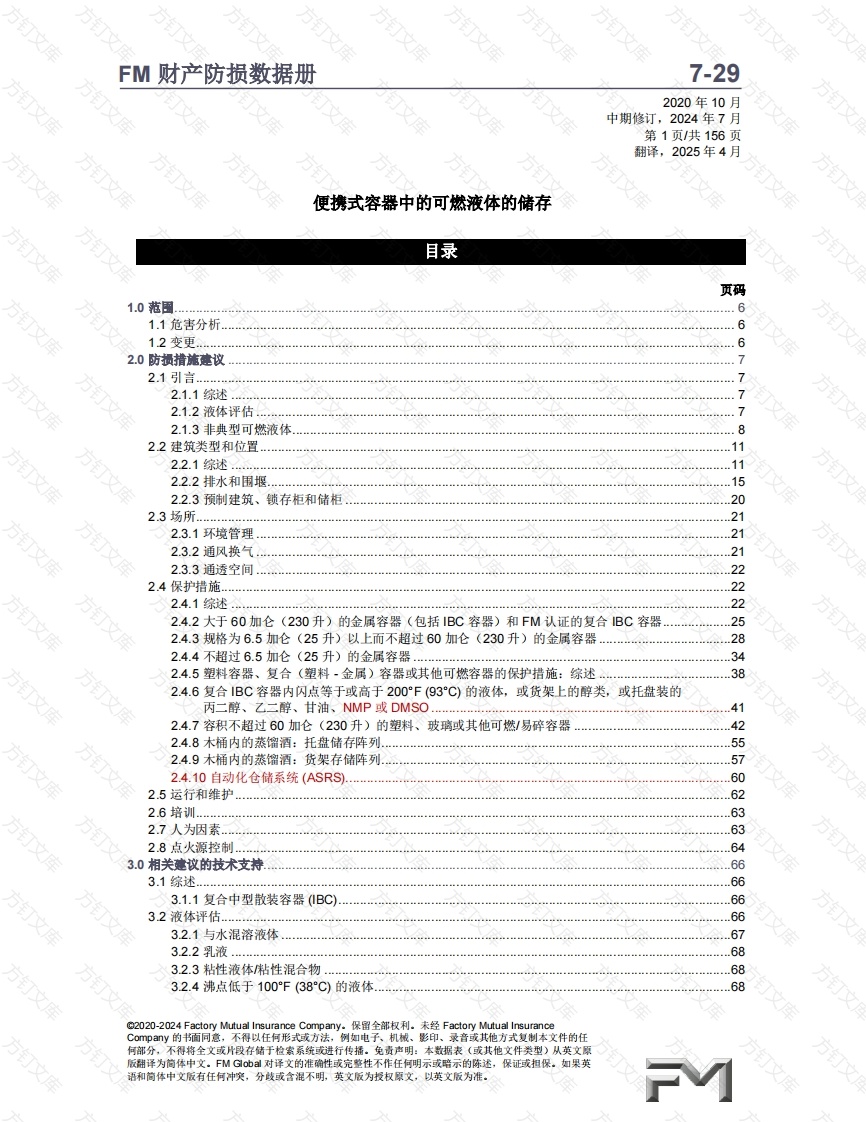 FM财产防损数据册7-292020年10月中期修订,2024年7月第1页/共156页翻译,2025年4月便携式容器中的可燃液体的储存目录页码1.1危害分析612变更…2.0防损措施建议72.1引言72.1.1综述2.1.2液体评估.72.1.3非典型可燃液体22建筑类型和位置1122.1综述.112.2.2排水和围堰2.2.3预制建筑、锁存柜和储柜202.3场所212.3.1环境管理212.3.2通风换气212.3.3通透空间22.4保护措施.222.4.1综述22.4.2大于60加仑(230升)的金属容器(包括IBC容器)和FM认证的复合BC容器252.4.3规格为6.5加仑(25升)以上而不超过60加仑(230升)的金属容器282.4.4不超过6.5加仑(25升)的金属容器.342.4.5塑料容器、复合(塑料-金属)容器或其他可燃容器的保护措施:综述382.4.6复合IBC容器内闪点等于或高于200°F(93C)的液体,或货架上的醇类,或托盘装的丙二醇、乙二醇、甘油、NMP或DMSO..412.4.7容积不超过60加伦(230升)的塑料、玻璃或其他可燃/易碎容器…422.4.8木桶内的蒸馏酒:托盘储存阵列.2.4.9木桶内的蒸馏酒:货架存储阵列.572.4.10自动化仓储系统(ASRS)602.5运行和维护622.6培训632.8点火源控制.643.0相关建议的技术支持663.1综述.663.1.1复合中型散装容器(BC)3.2液体评估663.2.1与水混溶液体673.2.2乳液683.2.3粘性液体粘性混合物683.2.4沸点低于100℉(38C)的液体2020-2024 Factory Mutual Insurance Company.保留全部权利.未经Factory Mutual InsuranceCompany的书面同意,不得以任何形式或方法,例如电子、机械、影印、录音或其他方式复制本文件的任何部分,不得将全文或片段存储于检索系统或进行传播。免责声明:本数据表(或其他文件类型)从英文原饭甜译为简体中文·FMGb对译文的准确性或完整性不作任何明示或暗示的陈述,保证或担保。如果英语和简体中文版有任何冲突,分歧或含混不明,英文版为授权原文,以英文版为准。7-29便携式容器中的可燃液体的储存第2页FM财产防损数据册32.5比重大于1的液体683.2.6非典型可燃液体3.3建筑类型和位置703.4通风换气.03.5保护措施.713.5.1综述713.5.2自动喷淋系统3.5.3特殊保护系统713.5.4金属容器713.5.5塑料容器、复合(塑料·金属)容器或其他可燃容器的保护措施:综述723.6运行和维护723.7培训…73.8点火源控制74.0参考文献724.2 NFPA7373附录A术语表73附录B文件修订记录77附录C NFPA标准81附录D工作辅助工具82D.1消防表格中使用的缩写82D2消防图解82D.2.1货架内喷淋头布置图82D2.2消防保护方案.130D2.2.1消防方案A130D2.2.2消防方案B136D2.2.3消防方案C141D2.2.4消防方案D145D2.2.5消防(保护)方案E150D2.2.6消防方案F152附录E钢柱的保护156附录F燃烧液体的分类156F.1可燃液体分类表156示意图清单图2.21.1.可燃液体仓储场所位置和建筑类型:室外货场、独立的低价值建筑、有消防保护的独立建筑物和隔断室。12图2.2.3.1.1.预制式可燃液体仓储建筑(PLSB)20图2.2.3.2.可燃液体存放柜21图2.4.8.2托盘存储阵列之间的最小通透空间(平面图)55图2.4.8.3A.装货通道的挡烟垂壁布置(平面图)56图2.4.8.3.B.装货通道的排水沟布置(平面图)6图2.4.9.1.容器桶货架上横放对通透空间和人行过道的布局要求(平面图)图A.1.平面图(白色区域表示开放面积比例)74图D.2.1.1.单排货架的喷淋头布置:BC消防保护方案82图D.2.12.单排货架的喷淋头布置:BC消防保护方案83图D.2.1.3.双排货架的喷淋头布置:BC消防保护方案84图D.2.1.4.单排货架的喷淋头布置:容器桶消防保护方案图D.2.1.5.双排货架的喷淋头布置:容器桶消防保护方案86图D.2.1.6.双排货架的喷淋头布置:容器桶消防保护方案872020-2024 Factory便携式容器中的可燃液体的储存7-29FM财产防损数据册第3页图D.2.1.7.多排货架时的喷淋头布置:容器桶消防保护方案(立面图)88图D.2.1.8.多排货架时的喷淋头布置:容器桶消防保护方案(平面图)图D.2.1.9单排货架的喷淋头布置:容器桶消防保护方案90图D.2.1.10.双排货架的喷淋头布置:容器桶消防保护方案91图D.2.1.11.单排货架时的喷淋头布置:容器桶消防保护方案92图D.2.1.12双排货架时的喷淋头布置:容器桶消防保护方案93图D.2.1.13.单排货架时的喷淋头布置:容器桶消防保护方案94图D.2.1.14.双排货架时的喷淋头布置:容器桶消防保护方案95图D.2.1.15.单排货架时的喷淋头布置:容器桶消防保护方案图D.2.1.16.双排货架时的喷淋头布置:容器桶消防保护方案图D.2.1.17.单排货架时的喷淋头布置:小型金属容器98图D.2.1.18.双排货架时的喷淋头布置:小型金属容器(有面装喷淋头)99图D.2.1.19.双排货架时的喷淋头布置:小型金属容器(无面装喷淋头)100图D.2.120.多排货架时的喷淋头布置:小型金属容器(立面图)101图D.2.121.多排货架时的喷淋头布置:小型金属容器(平面图)102图D.2.122.单排货架时的喷淋头布置:小型金属容器内的与水混溶液体103图D.2.123.双排货架时的喷淋头布置:小型金属容器内的与水混溶液体104图D.2.124.多排货架时的喷淋头布置:小型金属容器内的与水混溶液体(立面图)105图D.2.125.多排货架时的喷淋头布置:小型金属容器内的与水混溶液体(平面图)106图D.2.126.单排货架时的喷淋头布置:快速响应喷淋头消防方案107图D.2.127.双排货架时的喷淋头布置:快速响应喷淋头消防方案108图D.2.128.单排货架时的喷淋头布置:快速响应喷淋头消防方案109图D.2.129.双排货架时的喷淋头布置:快速响应喷淋头消防方案110图D.2.1.30.单排货架时的喷淋头布置:快速响应喷淋头消防方案111图D.2.1.31.双排货架时的喷淋头布置:快速响应喷淋头消防方案.112图D.2.1.32单排货架时的喷淋头布置:快速响应