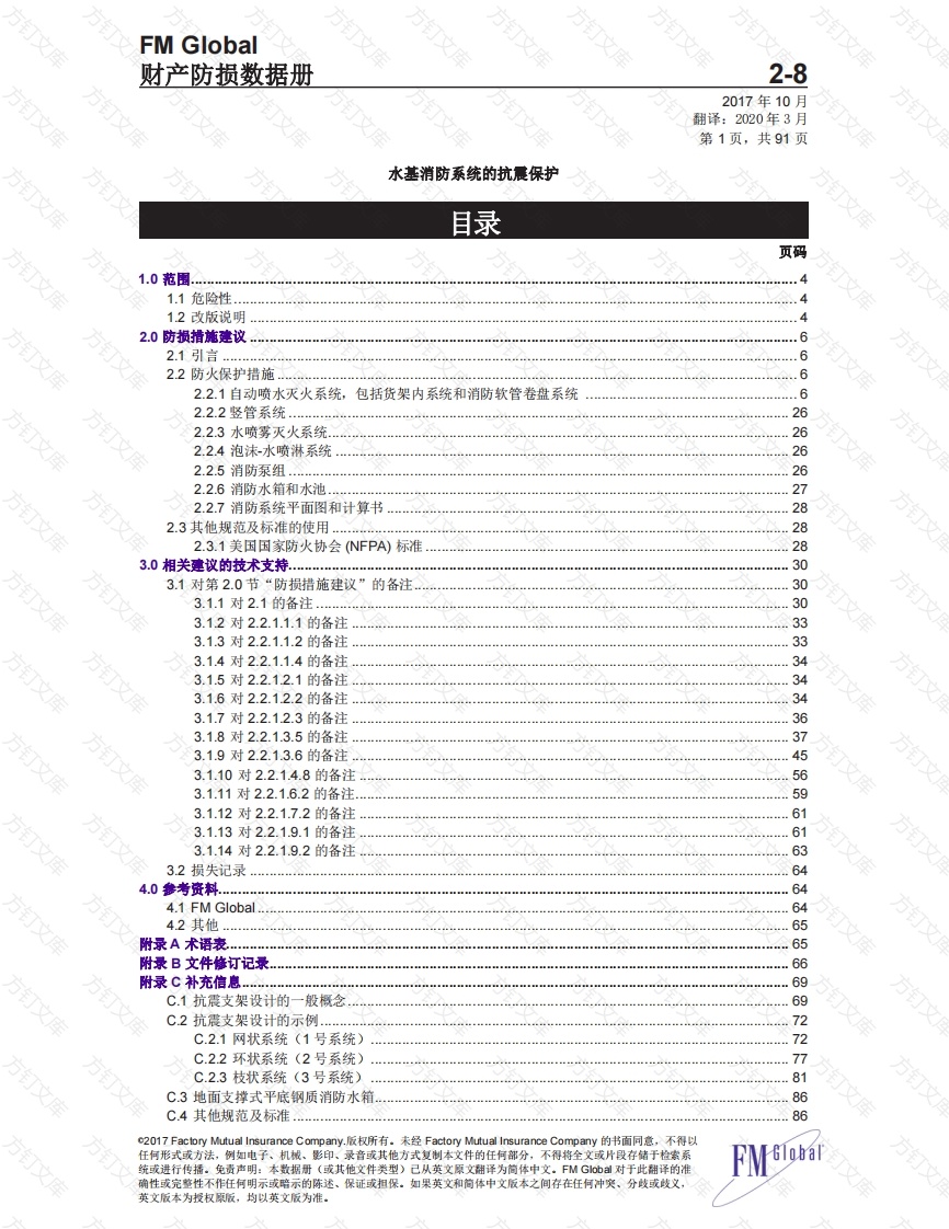 FM Global财产防损数据册2-82017年10月翻译:2020年3月第1页,共91页水基消防系统的抗晨保护目录页码1.0范围…41.1危险性412改版说明2.0防损措施建议62.1引言…62.2防火保护措施62.2.1自动喷水灭火系统,包括货架内系统和消防软管卷盘系统62.2.2竖管系统262.2.3水喷雾灭火系统262.2.4泡沫-水喷淋系统262.2.5消防泵组,262.2.6消防水箱和水池.272.2.7消防系统平面图和计算书282.3其他规范及标准的使用…2.3.1美国国家防火协会(NFPA)标准283.0相关建议的技术支持.……3.1对第2.0节“防损措施建议”的备注3.1.1对2.1的备注…303.12对2.2.1.1.1的备注33.1.3对2.2.1.1.2的备注333.14对2.2.1.1.4的备注343.1.5对2.2.12.1的备注3.1.6对2.2.12.2的备注33.1.7对2.2.12.3的备注3.1.8对2.2.1.3.5的备注373.1.9对2.2.1.3.6的备注453.1.10对2.2.14.8的备注563.1.11对2.2.1.6.2的备注3.1.12对2.2.1.7.2的备注613.1.13对2.2.1.9.1的备注613.1.14对2.2.1.9.2的备注3.2损失记录4.0参考资料644.1 FM Global.6465附录A术语表65附录B文件修订记录66附录C补充信息…69C1抗震支架设计的一般概念69C2抗震支架设计的示例…C.2.1网状系统(1号系统)72C.22环状系统(2号系统)77C.2.3枝状系统(3号系统)81C.3地面支撑式平底钢质消防水箱.86C.4其他规范及标准86c2017 Factory Mutual Insurance Company.版权所有。未经Factory Mutual Insurance Company的书面同意,不得以任何形式或方法,例如电子、机械、影印、录音或其他方式复制本文件的任何部分,不得将全文或片段存储于检索系统或进行传播。免责声明:本数据册(或其他文件类型)已从英文原文甜译为简体中文。FMGb对于此翻译的准确性或完整性不作任何明示或暗示的陈述、保证或担保。如果英文和简体中文假本之间存在任何冲突、分歧或歧义,2-8抗震保护第2页M Globa财产防损数据册附录D对第22节“相关建议”的工作帮助7示意图清单图2.2.1.12.总管供水式立管的布置.7图2.2.1.3.5-A水平管道上使用一个垂直支排和一个斜排的侧向或纵向垂直抗晨支架12国2.2.1.3.5-B.水平管道上使用两个斜排的侧向或纵向抗晨支架13图2.2.1.3.5-C.立管和其他垂直管道上使用两个斜排的四向抗履支架14图2.2.1.3.6-A方头木娜钉和贯穿栓在木质构件中的尺寸位置17图2.2.1.3.6-B适用于方头木钉的定位孔规格-与表2.2.1.3.6配合使用18图2.2.1.4.3.穿越多层建筑楼板时立管上的柔性卡箍布量…19图2.2.1.4.5-4.用于顶板洒水喷头和货架内洒水喷头/消火栓箱的组合立管布置21图2.2.1.4.5-B.为货架内洒水喷头供水的管道布量.22图2.2.1.4.6为顶板、夹层、人行通道等下方的洒水喷头供冰的下悬管的布置23图3.1.1-A水平和垂直管道的抗履支架示例.31国图3.1.1-B.管道连接部件的示例(须经FM认证)3图3.1.1-C.结构违接部件(须经FM认证)的示例,带有至结构的幡固件孔32图3.1.1-D.其他必要的抗展保护功能的示例…3233图3.1.9-八用于固定水平管道的一个斜角支撑和一个垂直支排的布置和地履荷载分配.47国3.1.9B.配置1:水平管道上设置一个斜角支排和一个垂直支排的繁固件,紧固件固定到结构件的下侧(另参见图3.1.9-A)…47图3.1.9C.配量2:水平管道上设量一个斜角支撑和一个垂直支撑的紧固件,紧固件固定到结构件的侧面(另参见图3.19-A)…48图3.1.9-D.配量3:水平管道上设量一个斜角支撑和一个垂直支撑的紧固件,紧固件固定到结构构件的正面(另参见图3.1.9-A)…48图3.1.9E用于固定水平管道的两个对角张力-压力抗展支架的布置和地履荷载分配.49图3.1.9-F用于固定垂直管道的两个对角张力-压力抗晨支架的布量和地晨荷载分配50国3.1.9-G适用于表3.1.9-4至表3.1.9-H的结构配置的接定义52图3.1.10-A.消防系统的水平管道穿越地面上建筑物防展伸缩缝的地晨隔高组件58图3.1.10-C.不可接受的地展隔高组件营代方来.…58图3.1.11.吸音板吊顶上侧向对角拉素抗晨支架组件的示例(来源:FEMA E-74,2012年12月,图6.3.4.1-9和图6.3.4.1-11)….62图3.1.12.薄西管道的增强连接(例如,平头管件)以防止分高的示例62图C.2.带有3根自动喷水灭火系统立管及配置3种类型系统的建筑物示例7图C.2.1-A.1号系统的侧向和四向立管抗履支架的布量和彩响区图C.2.1-B.1号系统的纵向和四向立管抗展支架的布置和影响区74图C2.2-A2号系统的侧向和四向立管抗晨支架的布置和形响区78图C.2.2-B.2号系统的纵向和四向立管抗晨支架的布置和彩响区78图C.2.3-A.3号系统的侧向和四向立管抗晨支架的布置和彰响区81图C.2.3-B.3号系统的纵向和四向立管抗震支架的布量和影响区82方方订万方万c2017 Faclory Mutual Insurance Company。版权所有.抗震保护2-8FM Global财产防损数据册第3页表格清单表2.2.1.3.6适用于方头木娜钉的孔口尺寸18表3.1.5充满水的钢管的重量34表3.1.8-A受压情况下钢制抗震支架构件的最大ASD水平荷载(磅)(美制单位)(r=100)40表3.1.8-B.受压情况下纲喇抗晨支架构件的最大ASD水平荷(牛)(国际单位)(r=100)41表3.1.8-C.受压情况下钢制抗履支架构件的最大ASD水平荷载(磅)(美制单位)(r=200)42表3.1.8-D.受压情况下翻制抗震支架构件的最大ASD水平荷载(牛)(国际单位)(r=200)43表3.1.8-E受压情况钢制抗展支架构件的最大ASD水平荷戴(磅)(美制单位)(Wr=300)44表3.1.8-F.受压情况钢制抗履支架构件的最大ASD水平荷载(牛)(国际单位)(r=300)45表3.1.9-A通过贯穿爆栓固定到木质构件中的抗晨支架的最大ASD水平荷载(磅)(美制单位)53表3.1.9-B通过质穿螺栓固定到木质构件中的抗晨支架的最大ASD水平荷载(牛)(国际单位)5454表3.1.9-D通过方头木钉固定到