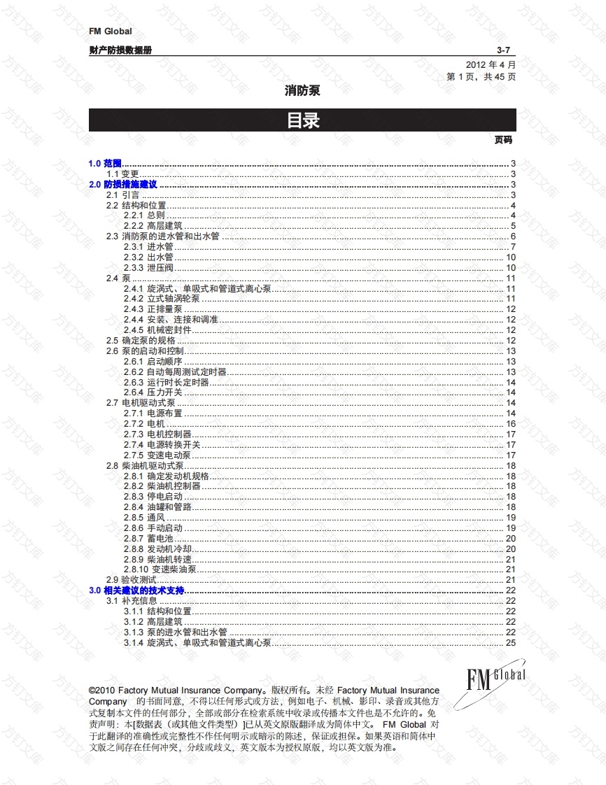 FM Global财产防损数据册3-72012年4月第1页,共45页消防泵目录页码1.1变更32.0防损措施建议332.2结构和位置2.2.1总则42.2.2高层建筑52.3消防泵的进水管和出水管62.3.1进水管72.32出水管102.3.3泄压阀102.4泵112.4.1旋涡式、单吸式和管道式离心泵112.42立式轴涡轮泵2.4.3正排量泵…122.4.4安装、连接和调准2.4.5机械密封件12.5确定泵的规格2.6泵的启动和控制2.6.1启动顺序2.62自动每周测试定时12.6.3运行时长定时器2.6.4压力开关142.7电机驱动式泵2.7.1电源布置12.72电机.2.7.3电机控制器12.74电源转换开关2.75变速电动泵2.8柴油机驱动式泵.182.8.1确定发动机规格2.8.2柴油机控制器182.8.3停电启动2.8.4油罐和管路2.8.5通风.18192.8.6手动启动92.8.7202.8.8发动机冷却2.8.9柴油机转速2.8.10变速柴油泵22.9验收测试.3.0相关建议的技术支持223.1补充信息…2库3.1.1结构和位置3.12高层建筑.23.1.3泵的进水管和出水管3.14旋涡式、单吸式和管道式离心泵.25©2010 Factory Mutual Insurance Company。版权所有。未经Factory Mutual InsuranceCompany的书面同意,不得以任何形式或方法,例如电子、机械、影印、录音或其他方式复制本文件的任何部分,全部或部分在检索系统中收录或传播本文件也是不允许的。免责声明:本[数据表(或其他文件类型)]已从英文原版翻译成为简体中文。FM Global对于此翻译的准确性或完整性不作任何明示或暗示的陈述,保证或担保。如果英语和简体中文版之间存在任何冲突,分歧或歧义,英文版本为授权原版,均以英文版为准。万3-7消防泵第2页FM Global财产防损数据册3.1.5轴流式涡轮泵303.1.6正排量泵313.1.7安装、连接和调准323.1.8机械密封件3.1.9确定泵的规格33.1.10泄压阀353.1.11变速泵33.1.12泵的启动和控制353.1.13电机驱动式泵363.1.14柴油机驱动式泵6374.1 FM Global4.2NFPA标准4.3其他标准38附录A术语表…3附录B文件修订记录40附绿C验收测试4示意图清单图1.布局合理的泵房照片图2.单区域泵系统……5图3.由恒压箱提供备用供水的双区域泵系统6图4.(第一部分)正确和错误的泵进水管设置8图4.(第二部分)正确和错误的泵进水管设置8图5.配有旁通管路(从城市供水总线吸水)的消防泵建议布置示意图图6.典型专用消防泵电机馈电线路.15图7.优先于所有其他设施负荷连接的典型消防泵馈电线路图8.典型的热交换器冷却水管路布置图。图9.湿坑内的立式轴涡轮泵设备。图10.具有湿坑吸入口的立式轴涡轮消防泵设备24图11.水池尺寸平面图25图12.水池尺寸立面图25图13.具有地上水罐吸入口的典型水平轴消防泵设备5图14.典型水平轴中开式泵的剖面图.2图15.具有密耦合电机的典型端吸泵的剖面图26图16.典型的单独耦合端吸泵的剖面图.…2图17.具有密耦合电机的典型立式直列泵的剖面图28图18.典型单独耦合立式直列泵的详细剖面图图19.典型的二级立式涡轮泵剖面图3图20.消防泵流量特性曲线图.1图21.检查角度和平行度调准.32图22.泵的机械密封.3图23.供水图.图24.供水图.44图25.速度变化对泵性能曲线的影响45表格清单表1消防泵管路数据摘要.表2.产生15英尺秒(4.6米秒)的流速所需的流量9表3.驱动消防泵所需的近似功率。对于特殊的功率要求,请咨询制造商表4.最小水池尺寸232008-2012 Factory Mutual Insurance Compary..版权所有消防泵3-7FM Global财产防损数据册第3页本数据册针对受保险的消防泵的安装提供一些建议。除非另有说明,否则这些建议假定您使用的是FM认证的设备。本数据册涵盖私有消防供水泵的选择和安装。所考虑的项目包括泵房建设、进水管和出水管、电源、电机驱动控制、内燃机驱动控制以及验收测试。本数据册不涵盖供水容量和压力要求,也不涵盖消防泵系统检查、测试和维护要求。本数据册并未针对消防泵设备的电气线路安装提供建议。1.1变更2012年4月。修订了与可燃液体相关的术语,使阐述更明晰,并与FM Global的可燃液体风险防损建议保持一致。2.0防损情施建议21引言出于消防目的,消防泵目的是供水。在设施的消防系统中,消防泵是非常关键的组件。在消防系统失去压力时,它们应自动启动或通过其他自动消防手段启动。在发生火灾的情况下,它们需不断为设施的消防系统供应必要的水流和水压。它们应具有高度的可靠性。只有安装得当并且定期进行测试和维护才能确保消防泵设备可靠。必须特别小心才能确保消防泵套装组件选择正确,安装质量好。火灾过程中,消防泵发生故障可导致设施面临巨大的财产损失。消防泵在任何时候出于任何原因无法运行就等同于消防系统停用,因此,应采用FM Global红牌许可证制度管理这些停用状况,并及时恢复泵的运行。方方方方订方文200B-2012 Factory Mutual Insurance Company.版权所有