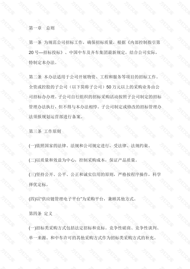 万万文总则第一条为规范公司招标工作,确保招标质量,根据《内部控制指引第20号一招标投标》、中国中车及齐车集团最新规定,结合公司实际,特制定本办法。第二条本办法适用于公司开展物资、工程和服务等项目的招标工作。全资或控股的子公司(以下简称子公司)50万元以上的采购业务由公司招标办办理。子公司自行组织的招标采购活动按照子公司制定的招标管理办法执行,但不得与本办法相悖。子公司制定或修改的招标管理办法须报规划运营部进行备案。第三条工作原则(一)依照国家的法律、法规和公司规定进行,受法律、法规约束(二)以质量和效益为中心,控制采购成本,保证产品质量。方(三)坚持公开、公平、公正和诚实信用的原则,严格按程序操作,科学择优定标。(四)以“供应链管理电子平台”为采购平台,兼顾其他方式。第四条定义(一)招标类采购方式包括法定招标和竞标。竞争性磋商、竞争性谈判、单来源、和中车许可的其他采购方式作为招标类采购方式的补充。万万万(二)法定招标分为公开招标和邀请招标。公开招标,是指依法以招标公告的方式邀请非特定的供应商参加投标的采购方式。邀请招标,是指以投标邀请书的方式邀请特定的供应商参加投标的采购方式。(三)竞标是指为避免与法定招标混淆,提高采购效率,采购人按照本办法规定程序组织的采购活动。竞标包括公开竞标和邀请竞标两种。公开竞标是在中国中车全体供应商范围内实行采购:邀请竞标是在邀请供应商名单范围内进行采购。第五条不具备招标条件或单独组织招标成本过高时,以及按规定必须进行委托招标的项目,可以委托招标代理机构依法依规组织招标事宜。代理机构按照本办法择优确定。第二章管理体制第六条公司招标工作实行统一管理、分级制衡的体制。公司设立招标委员会和招标办公室。(一)招标委员会文招标委员会是公司各项招标工作的领导、监督机构。招标委员会主任由公司总经理担任,副主任由分管招标工作的副总经理担任,成员为其他公司级副职。文招标委员会主要职责是:万万万遵循国家招标投标法律法规,贯彻国家有关招标投标的方针政策及具体规定,负责审定公司招标工作的各项规章制度:2.负责领导公司招标工作,负责审批招标申请、评标报告和授权文件。3.指导标办公室的招标工作,监督检查招标、投标活动:4.对招标中的重大问题进行决策和处理:其他必须由招标委员会决定的事项。(二)招标办公室招标委员会下设招标办公室。招标办公室是公司招标工作组织和管理机构,招标办公室设在规划运营部。办公室主任由规划运营部部长担任,副主任由主管招标的副部长担任,规划运营部设专职招标岗位。万招标办公室的主要职责是:方1.受招标委员会委托,对招标工作全面负责:2.组建招标工作组和确定评标小组名单,对其公正性负责:3.审核招标项目预算、技术要求、商务条款、质量保证、售后服务、检查验收标准、监督控制办法及投标单位的资质和业绩等条件,对发售的招标文件负责:对各采购单位报合格供应商库进行汇总,编制招标许可供应商名单:万