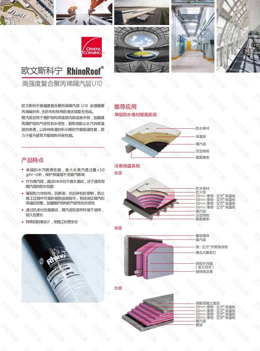 库OWENSCORNING欧文斯科宁RhinoRoof高强度复合聚丙烯隔汽层U10欧文斯科宁高强度复合聚丙烯隔汽层U10由增强聚推荐应用丙烯编织布、无纺布和特殊防滑涂层复合而成。单层防水卷材屋面系统隔汽层应用于围护结构保温层内侧或者外侧,加强建筑围护结构气密性和水密性,能有效阻止水汽向保温层的渗透,以保持保温材料长期的节能保温性能,致防水卷材力于提升建筑节能绿色环保性能。保温层隔汽层压型钢板产品特点冷库保温系统·卓越的水汽隔离性能,最大水蒸汽透过量≤3.0g/m'·24h,保护保温层不受潮汽影响屋面·作为隔汽层,通过6米水柱不透水测试,优于通用型隔汽层的防冰性能防水卷材强韧的力学结构,抗撕裂、抗拉伸和抗穿刺,防止防火板立方。保温板施工过程中可能的破损或者破坏,有效保证隔汽和50mm厚保温板保温的完整,强围护结构的气密性和水密性50mm恒立保温板保温板·通过抗老化性能测试,隔汽层在湿热环境下使用50mm隔汽层耐久性更长压型钢板屋面条特殊的防滑设计,使施工时更安全墙面基层墙体隔汽层恒·立方挤塑泡沫板钢板外饰面镀锌钢龙骨地面方钢筋混凝土面层50mm立方保温板50mm50mm50mm恒温板隔层基层方订库文性能指标:施工方法指标单位性能隔汽层印刷面向上,从一侧檐口(或屋面起始敛处)开始铺装在压型钢板底板上,向外预留200m隔汽层用m x m3.20x87.20于包裹保温层端部面密度g/m'95隔汽层从下(檐口)向上(屋脊),沿平行于屋脊方向铺设,平行于屋面水蒸气透过量g/m'.24h脊搭接缝顺流水方向搭接,搭接宽度100mm,垂直不透水性mm600于屋脊搭接缝顺项目所在地年最大风向搭接,搭接宽最大拉力一纵向N/50mm2510度150mm最大拉力一横向N/50mm≥300隔汽层搭接缝互相错开,并用丁基胶带满粘密封,避钉杆撕裂强度一纵向N免将搭接缝设于屋脊和天沟处钉杆撕裂强度一横向2300热老化拉力保持率290抗UW拉力保持率%施工注意事项·如有明火、高温作业,必须对隔汽层采取有效的防护措施:严禁明火、焊接作业或高温物体与隔汽层直接接触知名成功案例·隔汽层穿孔处提前铺贴丁基胶带,以增加钉孔水密性:隔汽层穿管处开孔径应小于管口孔洞,套过管体应用案例后开孔四周应用丁基胶带密封固定·隔汽层遇到破损及搭接数处破坏时,应用胶带密封、及山东太阳纸业股份有限公司厂房时修补山东博汇纸业股份有限公司厂房屋面·铺设基层表面应平整、干燥、干净、稳固、无尖锐凸山东晨鸣纸利业集团股份有限公司厂房起物哈尔滨东安发动机(集团)有限公司厂房厦门普洛斯物流园冷库牧原集团冷库上海同盛保税冷库冷库关于欧文斯科宁上海同华冷链物流有限公司冷库河南万邦冷链物流中心冷库欧文科宁是保温材料、屋面材料和玻纤维复合材料的泰安市绿龙有机食品有限公司冷库全球制造商和供应商,提供范围广泛的高质量产品和服务.欧文斯科宁致力于通过提供各类创新产品和解决方案、改造市场并改善生活,旨在为客户创造实质性的改变并积极推动可持续发展让世界变得更美好。储存方法·放置于干燥、平整。干净处存放·避免阳光直射,避免明火接触免责条款由于使用条件可能会发生变化,欧文斯科宁在本手册中提供的相关产品的技术信息和数据仅供参考。欧文斯科宁(中国)投资有限公司OWENS上海浦东新区芳甸路1155号浦东嘉里城40层CORNING电话:+86-21-61019666传真:+86-21-61019522ht tp://www.owenscoming.com.cnTHE PINK PANTHER&-2020Methts ResPub.No.88181012081:Print in SH 2P DEC 2020