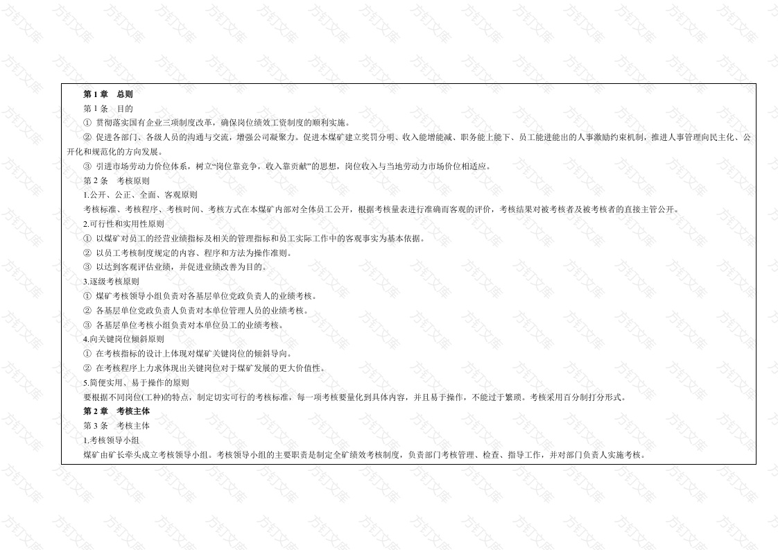第1章总则第1条目的①贯彻落实国有企业三项制度改革,确保岗位绩效工资制度的顺利实施②促进各部门、各级人员的沟通与交流,增强公司凝聚力。促进本煤矿建立奖罚分明、收入能增能减、职务能上能下、员工能进能出的人事激励约束机制,推进人事管理向民主化、公开化和规范化的方向发展。③引进市场劳动力价位体系,树立“岗位靠竞争,收入靠贡献”的思想,岗位收入与当地劳动力市场价位相适应。第2条考核原则1公开、公正、全面、客观原则考核标准、考核程序、考核时间、考核方式在本煤矿内部对全体员工公开,根据考核量表进行准确而客观的评价,考核结果对被考核者及被考核者的直接主管公开2.可行性和实用性原则①以煤矿对员工的经营业绩指标及相关的管理指标和员工实际工作中的客观事实为基本依据。②以员工考核制度规定的内容、程序和方法为操作准则。③以达到客观评估业绩,并促进业绩改普为目的。3逐级考核原则万方方方方①煤矿考核领导小组负责对各基层单位党政负责人的业绩考核。②各基层单位党政负责人负责对本单位管理人员的业绩考核。③各基层单位考核小组负责对本单位员工的业绩考核4.向关键岗位倾斜原则方①在考核指标的设计上体现对煤矿关键岗位的倾斜导向。②在考核程序上力求体现出关键岗位对于煤矿发展的更大价值性5.简便实用、易于操作的原则要根据不同岗位(工种)的特点,制定切实可行的考核标准,每一项考核要量化到具体内容,并且易于操作,不能过于繁琐。考核采用百分制打分形式。第2章考核主体第3条考核主体煤矿由矿长牵头成立考核领导小组。考核领导小组的主要职责是制定全矿绩效考核制度,负责部门考核管理、检查、指导工作,并对部门负责人实施考核2.人力资源部人力资源部为绩效考核的组织实施部门,主要负责拟定考核方案、培训考核者、编制绩效考核量表样式、审定绩效考核量表、审核考核结果及考核结果运用、受理考核申诉、监督考核工作、总结考核工作。第3章考核周期第4条考核周期①对矿长实行年度考核。②对副矿长实行半年度考核。口③对各职能部门经理实行季度考核④对各部门其他员工实行月度考核。⑤在上述考核基础上,对所有员工进行年度综合考核。第4章考核实施方第5条考核系统本煤矿实行分类考核制度,不同职位考核的具体等级和标准不同。①对矿长实行年度考核和年度综合考核,考核结果进行五个等级设置,分别为S(出众)、A(优秀)、B(良好)、C(合格),D(不合格)。S一对煤矿企管科制订的年度经营计划的落实情况(含经营性指标、管理性指标)的评估总分为90-100分。A一一对公司战略与预算委员会制订的年度经营计划情况(含经营性指标、管理性指标)的评估总分为80-89分:B一一对煤矿企管科制订的年度经营计划的落实情况(含经营性指标、管理性指标)的评估总分为70-79分:C对煤矿企管科制订的年度经营计划的落实情况〔含经营性指标、管理性指标)的评估总分为60-69分:D一一对煤矿企管科制订的年度经营计划的落实情况(含经营性指标、管理性指标)的评估总分为59分(含)分以下或有否决性指标。②对副矿长实行半年度考核和年度综合考核,考核结果进行五个等级设置,分别为S(出众)、A(优秀)、B(良好)、C(合格)、D(不合格)。S一对矿长确定的业务性指标和管理性指标的评估总分为90-100分。A一一对矿长确定的业务性指标和管理性指标的评估总分为80-89分。B-对矿长确定的业务性指标和管理性指标的评估总分为70-79分。-对矿长确定的业务性指标和管理性指标的评估总分为6069分。对矿长确定的业务性指标和管理性指标的评估总分为59(含)分以下或有否决性指标。③对于各职能部门经理,实行季度考核和年度综合考核,考核结果进行五个等级设置,分别为S(出众)、A(优秀)、B(良好)、C(合格)、D(不合格)万万方对煤矿审定的综合性指标(含业务性指标和管理性指标)的评估总分为90100分。、对煤矿审定的综合性指标〔含业务性指标和管理性指标)的评估总分为80-89分。B-对煤矿审定的综合性指标(含业务性指标和管理性指标)的评估总分为70-79分。C-对煤矿审定的综合性指标〔含业务性指标和管理性指标)的评估总分为60-69分。D-对煤矿审定的综合性指标(含业务性指标和管理性指标)的评估总分为59(含)分以下或有否决性指标。④对于职能部门内其他员工,实行月度考核和年度综合考核,考核结果进行五个等级设置,分别为S(出众)、B(良好)、C(合格)、D(不合格)S--对部门经理及授权业务经理所分派的工作任务的完成情况、工作态度评估总分为90100分。一对部门经理及授权业务经理所分派的工作任务的完成情况、工作态度评估总分为80-89分。万B一对部门经理及授权业务经理所分派的工作任务的完成情况、工作态度评估总分为70-79分c-对部门经理及授权业务经理所分派的工作任务的完成情况、工作态度评估总分为6069分。对部门总经理及授权业务经理所分派的工作任务的完成情况、工作态度评估总分为59(含)分以下。⑤对于生产操作类员工,实行月度考核和年度综合考核,考核结果进行五个等级设置,分别为S(出众)、A(优秀)、B(良好)、C(合格)、D(不合格)。生产操作类员工的工作同产量直接挂钩,在考核内容上可考虑实施以计件工资或包干工资为基础,同时将成本控制、安