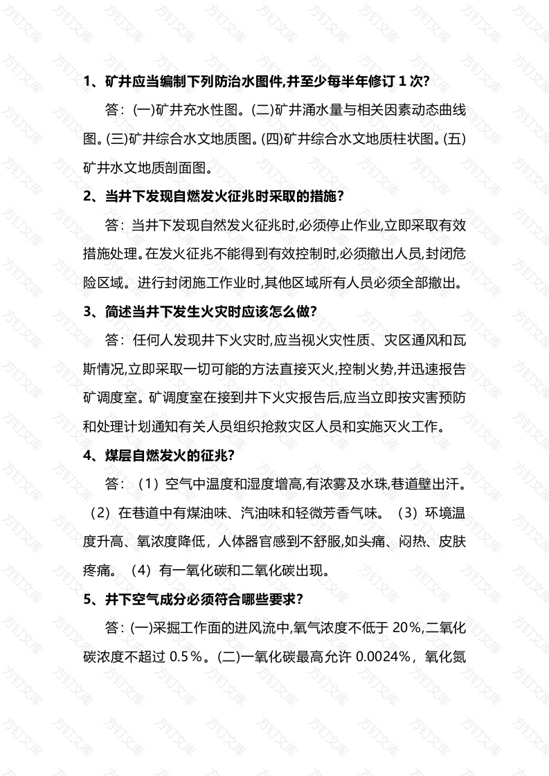 矿井应当编制下列防治水图件,并至少每半年修订1次?答:(一)矿井充水性图。(二)矿井涌水量与相关因素动态曲线图。(三)矿井综合水文地质图。(四)矿井综合水文地质柱状图。(五)矿井水文地质剖面图。2、当井下发现自燃发火征兆时采取的措施?答:当井下发现自然发火征兆时,必须停止作业,立即采取有效措施处理。在发火征兆不能得到有效控制时,必须撤出人员,封闭危险区域。进行封闭施工作业时,其他区域所有人员必须全部撤出。3、简述当井下发生火灾时应该怎么做?答:任何人发现井下火灾时,应当视火灾性质、灾区通风和瓦斯情况,立即采取一切可能的方法直接灭火控制火势,并迅速报告矿调度室。矿调度室在接到井下火灾报告后,应当立即按灾害预防和处理计划通知有关人员组织抢救灾区人员和实施灭火工作4、煤层自燃发火的征兆?答:(1)空气中温度和湿度增高,有浓雾及水珠,巷道壁出汗(2)在巷道中有煤油味、汽油味和轻微芳香气味。(3)环境温度升高、氧浓度降低,人体器官感到不舒服,如头痛、闷热、皮肤疼痛。(4)有一氧化碳和二氧化碳出现。5、井下空气成分必须符合哪些要求?答:(一)采掘工作面的进风流中,氧气浓度不低于20%,二氧化碳浓度不超过0.5%。氧化碳最高允许0.0024%,氧化氮万最高允许0.00025%,二氧化硫最高允许0.0005%,硫化氢最高允许0.00066%,氨气最高允许0.004%,6、《规程》对矿井通风系统图有何要求?答:矿井通风系统图必须标明风流方向、风量和通风设施的安装地点。必须按季绘制通风系统图,并按月补充修改。多煤层同时开采的矿井,必须绘制分层通风系统图。7、当主要通风机停止运行时,应该怎么做?答:主要通风机停止运转时,必须立即停止工作、切断电源,工作人员先撤到进风巷道中,由值班矿领导组织全矿井工作人员全部撤出。主要通风机停止运转期间,必须打开井口防爆门和有关风门,利用自然风压通风;对由多台主要通风机联合通风的矿井,必须正确控制风流防止风流紊乱。8、《规程》对临时停工地点的通风有何要求?答:临时停工的地点,不得停风;否则必须切断电源设置栅栏警标禁止人员进入,并向矿调度室报告。停工区内甲烷或者二氧化碳浓度达到3.0%或者其他有害气体浓度超过规定不能立即处理时,必须在24h内封闭完毕。9、局部通风机因故停止运转,在恢复通风前,应该怎么做?答:局部通风机因故停止运转,在恢复通风前,必须首先检查瓦斯,只有停风区中最高甲烷浓度不超过1.0%和最高二氧化碳浓度不超过1.5%,且局部通风机及其开关附近10m以内风流中的甲烷浓度都不超过0.5%时,方可人工开启局部通风机,恢复正常通风。10、有瓦斯或者二氧化碳喷出的煤(岩)层,开采前必须采取下列措施。答:(一)打前探钻孔或者抽排钻孔。(二)加大喷出危险区域的风量。(三)将喷出的瓦斯或者二氧化碳直接引入回风巷或者抽采瓦斯管路。11、机车制动距离?答:司机开始扳动闸轮或电闸手把到列车完全停止的运行距离。机车制动距离包括空行程距离和实际制动距离。12、使用刮板输送机必须遵守哪些规定?答:(一)采煤工作面刮板输送机必须安设能发出停止、启动信号和通讯的装置,发出信号点的间距不得超过15m。(二)刮板输送机使用的液力偶合器,必须按所传递的功率大小注入规定量的难燃液,并经常检查有无漏失。易熔合金塞必须符合标准,并设专人检查、清除塞内污物;严禁使用不符合标准的物品代替。(三)刮板输送机严禁乘(四)用刮板输送机运送物料时,必须有防止顶人和顶倒支架的安全措施。(五)移动刮板输送机时,必须有防止冒顶、顶伤人员和损坏设备的安全措施。13、采煤机在开机、停机检修时的注意事项?