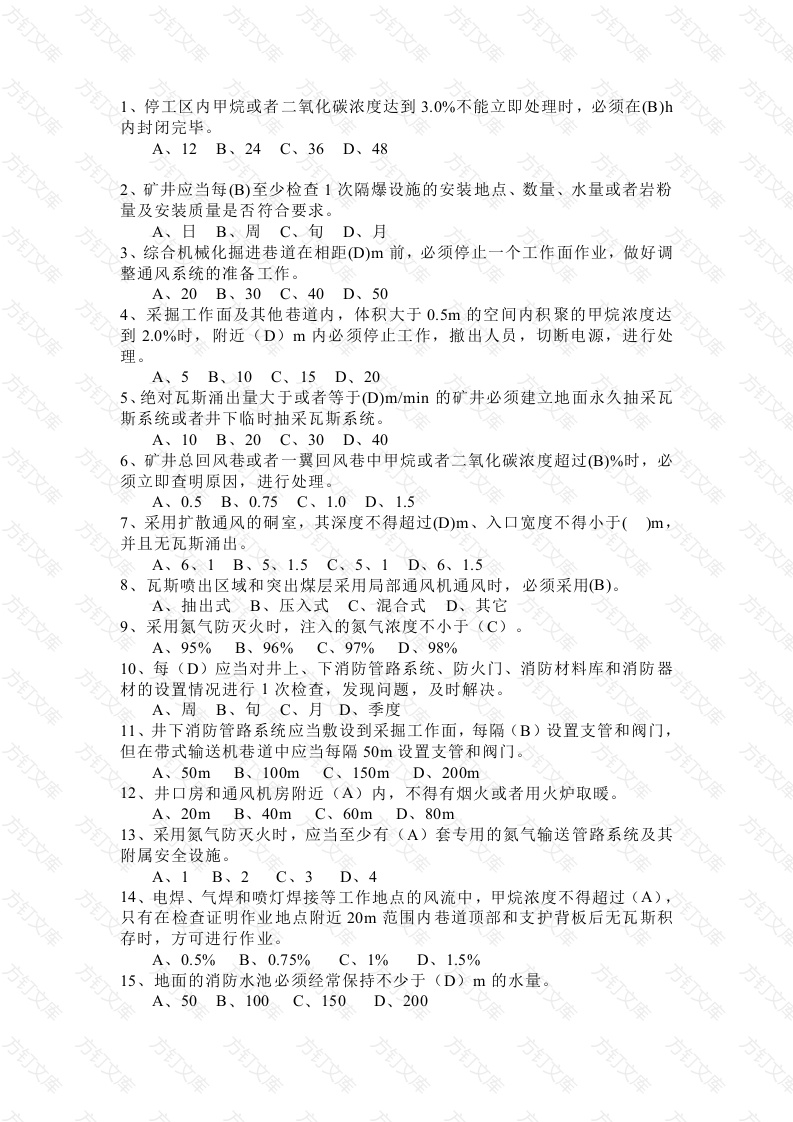 1、停工区内甲烷或者二氧化碳浓度达到3.0%不能立即处理时,必须在B)h内封闭完毕。A、12B、24C、36D、482、矿井应当每B)至少检查1次隔爆设施的安装地点、数量、水量或者岩粉量及安装质量是否符合要求。A、日B、周C、旬D、月3、综合机械化掘进巷道在相距D)m前,必须停止一个工作面作业,做好调整通风系统的准备工作。A、20B、30C、40D、504、采掘工作面及其他巷道内,体积大于0.5m的空间内积聚的甲烷浓度达到2.0%时,附近(D)m内必须停止工作,撤出人员,切断电源,进行处理。A、5B、10C、15D、205、绝对瓦斯涌出量大于或者等于①)m/min的矿井必须建立地面永久抽采瓦斯系统或者井下临时抽采瓦斯系统。A、10B、20C、30D、406、矿井总回风巷或者一翼回风巷中甲烷或者二氧化碳浓度超过(B)%时,必须立即查明原因,进行处理。A、0.5B、0.75C、1.0D、1.57、采用扩散通风的酮室,其深度不得超过(①)m、入口宽度不得小于(并且无瓦斯涌出。A、6、1B、5、1.5C、5、1D、6、1.58、瓦斯喷出区域和突出煤层采用局部通风机通风时,必须采用B)A、抽出式B、压入式C、混合式D、其它9、采用氮气防灭火时,注入的氮气浓度不小于(C)A、95%B、96%C、97%D、98%10、每(D)应当对井上、下消防管路系统、防火门、消防材料库和消防器材的设置情况进行1次检查,发现问题,及时解决。A、周B、旬C、月D、季度11、井下消防管路系统应当敷设到采掘工作面,每隔(B)设置支管和阀门,但在带式输送机巷道中应当每隔50m设置支管和阀门。A、50mB、100mC、150mD、200m12、井口房和通风机房附近(A)内,不得有烟火或者用火炉取暖A、20mB、40mC、60mD、80m13、采用氮气防灭火时,应当至少有(A)套专用的氮气输送管路系统及其附属安全设施。A、1B、2C、3D、414、电焊、气焊和喷灯焊接等工作地点的风流中,甲烷浓度不得超过(A),只有在检查证明作业地点附近20m范围内巷道顶部和支护背板后无瓦斯积存时,方可进行作业。A、0.5%B、0.75%C、1%D、1.5%地面的消防水池必须经常保持不少于(D)m的水量。A、50B、100C、150D、200文16、井下和井口房内不得进行电焊、气焊和喷灯焊接等作业。如果必须在井下主要硐室、主要进风井巷和井口房内进行电焊、气焊和喷灯焊接等工作,每次必须制定安全措施,由(B)批准A、集团总工程师B、矿长C、总工程师D、安全矿长17、电焊、气焊和喷灯焊接等作业完毕后,作业地点应当再次用水喷洒,并有专人在作业地点检查(A)h,发现异常,立即处理。A、1B、2C、4D、618、封闭火区时,应当合理确定封闭范围,必须指定专人检查(A)、氧气、一氧化碳、煤尘以及其他有害气体浓度和风向、风量的变化,并采取防止瓦斯、煤尘爆炸和人员中毒的安全措施。A、甲烷◇B、乙烯C、乙炔D、二氧化碳19、认为火已熄灭的条件之一:火区内的空气温度下降到(C)℃以下,或者与火灾发生前该区的日常空气温度相同。A、10B、20C、30D、4020、认为火已熄灭的条件之一:火区内空气中的氧气浓度降到(B)%以下A、20B、5.0C、8.0D、1221、认为火已熄灭的条件之一:火区的出水温度低于(B)℃,或者与火灾发生前该区的日常出水温度相同。A、20B、25C、26D、3022、启封火区时,应当逐段恢复通风,同时测定回风流中(A)、甲烷浓度和风流温度。发现复燃征兆时,必须立即停止向火区送风,并重新封闭火区。A、一氧化碳B、乙烯C、乙炔D、二氧化碳23、采煤工作面回采结束后,必须在(B)天内进行永久性封闭,(B)次抽取封闭采空区气样进行分析,并建立台账。A、45、每天B、45、每周C、30、每天D、30、每周24、开采容易自燃和自燃煤层时,在采(盘)区开采设计中,必须预先选定构筑(C)的位置。A、封闭墙B、风门C、防火门D、风桥25、每个密闭墙附近必须设置(A)、警标,禁止人员入内,并悬挂说明牌。A、栅栏B、风门C、警戒网D、老虎牌26、采用灌浆防灭火,安排生产计划时,应当同时安排防火灌浆计划,落实灌浆地点、时间、进度、(C)和灌浆量。A、发泡剂量B、灌浆人员C、灌浆浓度D、阻化剂量27、(C)在火区的同一煤层的周围进行采掘工作。A、可以B、允许C、不得D、应该28、煤层倾角在(A)及以上的火区下部区段严禁进行采掘工作A、35°B、5°C、12°D、60°29、一个矿井只要有(A)个煤(岩)层发现瓦斯,该矿井即为瓦斯矿井。A、1B、2C、3D、430、新建突出矿井设计生产能力不得低于(B)Mt/a。A、B、0.9C、0.8D、0.731、突出矿井的新采区和新水平进行开拓设计前,应当对开拓采区或开拓水平内平均厚度在(A)m以上的煤层进行突出危险性评估。A、0.3B、0.4C、0.5D、0.632、突出危险区域未按要求采取区域综合防突措施的,(A)进行采掘活动。A、严禁B、可以C、不得D、无所谓33、经开拓后区域预测或者经区域措施效果检验后为无突出危险区的煤层进行揭煤和采掘作业时,必须采用(A)方法进行区域验证。A、工作面预测B、区域预测C、其他预测D、地质勘探预测34、穿层钻孔预抽巷道揭煤区域煤层瓦斯时,应当控制巷道及其外侧一定范围内的煤层,并在揭煤工作面距煤层最小法向距离(D)m以前实施。A、1.5B、3C、5D、735、当煤巷掘进和采煤工作面在预抽防突效果有效的区域内作业时,工作面距未预抽或者预抽防突效果无效范围的前方边界不得小于(C)mA、40B、30C、20D、1036、突出矿井应当对突出煤层进行区域突出危险性预测,凡未进行区域预测的区域视为(B)。A、无突出危险区B、突出危险区C、无突出威胁区◇D、突出