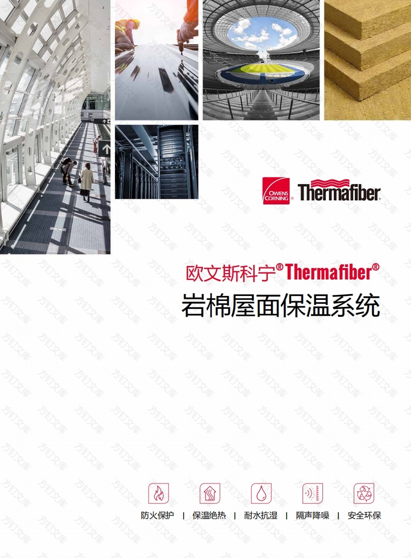 文OWENSCORNINGThermafiber.方文文欧文斯科宁®Thermafiber岩棉屋面保温系统方方方隔声降噪丨安全环保万方岩棉屋面保温系统欧文斯科宁在2013年和2018年分别收购了美国防火保温岩棉生产商THERMAFIBER及欧洲岩棉领先制造商PAROC,并凭借自身在建筑保温材料领域的优势,始终致力于建筑保温材料的开发、生产和销售,尤其在岩棉屋面保温应用领域有完整的产品体系和丰富的应用经验。4岩棉屋面保温系统是采用不可燃的岩棉产品配以防水卷材,紧固件和隔汽材料的屋面保温结构,可根据不同的屋面结构调整各种材料以满足屋面防火保温、防潮防霉、降噪吸音和高抗压等实际需求。库库欧文斯科宁提供了三种不同类型的屋面保温系统方案,供业主、设计师和安装人员根据自身需求自由选择。OCROOF-S屋面保温系统解决方案OCRO0F-S欧文斯科宁屋面单层岩棉保温系统可应用于保温层厚度小于或等于100毫米的建筑结构中。保温产品的选择取决于屋面的荷载、铺设时的气候条件以及屋面所处的日常环境。承重结构可以是钢板结构,也可以是不同种类的混凝土或轻质混凝士构件。屋面防水卷材直接铺设在保温材料上。此类型也适用于旧屋面的再保温。3屋面防水卷材42机械紧固件3Thermafiber RD-160/180隔汽层(U10复合聚丙烯隔汽膜)6屋面结构(压型钢板、混凝土、轻质混凝士和木材)万万万方万文OCROOF-D屋面保温系统解决方案万万OCROOF-D欧文斯科宁屋面双层岩棉保温系统包含底层岩棉,即主保温层以及顶层岩棉。底层岩棉厚度从50mm到100mm不等;顶层岩棉厚度从40mm到50mm不等。顶层岩棉可分散人从屋面行走时的荷载,没有建筑构件穿过保温层,这是新建建筑最常见的屋面解决方案。3文屋面防水卷材2文机械紧固件Thermafiber RD-160/180Thermafiber RD-140/160隔汽层(U10复合聚丙烯隔汽膜)6屋面结构方(压型钢板、混凝土、轻质混凝土和木材)OCROOF-R屋面保温系统解决方案OCROOF-R欧文斯科宁屋面翻新岩棉保温系统为老旧平屋面改造保温提供了一个高性价比解决方案。该系统方案通过欧文斯科宁高强度屋面保温板产品实现了保温、隔音、「防护、节能以及绿色3环保等改造功能。新屋面防水卷材2贯穿所有保温层的机械紧固件3干燥后的旧屋面防水卷材万万万2
