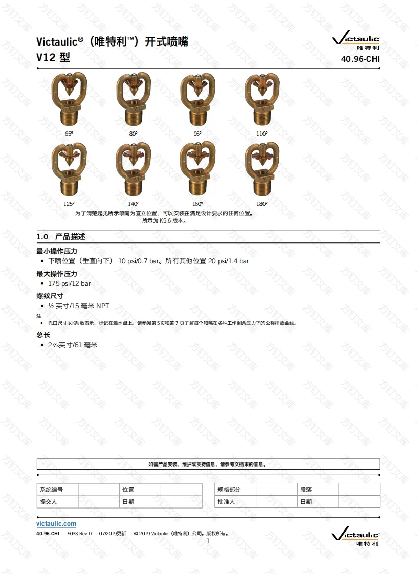 Victaulic®(唯特利rm)开式喷嘴ctaulicV12型万唯特利40.96-CHl65125140180为了清楚起见所示喷嘴为直立位置。可以安装在满足设计要求的任何位置。所示为K5.6版本。1.0产品描述最小操作压力·下喷位置(垂直向下)10psi0.7bar。所有其他位置20psi/1.4bar最大操作压力·175psi/12bar螺纹尺寸·英寸15毫米NPT注·孔口尺寸以K系数表示,标记在溅水盘上。请参阅第5页和第7页了解每个喷稀在各种工作利除压力下的公称排放曲线。总长如需产品安装、维护或支持信息,请参考文档末的信息。系统编号位置规格部分段落提交人日期批准人日期库victaulic.com40.96-CHl5033 Rev D072019更新ictaulic唯特利库victaulic.com1.0产品描述(续)型号代码公称K系数可提供的溅水盘角度12V1201V1202V1203V1204V1205V1206V1207V1208(125V1211V1212V1213V1215(26公制16091409V1222V122732(46公制)V1241y1242V1243V1244V1245V1246V1247V1248(180(160%(14094.9V1252V1254V1256V1258(11095.6V1261V1262V1263V1264V1265V1266V1268(8.1公制(160%1259(1109(95965972V1271V1272(180(160当测量的压力是以kP?为单位时,显示的是公制K系数测量值。当测量的压力是以B为单位时.显示的公制K系数值要乘以10.0。采用了开式设计(非自动)仅带一个湛水盘,排出任到中流速水滴的稳定均匀的谁形喷射流。c妇Uc(维特利)V12喷嘴可提供多种孔口尺寸和喷洒角度.满足各种设计应用需要。对于有公称关国K系数12、1.8、2.3和32的喷嘴,使用了补心。但带K系数4.1、4.9、5.6和72的喷都是机加孔口。2.0认证/列名FM有关详细信息,10.01号技术文件。3.0规格-材料框架铸造:耐脱锌模铸黄铜。分流器:黄铜UNS-C36000。补心(用于1.2、1.8、2.3和3.2K系数的喷嘴):黄铜UNS-C36000溅水盘:黄铜UNS-C51000螺钉:不锈钢UNS-S30400附件:喷淋头扳手:标准扳手:V27开口扳手表面涂层:(请指定选择)原色黄铜。☐VC-2502。2耐离蚀性能取得了UL列名和FM认证。40.96-CH更新072019。2019 ictaulic(雅特利)公司。版权所有。victaulic.comictaulic唯特利victaulic.com4.0尺寸V12型1%英寸44毫米61毫米/12文英寸/k英寸11毫米NPT管道公称接合尺寸万库水盘方文分流器框架40.96-CHl更新072019。2019 ictaulic(雅特利)公司。版权所有。victaulic.com唯特利库