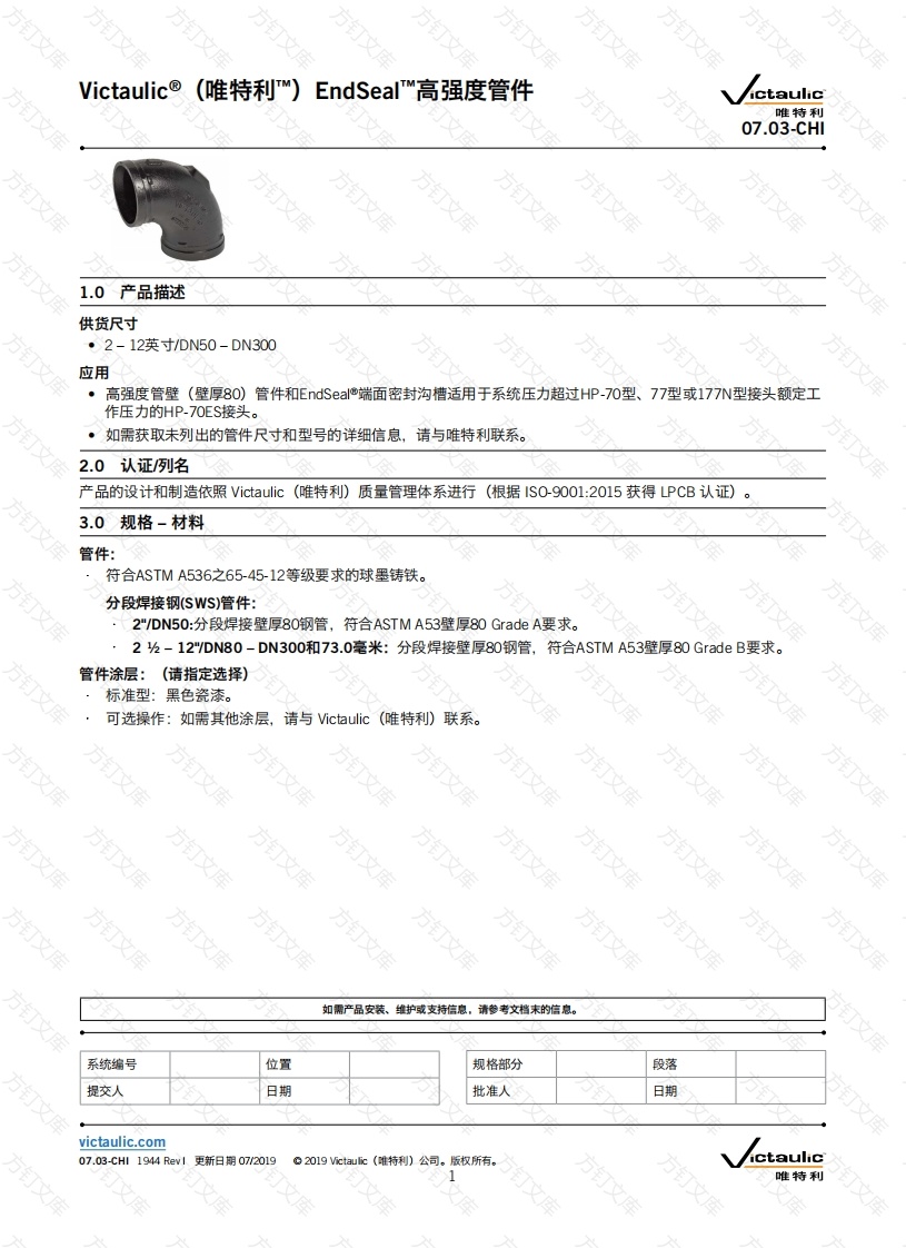 万Victaulic®(唯特利"m)EndSeal"M高强度管件万文万ctaulic唯特利07.03-CHl万1.0产品描述供货尺寸·2-12英寸/DN50-DN300应用高强度管壁(壁厚80)管件和EndSeal端面密封沟槽适用于系统压力超过HP-70型、77型或177N型接头额定工作压力的HP-7OES接头。·如需获取未列出的管件尺寸和型号的详细信息,请与唯特利联系。2.0认证列名产品的设计和制造依照Victaulic(唯特利)质量管理体系进行(根据IS0-9001:2015获得PCB认证)。3.0规格-材料管件:符合ASTM A536之65-45-12等级要求的球墨铸铁。分段焊接钢(SWS)管件:·2"/DN50:分段焊接壁厚80钢管,符合ASTM A53壁厚80 Grade A要求。方2-12"VDN80-DN300和73.0毫米:分段焊接壁厚80钢管,符合ASTM A53壁厚80 Grade B要求。管件涂层:(请指定选择)标准型:黑色瓷漆。可选操作:如需其他涂层,请与Victaulic(唯特利)联系。文万如需产品安装、请酸考文档末的信息。系统编号位置规格部分段落提交人日期批准人日期victaulic.com07.03-CHl1944Rev1更新日期072019唯特利库victaulic.com4.0尺寸62号端面密封63号端面密封64号35号60-Es尺寸90弯头45°弯头端面密封三通端面密封四通质量质量质量质量质量中心线至端大约中心线至端大约中心线至端大约中心线至端大约大约公称实际外径尺寸(单重)面距离单重)面距离单重)面距离“T”厚度英寸英寸英寸英寸DN毫米毫米毫米毫米千克毫米千2.3753.25(d2.001890.59(d06DN5060.3510883(d032.8753.755.02252.93.757.93.886.60.973.09557139536993.00.433.5004.256.02.504.316.04.381421.5DN8088.91082.7641087311115(d0.74.5005.003.000.64(dDN10011431274.77616(d6.6256.502723.5016.56.5027.06.5046.00.64(d5.8DN1501683165123897516512.216520.916(d2688.625DN200219.192535.0084(d23515921(d5.41010.750+23.6DN250273.010.71212.750086(d38.5DN300323822(d有关详细信息,(特)联系。注所有管件均为分段焊接钢,注有(d(表示球墨铸铁)的情况除外。方07.03-CHI 1944 Revl更新日期07/20192019 ictaulic(特利)公司。版权所有。ctaulicvictaulic.com唯特利victaulic.com5.0性能Victaulic(唯特利)EndSeal"~管件的额定压力符合Victaulic(唯特利)HP-70ES型接头的额定值(请参阅06.l3号技术文件)6.0通知A警告在安装、拆除、调整或维护任何Victaulic(唯特利)管道产品之前,请阅读并理解所有使用说明。在安装、拆除、调整或维护任何Victaulic(唯特利)产品之前,请务必立即确认管道系统已完全卸压并排干积水。请穿戴防护眼镜、安全帽和足部防护用品。如果不遵循这些说明,则可能会导致死亡或严重人身伤害和财产损坏。7.0参考资料的用户贵任每位用户据行业标准和项目规格以及全仅负责白行决定V(特员工的任何口头设计和标准设备的仅积,且不对此承任何责任和义务,明中任何规定的改变、安装图示装手册或支装说明上下安装手册的PF可使用请参现行价格表的保一节,实用新型专和外设计其附属实体在黄和/或其他家的标或注册商标,库07.03-CHI 1944 Revl更新日期07/2019victaulic.com万唯特利库