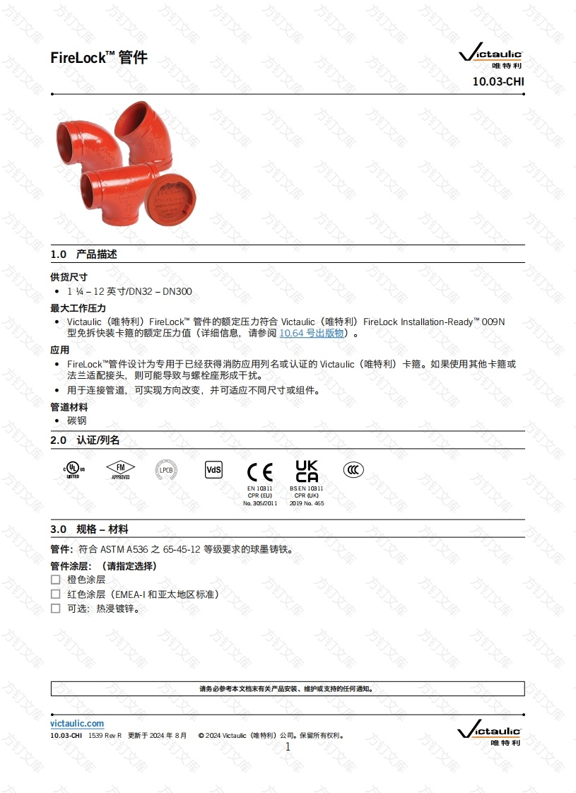 FireLock'管件ctaulic唯特利10.03-CHl方1.0产品描述供货尺寸·14-12英寸/DN32-DN300最大工作压力·Victaulic(唯特利)FireLock"管件的额定压力符合Victaulic(唯特利)FireLock Installation-Ready009N型免拆快装卡箍的额定压力值(详细信息,请参阅10.64号出版物)应用FireLock'"管件设计为专用于已经获得消防应用列名或认证的Victaulic(唯特利)卡箍。如果使用其他卡箍或法兰适配接头,则可能导致与螺栓座形成干扰。用于连接管道,可实现方向改变,并可适应不同尺寸或组件。管道材料·碳钢2.0认证/列名ULFMEN 10311BSEN 10311CPR (EU)2019Na.455方万3.0规格-材料管件:符合ASTM A536之65-45-12等级要求的球墨铸铁。库管件涂层:(请指定选择)口橙色涂层口红色涂层(EMEA-和亚太地区标准)可选:热浸镀锌。请务必参考本文档末有关产品安装、维护或支持的任何通知。victaulic.com10.03-CHI 1539 Rev R更新于2024年8月2024 ictaulic(唯特利)公司。保留所有权利。ctaulic唯特利4.0尺寸文001号002号006号003号002号006号45°弯头大约大约大约中心线至重中心线至中心线至实际外径端面距离端面距离1.6602.75101752.75140.8203DN3242.4700.545037006211.9002.751217502.75180.820.4DN40483700.54504702123752.752.0042.752488DN5060.351222.8753.002.2522000.881.073.0761.0571.0761.5220.53.0003.002.52.25243.0038DN6576.1761.1571.733.5003383.42.50313380.8812DN8088.98615641423220.54.2504.005.73.005.14.0075108.01022.676231023.44.5004.005.93.004.94.006.81.002.4DN10011431022.77610231255.5004883.258248815.4DN125139.71245.6831247.055.56348878325834881531.00141312438381246.9251.96.2505.503.509.25.5017.9159.01405.789421406.5005.4313.03.50945.5019.7165.11385.9894.21408.966.6255.5013.73.5010.45.502021.00DN150168314062894.71409.225278.51568123.16.9433.6216.3173105-17615.08.62568125.442518.96.9436.91.13219.117311.5108168291010.7508.2543.24.0025.08.2563.61.0614.2DN250273.021019.6102113210289276.41212.7509.3866.74.5036.180.71.0622.6DN300323.923811416.423836.627103方万万10.03-CHl更新于2024年8月2024 ictaulic(唯特利)公司。保留所有权利。ctaulicvictaulic.com唯特利victaulic.com5.0性能流量数据管径流量数据一001号003号002号002公称实际外径90°弯头45°弯头正三通支管正三通主管英寸英英尺英尺英尺英尺DN毫米米米米米141.6602.002.137.500.50DN3242.40.606230.21%1.9002.75DN4048.3082.022.3753.501.888.503.50DN5060.31.10.62.62.8754382.2510.8843873.01.3073.313文3.0004.502.3811.004.50DN6576.11.40.73.41.433.5005.002.6313.005.00DN8088.9084.0154.2506.503.251538650108.02.01.02.044.5006883.5016.00DN10011432.11.12.15.5008384.1320.63838DN125139.713632.655.5638.504.2521.008.5014132.6136.42.66.2509.505.0025.009.63159.02.9157.62.96.5009885.0024.50165.1301.5753.066.62510.005.0025.0010.00168.33.0157.63.02168.51513.0033.0013.00DN20021634.010.14.088.62513.006.5033.0013.00DN200219.14.02.012.55.21010.75017.008.3041.0017.00DN250273.05.22.5012.5521212.75020.0010.0050.0020.00DN300323.96.13.01526.1所列流量数据根据壁厚40管道的压降而测得10.03-CH1539ReR更新于2024年8月ctaulicvictaulic.com3唯特利