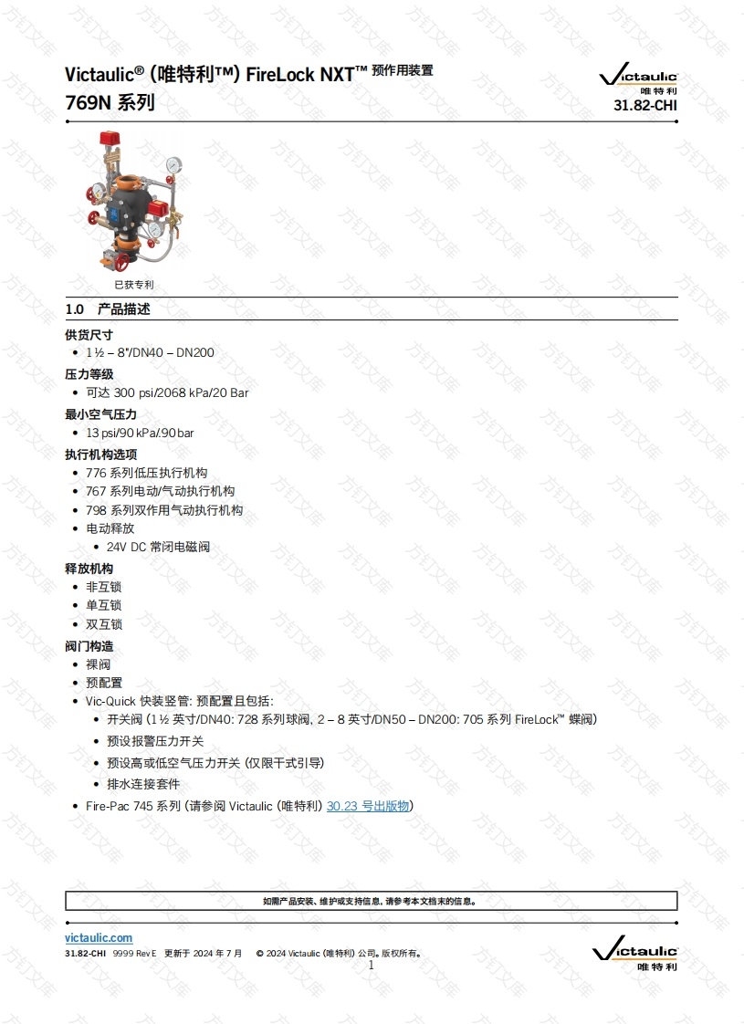 Victaulic®(唯特利TM))FireLock NXTTM预作用装置万文唯特利769N系列31.82-CHl方方已获专利1.0产品描述供货尺寸·1-8"/DN40-DN200压力等级·可达300psi/2068kPa/20Bar最小空气压力·13psi/90kPa/90bar执行机构选项·776系列低压执行机构·767系列电动/气动执行机构·798系列双作用气动执行机构电动释放·24WDC常闭电磁阀释放机构·非互锁·单互锁·双互锁阀门构造·裸阀·预配置·Vic-Quick快装竖管:预配置且包括:·开关阀(1圪英寸/DN40:728系列球阀,2-8英寸/DN50-DN200:705系列FireLock"蝶阀)预设报警压力开关·预设高或低空气压力开关(仅限干式引导)·排水连接套件万Fire-Pac745系列(请参阅Victaulic(唯特利)30.23号出版物)如需产品安装、维护或支持信息,请参考本文档末的信息。victaulic.com31.82-CHl9999RevE更新于2024年7月。2024 ictaulic(唯特利和公司。版权所有。唯特利库victaulic.com1.0产品描述(续)应用:·仅用于消防系统2.0认证列名3.0规格-材料阀体:符合ASTM A536,等级65-45-12的球墨铸铁。阀瓣:铝青铜插销:铝青铜阀杆:不锈钢17-4阀瓣密封:过氧化物硫化EPDM衬套/阀座0形密封环:丁腈橡胶弹簧:不锈钢隔膜:带结构补强件的过氧化物硫化EPDM方文方方方订方项目描述项目描述1阀体11盖板212盖板密封垫圈3阀瓣密封13盖板螺栓14插销密封垫片15插销弹簧密封定位环16插销弹簧衬套和0形密封环(2个)密封装配螺栓17隔膜8阀瓣弹簧18隔膜盖919隔膜盖配有头螺钉(8个)10阀轴衬套和0形密封圈(2个)20插销轴31.82-CHI 9999 Rev E更新于2024年7月victaulic.com方唯特利库victaulic.com3.0规格-材料(续)标准成套组件:非互锁·气动释放:气动释放系统使用带监控的引导管路来检测释放活动。当引导喷淋头或系统喷淋头工作时,隔膜室中的水被释放同时阀门启动。气动/电动释放:Victaulic(唯特利)电动释放系统使用一个电磁阀、通过认证的配电盘和一个兼容检测系统。在电动检测系统或系统喷淋头工作的情况下,当隔膜室中的水被释放时,阀门启动。单互锁·电动释放:Victaulic(唯特利)电动释放系统使用一个电磁阀、通过认证的配电盘和一个兼容检测系统。在释放活动发生的情况下,当隔膜室中的水被释放时,阀门启动。气动释放:气动释放系统使用带监控的引导管路来检测释放活动。只有当引导喷淋头工作时,隔膜室中的水才会被释放同时阀门才会启动。双互锁电动释放:电动/气动/电动释放使用两个电动检测装置、一个火灾检测装置和一个安装在喷淋头系统中的低压开关。只有当火灾检测活动和系统压力损失同时发生时,阀门才会启动。·气动/电动释放:气动/电动预作用系统同时使用一个气动加压喷淋头系统和一个电动释放系统(由一个通过认证的电磁阀、配电盘和一个适当的传感器组成)。只有当喷淋头系统出现压力损失且电动检测系统检测到释放活动时,阀门才会启动。气动/气动:气动/气动系统使用一个798系列双作用气动执行机构来控制769N系列驱动阀。只有当引导管路和喷淋头系统中的喷淋头都启动时,阀门才会启动。所需的管道短节和管件一标准镀锌表面处理所有标准组件配件所需的压力表·755系列手动报警站选配成套组件:用于泡沫系统的黑色组件-如果阀门将要用于泡沫系统,根据NFPA要求,必须订购黑色组件。请在订单上注明这一要求。方订万文万31.82-CHI 9999 Rev E更新于2024年7月2024 ictaulic(唯特0公司。版权所有victaulic.com万万唯特利库