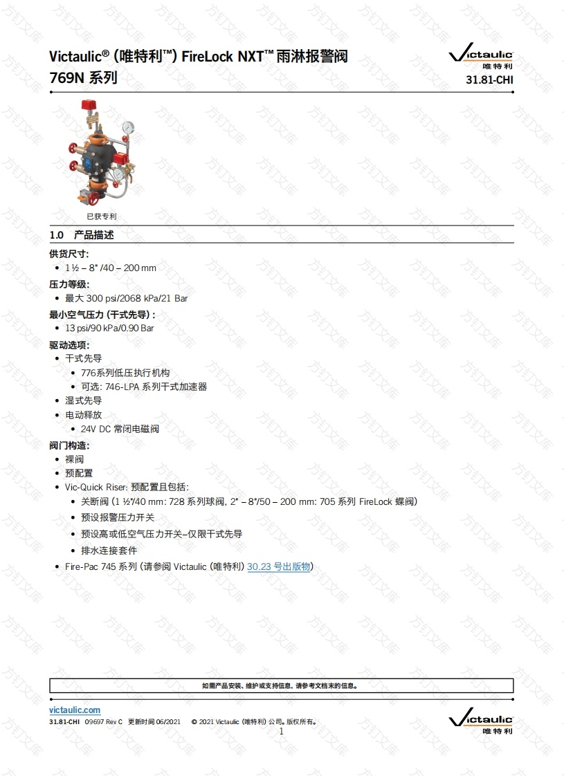 ctaulic唯特利769N系列31.81-CHl方方已获专利1.0产品描述方供货尺寸:·12-8/40-200mm压力等级:·最大300psi/2068kPa/21Bar最小空气压力(干式先导):.13 psi/90 kPa/0.90 Bar驱动选项:·干式先导·776系列低压执行机构·可选:746-LPA系列干式加速器·湿式先导·电动释放·24VDC常闭电磁阀阀门构造:·裸阀·预配置·Vic-Quick Riser:预配置且包括·关断阀(1140mm:728系列球阀,2"-8/50-200mm:705系列FireLock蝶阀)预设报警压力开关·预设高或低空气压力开关-仅限干式先导排水连接套件·Fire-Pac745系列(请参阅Victaulic(唯特利)30.23号出版物)万文如需产品安装、维护或支持信息,请参考文档末的信息。victaulic.com31.81-CH09697RevC更新时间06/2021ictaulic万唯特利库victaulic.com1.0产品描述(续)管道制备:·Victaulic(唯特利)传统沟槽系统应用价质:·仅用于消防系统。2.0认证/列表FMLPCB3.0规格-材料阀体:符合ASTM A-536之65-45-12等级要求的球墨铸铁。T阀瓣:铝钥UNS-C95500插销:铝钥UNS-C95500轴:不锈钢17-4阀瓣密封:过氧化物固化三元乙丙橡胶(EPDM),ASTM D.20O0衬套阀座0形密封圈:丁腈橡胶弹簧:不锈钢(300系列)隔膜:带结构补强件的过氧化物固化三元乙丙橡胶(EPDM)项目描述项目描述阀体盖板212盖板密封垫圈3阀密封13盖板螺栓4密封圈14插销5密封垫片15插销弹簧密封定位环16插销弹簧衬套和O形密封圈(2个)7密封装配螺栓17隔膜阀弹簧18隔膜盖9阀瓣轴19隔膜盖配有头螺钉(8个)1020插销轴库31.81-CHl09697RewC更新时间06/2021。2021 ictaulic(唯特利)公司。版权所有。ictaulicvictaulic.com2唯特利库victaulic.com3.0规格-材料(续)☐标准成套配件:气动干式先导释放776系列低压执行机构-776系列低压执行机构为气动型,不管系统供水压力如何,它只要求13ps/90kPa的最低空气压力。该执行机构允许系统以7psi48kPa的低压空气或其他低压气体运行。·液动湿式先导释放·电动释放·24VDC常闭电磁阀所需的管道短节和管件-标准镀锌表面处理所需的标准配管附件方·所需的压力表·755系列手动释放面板可选的成套配件:用于泡沫系统的非镀锌黑色配管如果阀门将要用于泡沫系统,根据NFPA要求,必须订购非镀锌黑色配管。请在订单上注明这一要求。订方方订方订更新时间06/2021。2021 ictaulic(唯特利)公司。版权所有。ctaulicvictaulic.com3唯特利库
