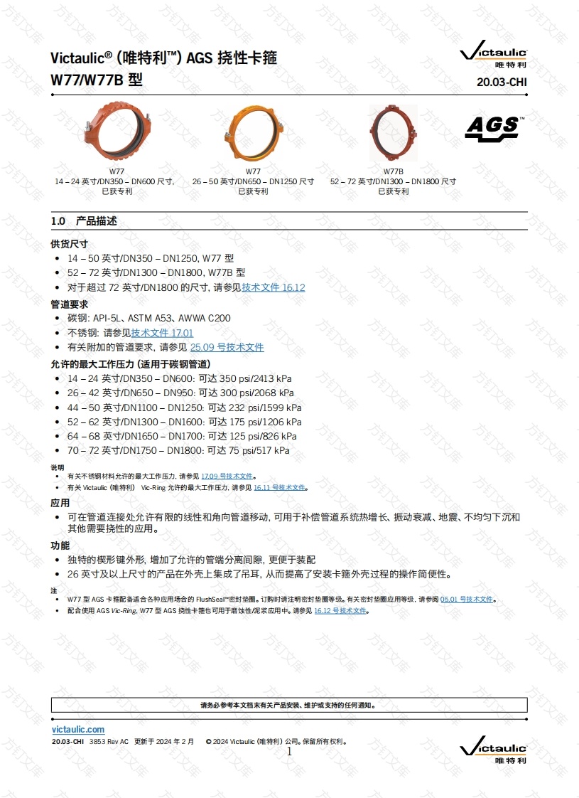 Victaulic®(唯特利")AGS挠性卡箍ictaulicW77W77B型万唯特利20.03-CHl方AGSW77B14-24英寸/DN350-DN600尺寸.26-50英寸/DN650-DN1250尺寸52-72英寸/DN1300-DN1800尺寸已获专利已获专利已获专利1.0产品描述供货尺寸·14-50英寸/DN350-DN1250,W77型·52-72英寸/DN1300-DN1800,W77B型·对于超过72英寸/DN1800的尺寸,请参见技术文件1612管道要求·碳钢:AP-5L、ASTM A53、AWWA C:200·不锈钢:请参见技术文件17.01·有关附加的管道要求,请参见25.09号技术文件方允许的最大工作压力(适用于碳钢管道)·14-24英寸/DN350-DN600:可达350psi/2413kPa·26-42英寸/DN650-DN950:可达300psi/2068kPa·44-50英寸/DN1100-DN1250:可达232psi/1599kPa·52-62英寸/DN1300-DN1600:可达175psi/1206kPa·64-68英寸/DN1650-DN1700:可达125psi/826kPa·70-72英寸/DN1750-DN1800:可达75psi/517kPa说明有关不锈钢材料允许的最大工作压力,请参见1Z09号技术文性。应用可在管道连接处允许有限的线性和角向管道移动,可用于补偿管道系统热增长、振动衰减、地震、不均匀下沉和其他需要挠性的应用。功能·独特的楔形键外形,增加了允许的管端分离间隙,更便于装配26英寸及以上尺寸的产品在外壳上集成了吊耳,从而提高了安装卡箍外壳过程的操作简便性。注W77型AGS卡箍配备适合各种应用场合的FlushSeal广密封垫圈。订购时请注明密封垫圈等级。有关密封垫圈应用等级,请参阅O5.01号技术文性。配合使用AGS Vic-Rig,W77型AGS烧性卡箍也可用于磨蚀性泥浆应用中。请参见16.12号技术文性。万文请务必参考本文档末有关产品安装、维护或支持的任何通知。victaulic.com20.03-CHl3853 Rev AC更新于2024年2月ctaulic唯特利victaulic.com2.0认证/列名标准W.WRASWRASEN10311BS EN 10311CPR(EUCPR (UKa.30520112019N.46514英寸(DN350)至24英寸(DN650)尺寸具有UL和FM认证.但尺寸377mm、426mm、480mm、530mm和630mm除外。如需消防认证例名参考指南,请参阅10.01号技术这性WRAS材料认证仅适用于尺寸不超过50英寸(DN125O)的EW级三元乙丙橡胶(EPDM)密封垫圈与壁厚10的碳钢管(威更厚)和EW级三元乙丙橡胶(EPDM)密封垫圈一起使用时(碳钢管必须有合适的涂层威村里,以确保用水安全)WRAS产品认证适用于尺寸DN350-DN600。WRAS产品认证适用于地上和星地使用。WRAS产品认证不适用于W77B型卡箍。3.0规格-材料壳体:(请指定选择)☐标准:符合ASTM A536之65-45-12等级要求的球墨铸铁。☐可选:符合ASTM A395之65-45-15等级要求的球墨铸铁。壳体涂层:(请指定选择)口标准:橙色瓷漆。口可选:热浸镀锌及其他。☐可选:符合AWWA C210的液态环氧树脂。卡箍密封垫圈:(请指定选择)“E"级FlushSeal""三元乙丙橡胶(EPDM)三元乙丙橡胶(EPDM)(绿色条纹色码)。温度范围:-30℉至+230℉/-34℃至+110°℃。适用于规定温度范围内的热水系统,以及应用。已获得U儿认证,符合ANSINSF61标准,适用于+73F/+23C冷饮用水和+180℉/+82℃热饮用水系统,符合ANS/NSF372标准。不支特石油或蒸汽应用。“T"级FlushSeal"丁腈橡胶丁腈橡胶(橙色色码)。温度范围:-20℉至+180℉/-29°℃至+82C。可指定用于与油相关的系统,包括含油蒸汽的空气,该垫圈可在高达+180°F/+82℃的环境温度下使用。对于与水相关的系统,该垫圈的额定温度可高达+150℉466℃。对于无油、干燥的空气环境,该垫圈的额定温度最高可达+140℉/+60°℃。不推荐用于热水或蒸汽应用。“L”级FlushSeal"硅橡胶硅橡胶(红色色码)。温度范围:-30℉至+350°F/-34℃至+177℃。可指定用于温度高达+350℉/+177℃、不含碳氢化合物的干燥热空气和某些特定的化工应用场合。“EW"级FlushSeal'"三元乙丙橡胶(EPDM)三元乙丙橡胶(EPDM)(绿色W色码)。温度范围-30℉至+230°F/-34℃至+110°C。适用于规定温度范围内的热水系统,以及多种稀酸、无油空气和众多化工应用。符合BS6920标准的WRAS认证材料,适用于冷饮用水服务(+73°F/23℃)。已取得UL认证,适合用于+73F/+23C冷饮用水(根据ANSI/NSF61)和+180F/+82℃热饮用水(根据ANSI/NSF372)的应用场合。不适用于石油应用场合。其他如需密封垫圈的替代选择,请参阅Q5.01号技术文件:Victaulic(唯特利)密封垫圈选用指南-弹性橡胶密封结构。列出的应用场合仅作为一般应用场合指南。必须注意在某些应用场合中,这些密封垫圈可能不兼容。请务必参考最新的ct妇uc(唯特利)密封材料选用指南获取具体密封垫圈应用规范和不兼容应用的清单。20.03-CHI 3853 Rev AC更新于2024年2月。2024 Victaulic(维特利)公司。保留所有权利。victaulic.comctaulic唯特利victaulic.com3.0规格-材料(续)螺栓螺母:(请指定选择2)标准:碳钢椭圆颈轨道螺栓,符合ASTM A449(英制)和IS08981 Class9.8(M10-M16)Class8.8(M20及以上)的机械性能要求,52-72英寸尺寸使用A193B7级螺栓。碳钢六角螺母,符合ASTM A563之等级B(英制-重型六角螺母)和ASTM A563 M Class9(公制-六角螺母)的机械性能要求。轨道螺栓和六角螺可选(14-50英寸):不锈钢椭圆颈轨道螺栓或双头螺栓,符合ASTM A193 Grade B8M,Class2(316不锈钢)所规定的机械性能要求。不锈钢重型六角螺母,符合ASTM A194 Grade8M(316不锈钢)所规定的机械性能要求,带耐磨涂层。☐可选(所有尺寸):超级双相不锈钢螺栓,符合ASTM A1082UNS32750标准。超级双相不锈钢重型六角螺母,符合ASTM A1082UNS32750标准。2螺栓/螺母选件仅提供英制尺寸用于26-72英寸/DN650-DN1800尺寸的垫片:☐标准:镀锌碳钢,扁平。符合ASTM F436的SAE高强度或加强不锈钢。可选(14-50英寸):高强度316不锈钢可选(所有尺寸):超级双相不锈钢对于未列出的替代硬件规格.请联系c妇uc(特利)对于52英寸及更