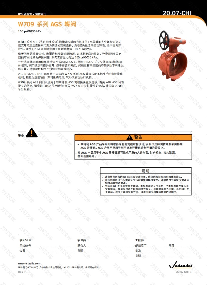 20.07-CHlW709系列AGS蝶阀150 psi/1035 kPaW709系列AGS(先进沟槽系统)沟槽端头蝶阀为您提供了比笨重的多个螺栓对夹式或支耳式法兰连接阀门更为简便的安装迭择。该阀提供极佳的流动特性,操作扭矩却较小。弹性EPDM阀座额定用于最高温度达+180F482C。偏置阀板是球墨铸铁,涂覆熔结环氧树脂涂层,以提高耐腐蚀性能。不锈钢阀座固定器能牢固地贴合弹性阀座,双向工作压力高达150psi1035kPa。一件式阀体为耐用球墨铸铁转件(ASTM A536,等级65.45-12),窄薄阀板材料与阀体相同。阀门铸造有提升支耳,便于安装和搬运。阀板支撑于坚固的不锈钢上下阀杆上所有其它过流部件均为不锈钢或铝青铜结构。方26-48"650.1200mm尺寸规格的W709系列AGS蛛阀按配备标准手轮齿轮操作机构。链轮为迭购项目,亦可迭购电动、气动或液动执行机构。W709系列AGS阀门设计用于与唯特利AGS沟槽接头直接连接。有关WO7AGS刚性接头的信息,请索取20.02号出版物:有关W77AGS挠性接头的信息,请素取20.03号出版物。方订万文警告A警告·唯特利AGS产品采用即将取得专利的沟槽结构设计,而制作这种沟槽需要采用特殊AGS开槽辊。AGS产品不得用于利用标准开槽辊滚制开槽的管道上。将AGS产品用于非AGS开槽管道可造成严重的人身伤害、财产损失、接头泄漏,甚至连接断开。说明请勿将带闷板的闷门安装在全开位置。确保阀板没有超出闷体的嘴头。唯特利蝶阀仅与沟槽喘头NPS碳钢管道配合使用。请勿使用平端NPS管道或沟槽球墨铸铁管道。为防止阀门在系统中发生转动。唯特利建议至少采用一个唯特利刚性接头案安装蝶阀。如果采用两个唯特利挠性接头,可能需要额外支撑,以防闷门发生转动。有关正确的安装方法。请参阅接头和蝶阀随附的说明书。万万项目/业主承包商工程师系统编号提交人规范章节段落位置日期日期www.victaulic.comictaulicREV_F20.07-CHl_120.07-CHlW709系列AGS蝶阀150 psi/1035 kPa材料规格阀体:符合ASTM A-536,等级65-45-12要求的球墨铸铁,涂覆熔结环氧树脂涂层。阀板:符合ASTM A-536,等级65-4512的球墨铸铁.涂覆熔结环氧树脂涂层。阀座:300系列不锈钢·E级三元乙丙橡胶(EPDM)三元乙丙橡胶(绿色色码)。温度范围-20°F至180℉/-29℃至82°C。推荐用于规定温度范围内的冷热水系统,以及多种稀酸、无油空气及众多化工应用场合。不推荐用于石油应用场合。所列用途仅为一般应用建议。应注意,密封國存在某些不推荐使用的应用场合。有关特定垫國应用建议以及不推荐应用场合列表,请参考最新的《唯特利密封垫國迭用指南》。阀杆-上/下:400系列不锈钢轴承:铝青铜推力垫片:青铜阀杆密封:EPDM密封圈定位分段环:300系列不锈钢密封定位螺钉:300系列不锈钢方订方订万文万文唯特利保留不经通告改变产品规格.设计和标准设备的权利,且不对此承妇任何责任或义务。www.victaulic.com20.07-CHl2万万REV_F20.07-CHlW709系列AGS蝶阀150 psi/1035 kPa尺寸文压力P0G029251588590.0690748.02161.0980.0315301430.0888730021450流量特性流量数据0.10.011000100001000001000000流率-加仑分www.victaulic.comREV_F20.07-CH3