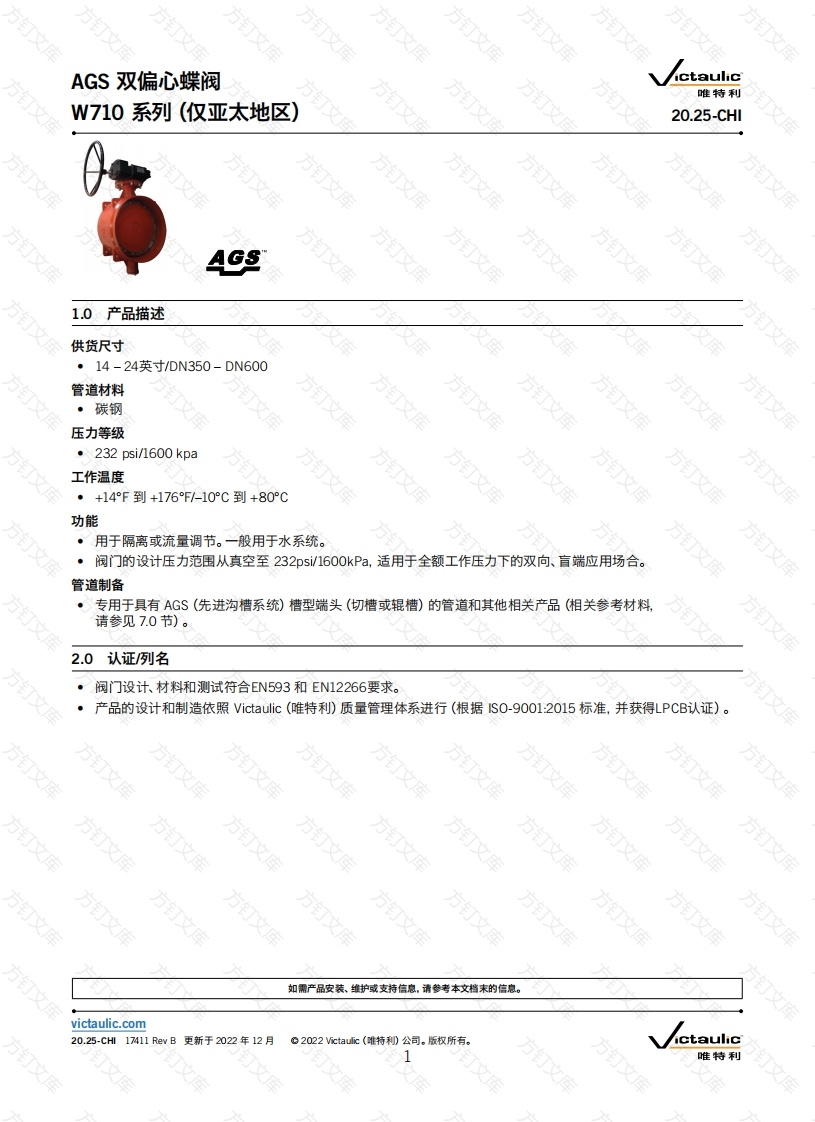 AGS双偏心蝶阀ctaulic万文万唯特利W710系列(仅亚太地区)20.25-CHlAGS1.0产品描述供货尺寸T·14-24英寸/DN350-DN600管道材料·碳钢压力等级·232psi/1600kpa工作温度万文文·+14°F到+176F/-10°C到+80°C功能·用于隔离或流量调节。一般用于水系统。阀门的设计压力范围从真空至232psi/1600kPa,适用于全额工作压力下的双向、盲端应用场合。管道制备·专用于具有AGS(先进沟槽系统)槽型端头(切槽或辊槽)的管道和其他相关产品(相关参考材料,请参见7.0节)。2.0认证/列名阀门设计、材料和测试符合EN593和EN12266要求。产品的设计和制造依照Victaulic(唯特利)质量管理体系进行(根据IS0-90012015标准,并获得LPCB认证)。方方万文如需产品安装、维护或支持信息,请参考本文档末的信息victaulic.com20.25-CH17411ReB更新于2022年12月ctaulic唯特利库victaulic.com3.0规格-材料阀体:符合ASTM A-536之65-45-12等级要求的球墨铸铁,带熔结环氧树脂涂层。阀板:符合ASTM A-536之65-45-12等级要求的球墨铸铁,带熔结环氧树脂涂层。阀板/密封材料:三元乙丙橡胶(EPDM)温度范围+14F到+176℉-10℃到+80°C.推荐用于规定温度范围内的冷热水系统。不推荐用于石油相关的应用场合。轴承:铝青铜阀杆密封材料:三元乙丙橡胶(EPDM)密封固定螺钉:符合ASTM A:276要求的304不锈钢阀杆:符合ASTM A276要求的420不锈钢阀体密封材料:符合ASTM A276要求的304不锈钢定位器:符合ASTM A276要求的304不锈钢O形密封圈:三元乙丙橡胶(EPDM螺栓:符合ASTM A276要求的304不锈钢文万20.25-CHl17411ReB更新于2022年12月ctaulicvictaulic.com唯特利victaulic.com4.0尺寸W710系列方管径尺寸重量A际外端面至大约1s05211公称径压力端面BDMKXY每个)法兰英寸用于安装执行机构1414.00232115018.8811.5011.500.750.75213.0F14DN35035616002914792932901896.61484323211.5018.8811.5011.5015.1313500.75216.0F14377.016002914792932903831616.000232122523.63128813.5017.13DN400160059932643498.015.381381.38326.0406431034039033147.9F1416.772232122523.6312.8813.0017.130886.7515.38138138330.0426.01600310599326330434170390149.7F141818.00023227.2514.0014.6319.1322.00440.0DN450457.2160033069135637048449199.6F1418.89823213.00272514.0014.6319.130887.1317.132.002.00444.0480.01600330691356370484211814354949201.4F142020.00023213.88285.50212508819.002.502.50539.0DN500508.01600351173944105382148063632445F1620.866232138828.25155016.25250887.1319.002.502.50542.0530.016003517173944105382118148063632458F162222.000232138829.2516.5017.7523.257.1319.753.503.50639.0DN550558816003517434174515902118150188882898F162424.000232153830.2518.0019.0025.139.1322.13.753.757220609.61600390766458480637242315609393327.5F2524.80323215.38302518.0019.0025.131.009.1322.133.75725.0630.01600390766458480637242315609393F25328.920.25-CHl17411RewB更新于2022年12月ctaulicvictaulic.com唯特利