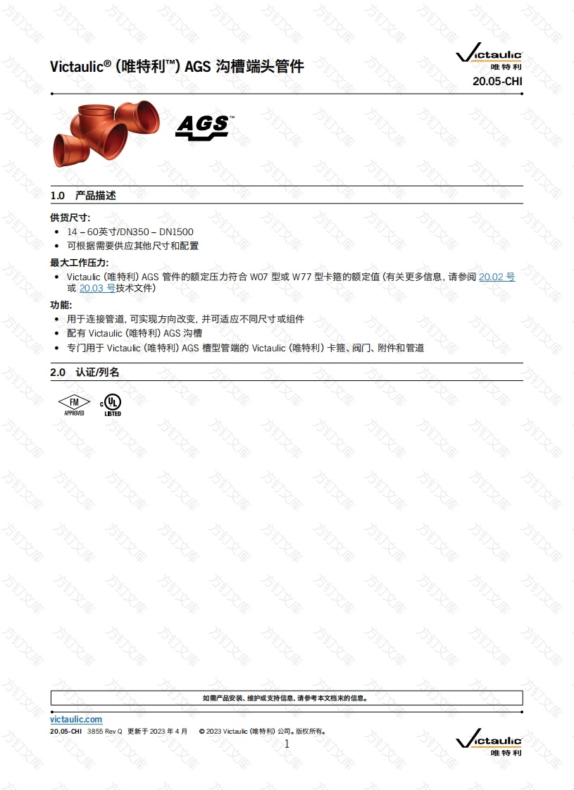 Victaulic®(唯特利)AGS沟槽端头管件万文唯特利20.05-CHl41.0产品描述供货尺寸:·14-60英寸/DN350-DN1500可根据需要供应其他尺寸和配置最大工作压力:·Victaulic(唯特利)AGS管件的额定压力符合WO7型或W77型卡箍的额定值(有关更多信息,请参阅20.02号或20.03号技术文件)功能:·用于连接管道,可实现方向改变,并可适应不同尺寸或组件配有Victaulic(唯特利)AGS沟槽专门用于Victaulic(唯特利)AGS槽型管端的Victaulic(唯特利)卡箍、阀门、附件和管道2.0万如需产品安装、维护或支持信息,请参考本文档末的信息。victaulic.com20.05-CHl3855RevQ更新于2023年4月1万ctaulic唯特利库victaulic.com3.0规格-材料铸铁管件:符合ASTM AS536之65-45-12等级要求的球墨铸铁。根据特殊要求,可提供符合ASTM A395、65-45-15等级要求的球墨铸铁。分段焊接管件:采用符合ASTM A53,Type E或S,Grade B或API-5L、PSL1或PSL2标准的碳钢管制造。短节:符合ASTM A53,Type E或S,(Grade B或AP5L、FPSL1或PSL2标准的碳钢管。法兰短节:法兰:ASME/ANSI B16.5凸面碳钢滑动法兰。库短节:符合ASTM A53,Type E或S,Grade B或API-5L、PSL1或PSL2标准的碳钢管。管件涂层:(请指定选择)口标准:橙色瓷漆。口可选:热浸镀锌(ASTM A153)及其他。液体环氧树脂(AWWA C21O)。熔融粘结环氧树脂(AWWA C213)口可选:可提供其他涂层,有关详细信息,请与Victaulic(唯特利)联系。法兰短节涂层:口无(无表面处理)口可选:橙色瓷漆。口可选:热浸镀锌及其他。管件内衬:(请指定选择)橙色瓷漆口可选:热浸镀锌(ASTM A153)液体环氧树脂(AWWA C21O)口可选:FBE(AWWA C213)可选:可根据要求提供其他内衬。有关详细信息,请与Victaulic(唯特利)联系。方万文20.05-CHI 3855 Rev Q更新于2023年4月victaulic.comctaulic唯特利victaulic.com4.0尺寸弯头和三通W10号90°弯头W11号45°弯头(球墨铸铁)1W12号22°弯头W13号11°弯头方(分段焊接钢)W12号W13号W10号W11号W12号W13号管径90°弯头45°弯头22°弯头()11弯头(s)实际公称外中心线至中心线大约中心线至中心线至大约单重至端面距离单重端面距离单重英寸英寸英寸英寸D米毫米千克毫米毫米毫米1414.00014.00150.85.8063.05.0046.03.5032.0DN350355.6355.668.414728.712720.98914.8431484157.76.1574.7377.037771515633.91616.00016.0018436.635.0052.14.0042.0DN400406.4406.483.616812723.610219.116.77216.77201.66.95426.042691517743.71818.00018.00272.37.46129.05.5065.04.5053.2DN450457.0457.2123.518958.514029.511424.1库18.89818.90279.0132.7480.0480126.619960.22020.00020.00312.0828165.36.0078.65.0065.0DN500508.0508.0141.521075.015236.012729.52424.00024.00559.89.94264.57.00110.36.0094.5610.0609.6253.9252120.017850.015242.92626.0006.75122.05.0092.0DN650660.4171.555341.728.0007.00136.05.25104.0DN700711.2177.8616133.447.13030.0007.25151.05.25112.0DN750762.0184.268.4133.45083232.000750167.05.50124.08128190.575.7139.73636.0007.75194.05.50140.0196.987.9139.763.54040.0008.75322.06.25234.01016.0146.1158.8106.14242.0009.00348.0625246.0DN105010668228.61578158.8111.546.000925392.06.50280.0DN11501168.4235.0177.8165.1127.14848.0009.50420.06.80303.0DN12001219.22413190.5172.7137.45454.00012.00592.0437.0DN13501371.63048268.5222319825656.00012.25627.09.00465.0DN14001422.4311.2284.4228.6210.16060.00012.75698.0925512.0DN15001524.0323.9316.6235.0232.220.05-CH3855RevQ更新于2023年4月victaulic.comctaulic唯特利